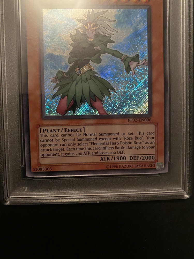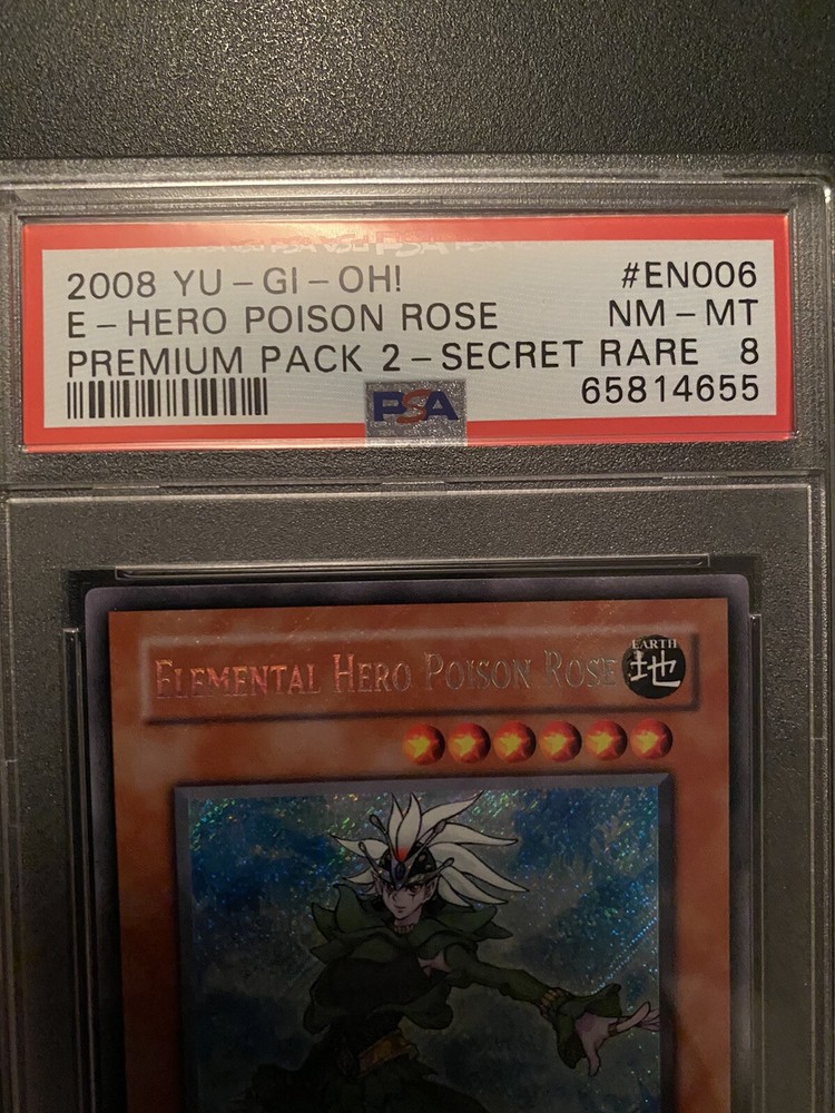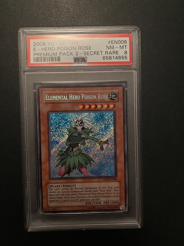 This PSA 8 Elemental Hero Poison Rose is a stunning Secret Rare variant with a low population—perfect for collectors! The card is in fantastic NM-MT condition, exactly as shown, and priced competitively. Seller is reliable, offering more great PSA-graded cards from their collection. Photos are accurate, so check them carefully—no returns! A must-have for serious Yu-Gi-Oh! enthusiasts.