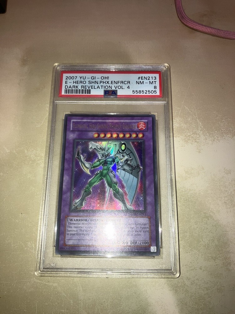 This Yu-Gi-Oh! card is a rare find for collectors and players alike. The Elemental Hero Shining Phoenix Enforcer, from the Dark Revelations 4 set, is an Ultra Rare card that is sure to impress. With its English language and flawless PSA 8 grading, this card is a must-have for any serious Yu-Gi-Oh! player or collector. Manufactured by Konami, this card is a powerful addition to any deck and is sure to give players an edge in battle. Its rarity and high grading make it a coveted item for those who are looking to expand their collection or improve their gameplay. Don't miss out on the opportunity to own this impressive card.