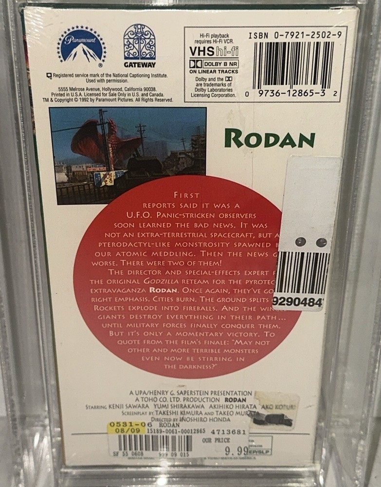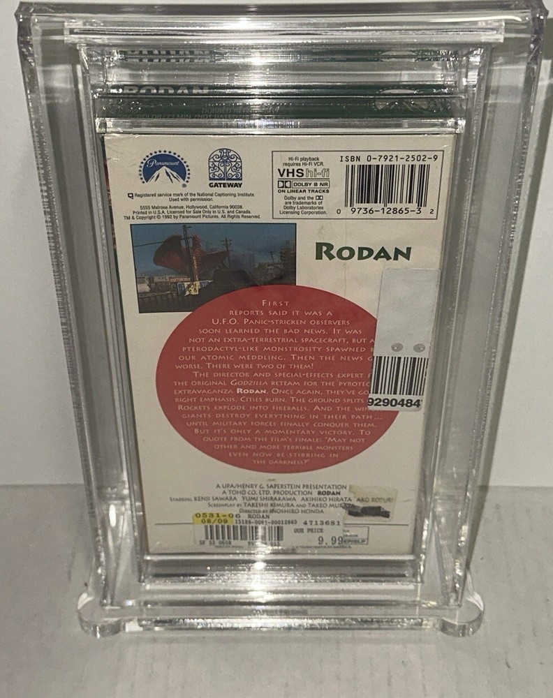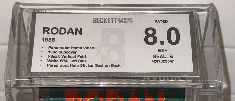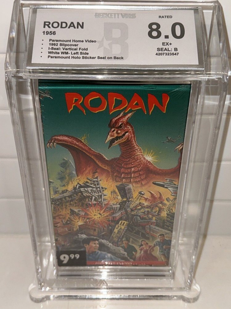 Paramount Pictures Present 1956 Rodan Colored 73 Minutes VHS Tape. BECKETT VHS GRADED: 8.0 / SEAL: B Paramount Home Video 1992 slipcover i-seal: vertical fold White water Marks Left Side! Holo Sticker on Back. Same Movie as in the photo! Please See my other VHS items. Shipped with tracking with USPS.