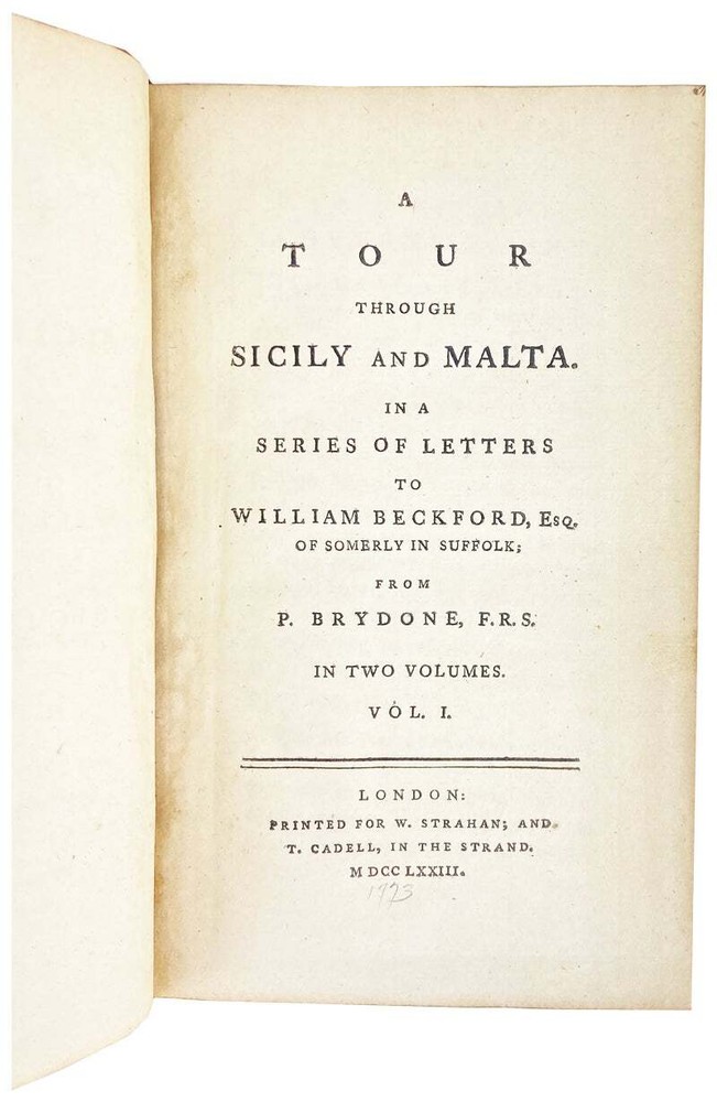 A Tour Through Sicily and Malta. In a series of letters to William Beckford, Esq. of Somerly in Suffolk [Two Volume Set] Author: Patrick Brydone Title: A Tour Through Sicily and Malta. In a series of letters to William Beckford, Esq. of Somerly in Suffolk [Two Volume Set] Publication: London: W. Strahan; and T. Cadell, 1773 Description: Very Good. London: Printed for W. Strahan; and T. Cadell, in the Strand, 1773. First Edition. Two volumes (21cm.); full contemporary speckled calf, green and red gilt spine labels; [12],374; [8],287pp. (collated complete with half titles); folding engraved map frontispiece of Sicily and Malta at head of Vol. I. Leather rather scuffed and dried, front joint of Vol. I quite tender and starting to separate along top half of spine edge, flaking of leather to both volumes, light foxing to early leaves, else a Very Good set, internally fresh and sound, issued with the elusive map. Contemporary armorial ex libris of Thos. Smyth to both pastedowns as well as a manuscript note at the end of the Advertisement in Vol. I: "Several citations from Latin authors that were intended for Notes have been inserted in the text by mistake." A highly popular and oft-reprinted account of the author's travels, the "Liveliness of description of manners and scenery, couched in an easy and elegant style, has rendered these volumes extremely popular" (Cox). Fanny Burney was a fan, James Boswell less so. COX I, p. 142; ESTC T144542. Seller ID: 31014 Subject: 18th Century, European History, Italy / Italian Writers, Maps / Cartography / Geography, Travel / Exploration Capitol Hill Books is a used bookstore located on historic Capitol Hill in Washington DC, with three floors of quality used books, first editions, and rare books. [Note: Our online inventory is stored and managed at a separate location from at our brick and mortar shop. If you have a question about an item listed online, please send a direct message here rather than calling the store so that we can make sure someone familiar with the item in question can respond.] Terms Books described only as First Editions are First Printings unless otherwise specified. All items are guaranteed to be as described or they may be returned within 30 days of receipt for a full refund. All orders ship within two business days. Standard mail is USPS Media Mail. Expedited and international shipping are also available (please contact for estimates). We offer combined shipping on multiple orders. This listing was created by Bibliopolis.
