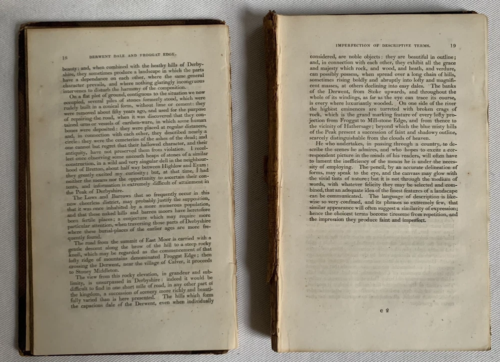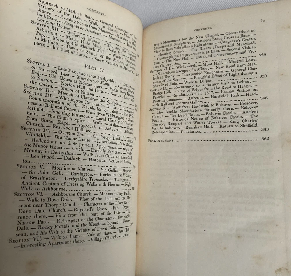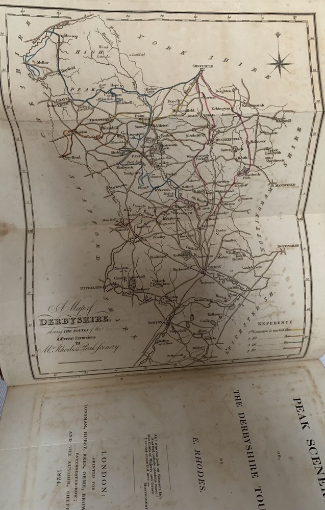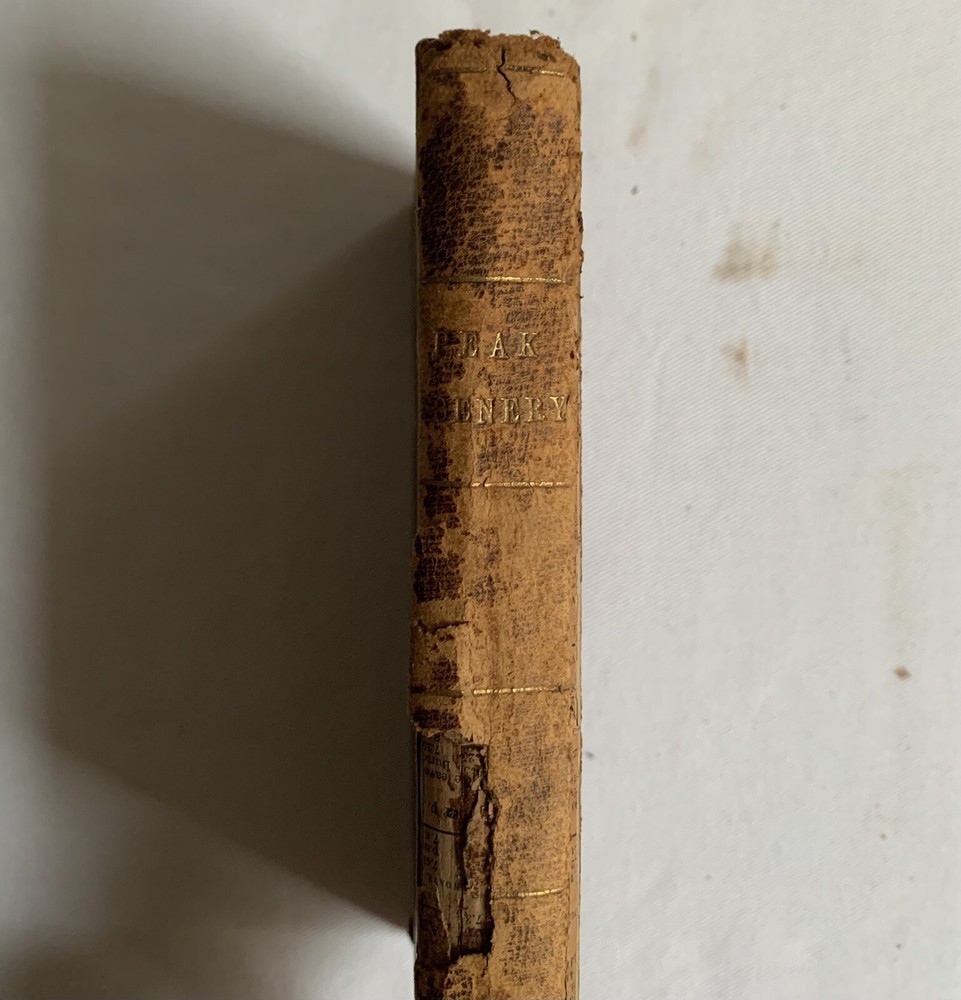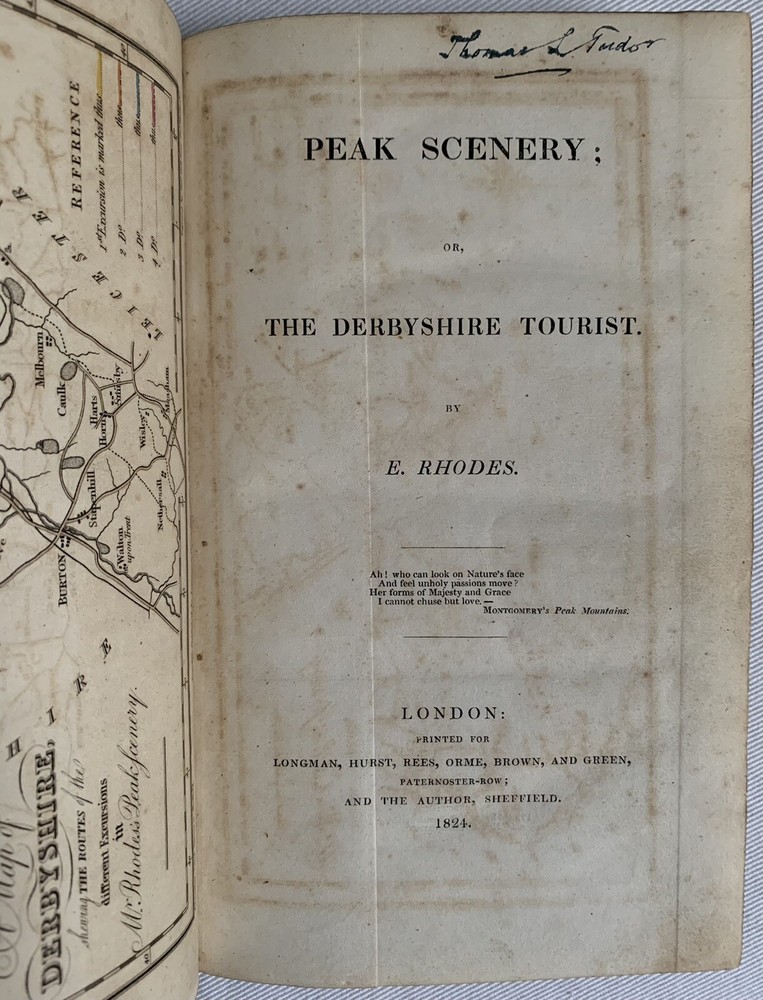 Peak Scenery or The Derbyshire Tourist, 1824, Ebenezer Rhodes, London, Longman, Hurst, Rees, Orme, Brown and Green and the Author, Sheffield, 8vo, 379pp. 7 road maps and 1 folding map, hand colored. A scarce volume, this much admired tour of England's Peak District is in need of some love and attention. The binding is defective, front cover and several pages detached from binding and spine chipped with loss and damaged. The remaining text block is holding firm however and the pages are generally clean throughout. Carries the signature of Thomas Linthwaite Tudor (1863-1941), the local history and travel writer probably best known for 'The High Peak to Sherwood, the Hills and Dales of Old Mercia' (1926) and 'Derbyshire' (1950). Despite all faults, a fascinating compendium of history and travel with nice provenance that would make an excellent candidate for a sympathetic rebind.