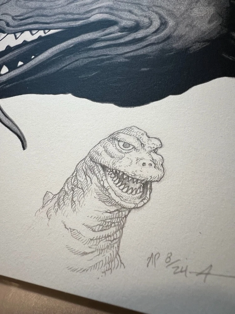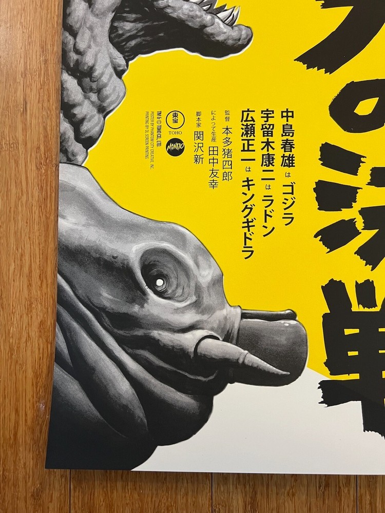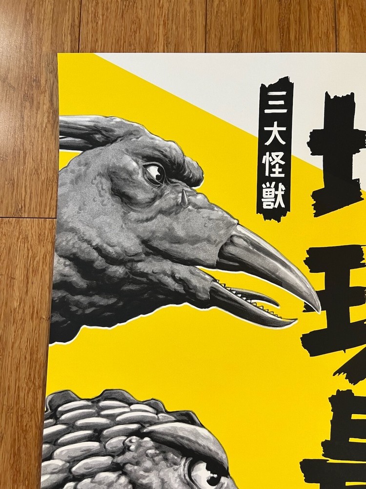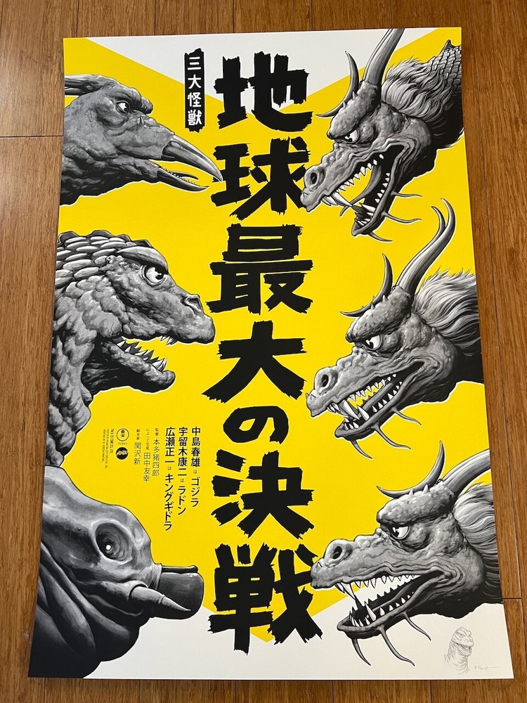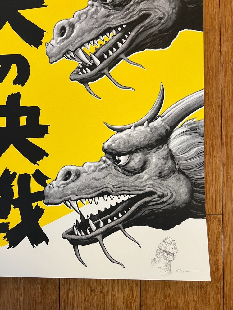 Up for sale is a screen printed poster for the movie Ghidorah, The Three-Headed Monster by Mondo and Alamo Drafthouse artist Justin Erickson, AKA Phantom City Creative . This is an Artist Proof variant edition was released in 2020. The features a hand-drawn illustration of Godzilla in the lower-right corner, measures 24" x 36" and is signed and numbered by Erickson out of an edition of only 24! It will make an excellent companion to other PCC posters, including The Burning, Sleepaweay Camp, and Halloween. The print has been stored flat in a smoke-free home since receipt and is in excellent condition. I am an experienced shipper, know how to properly pack a poster and only use thick, quality tubes.