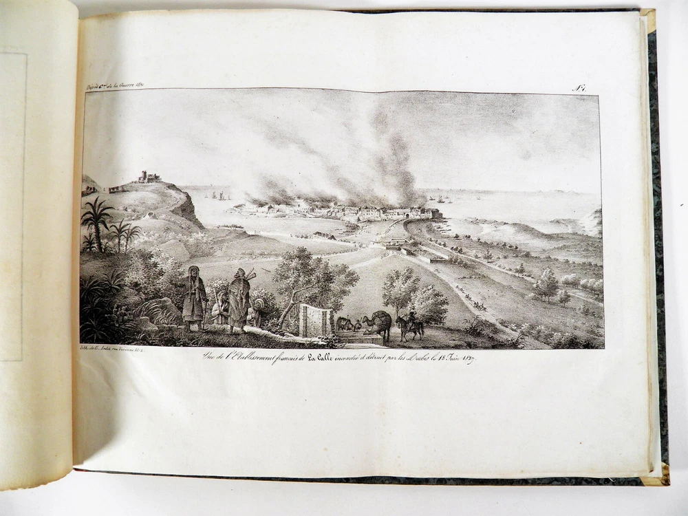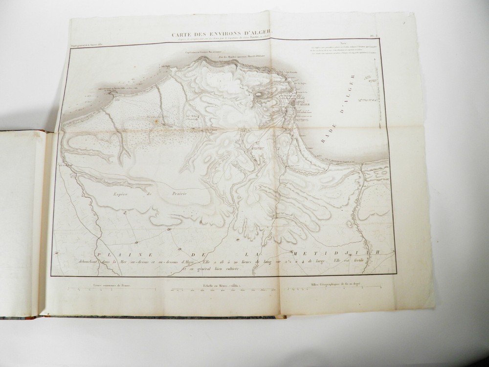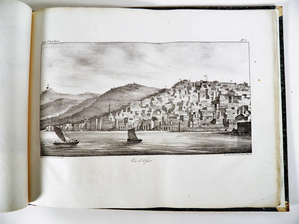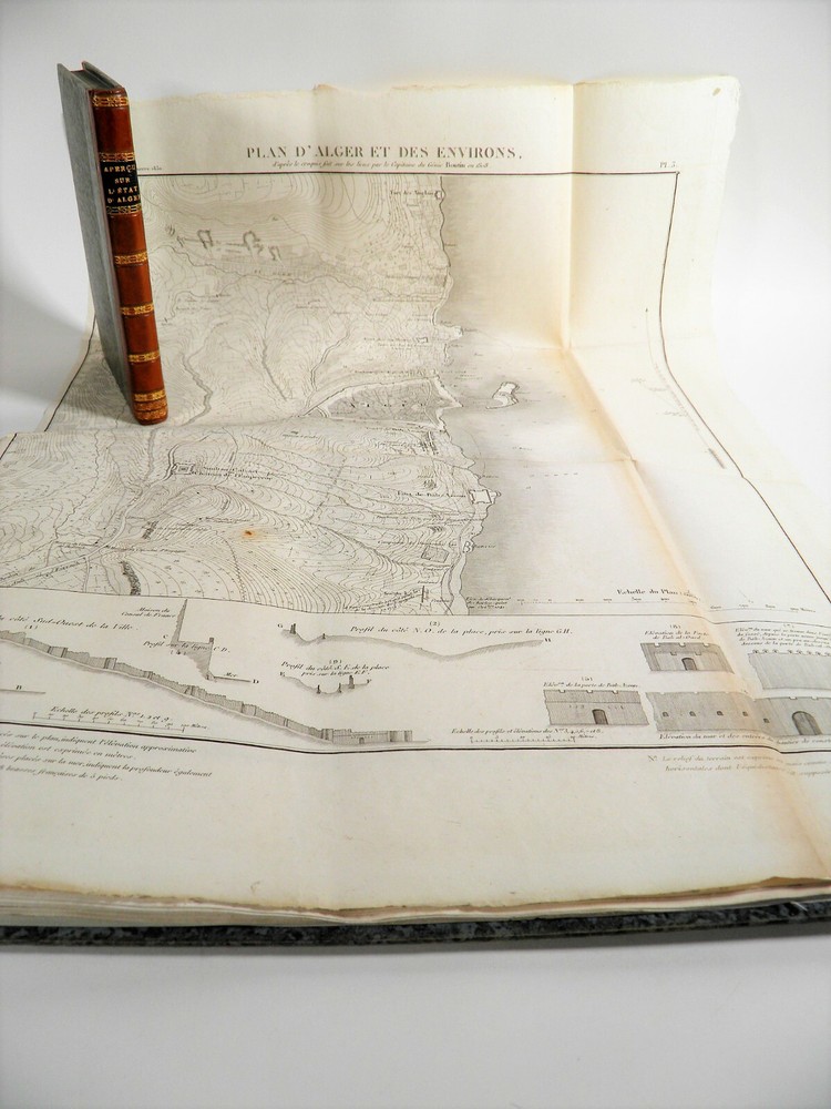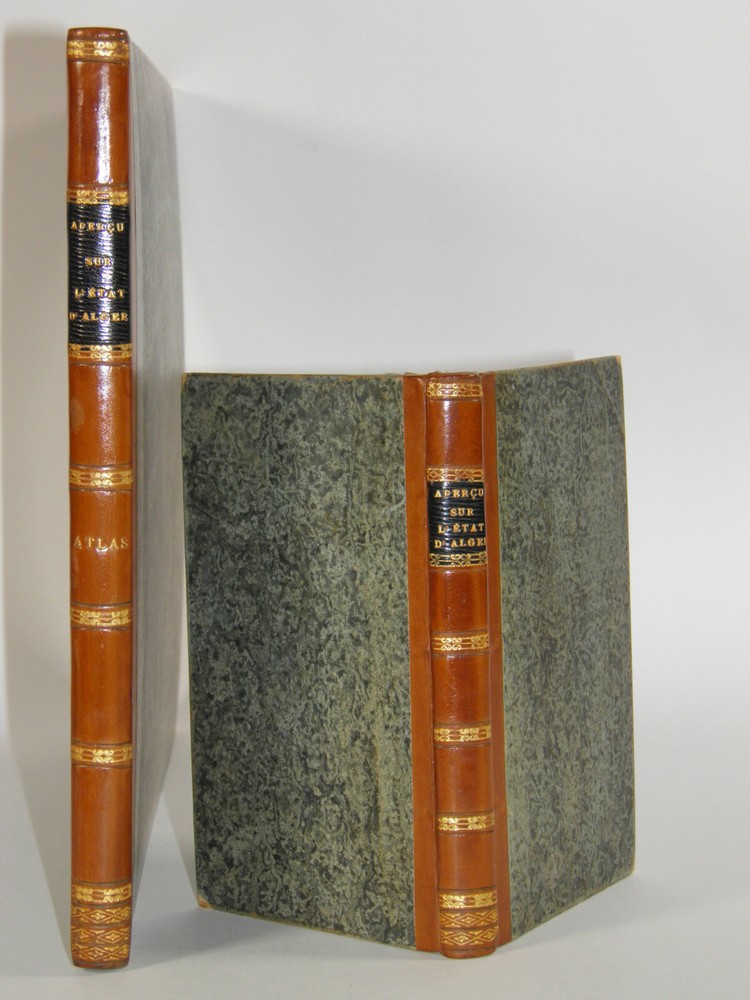 Please consult the conditions of sale at the end of the description before purchasing. ANONYMOUS [PIQUET, Charles; BOUTIN, Vincent-Yves Captain]. Historical, statistical and topographical overview of the State of Algiers, for the use of the African Expeditionary Army. Paris, Ch. Picket, 1830. Text + Atlas, complete. In-12, 10.5 x 17.5 cm (text); Oblong folio, 36 x 28 cm. Pastiche posterior binding in half fawn calfskin and cream vellum corners , smooth spine decorated with cold fillets and gilded wheels, title label in black morocco, edges of the text volume marbled. viii, 238 pp. ; 21 pl. (atlas). Second edition, published the same year as the original. “The first edition of this Overview was sent to the African Expeditionary Army. We will find, at the end of it, some new plans, and, in the text or in the appendix, some additions that new research has enabled us to present to the reader. The atlas contains 7 engraved maps or plans, including 6 leaflets (2 established according to Captain Boutin's surveys) and 14 lithographed plates , including several from the collection of Colonel Rottiers representing views and costumes, all mounted on tabs. “Work published by the General War Depot for the use of the African expeditionary army, which left the port of Toulon on May 25, 1830, heading for Algiers. It was written by the geographer Charles Piquet, largely based on the report of Captain Boutin, sent on a spy mission in 1808 to the regency of Algiers. Gay, 852 and 873; Tailliart, 1455. Ex-dono JJL from Querelles on the first card. Title page of the atlas missing, some rare foxing on the plates which also include, for some, old restorations linked to discreet tears, otherwise beautiful copy, the most complete we have found. ___ Bookstore L’Art et la Manner 19 Route de Pithiviers 45300 BOYNES France Member of SLAM and LILA ( National Union of Ancient and Modern Bookstores / International League of Old Booksellers) ILAB (International League of Antiquarian Booksellers) English spoken Please don't hesitate to contact us if you have any inquiry The greatest care is taken in the description of the works, however, unintentional errors may be made. Do not hesitate to inform us, including after receipt of your purchase. Regarding shipping: The choice is yours! So that you can benefit from the best services and the most advantageous quality/price ratio, the bookstore offers you: Hand delivery by appointment, in Boynes, near Pithiviers, or in Paris on Saturday mornings or during old book fairs. Sending by the Post Office : by letter for folds less than 3 cm thick (packaging included) or by colissimo. Deposit in Relay Point . The bookstore practices group shipments . If you make multiple purchases in our store, u A new claim for payment with adjusted postage costs will be sent to you within a maximum period of 24 hours . THE insurance is optional (option not available for Relay Point shipments). For shipments to Overseas , please contact us beforehand to find out the exact amount of postal costs. Although packaging costs are offered, packages are reinforced and prepared with great care. The Librairie l'Art et la Manière is always on the lookout for rare and old works, to purchase individually or in batches. We travel primarily in Loiret (45), Paris (75) and the south of Ile-de-France (91, 77, 78, 92, 94) as well as in Yonne (89) and Eure-et-Loir (28). If you would like to sell some, do not hesitate to contact us. Just type “Librairie l’Art et la Manière” into your favorite search engine! Second edition, published the same year as the original. “The first edition of this Overview was sent to the African Expeditionary Army. We will find, at the end of it, some new plans, and, in the text or in the appendix, some additions that new research has enabled us to present to the reader. “Work published by the General War Depot for the use of the African expeditionary army, which left the port of Toulon on May 25, 1830, heading for Algiers. It was written by the geographer Charles Piquet, largely based on the report of Captain Boutin, sent on a spy mission in 1808 to the regency of Algiers. The Librairie l'Art et la Manière is always on the lookout for rare and old works, to purchase individually or in batches. We travel primarily in Loiret (45), Paris (75) and the south of Ile-de