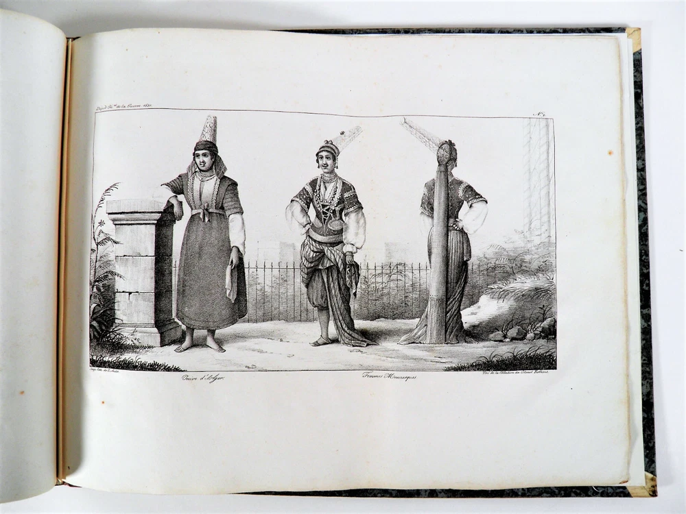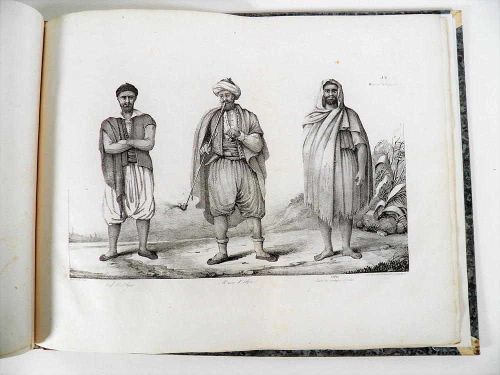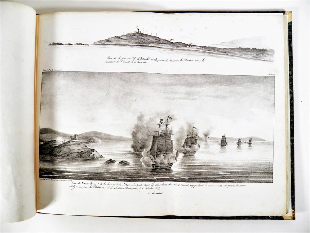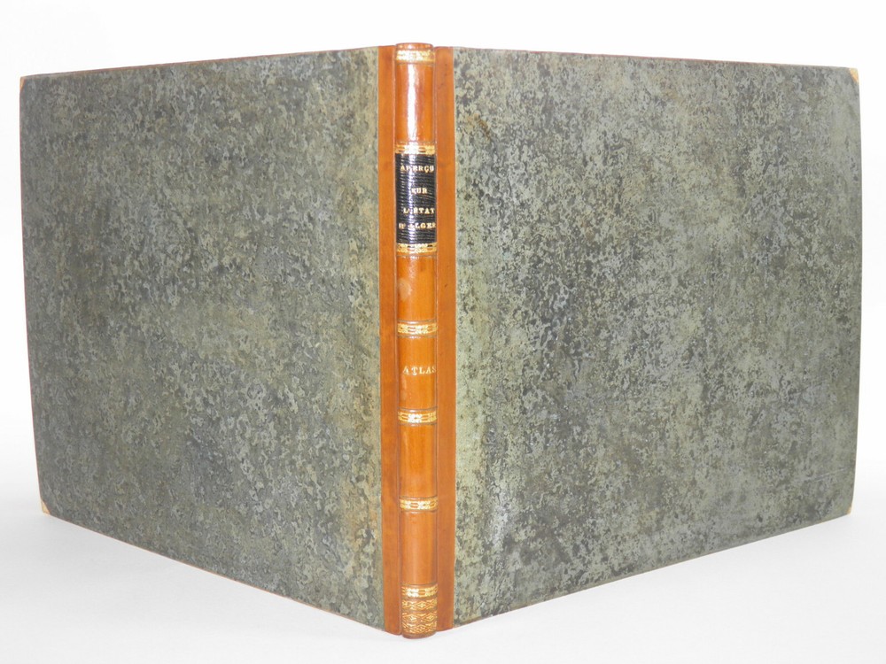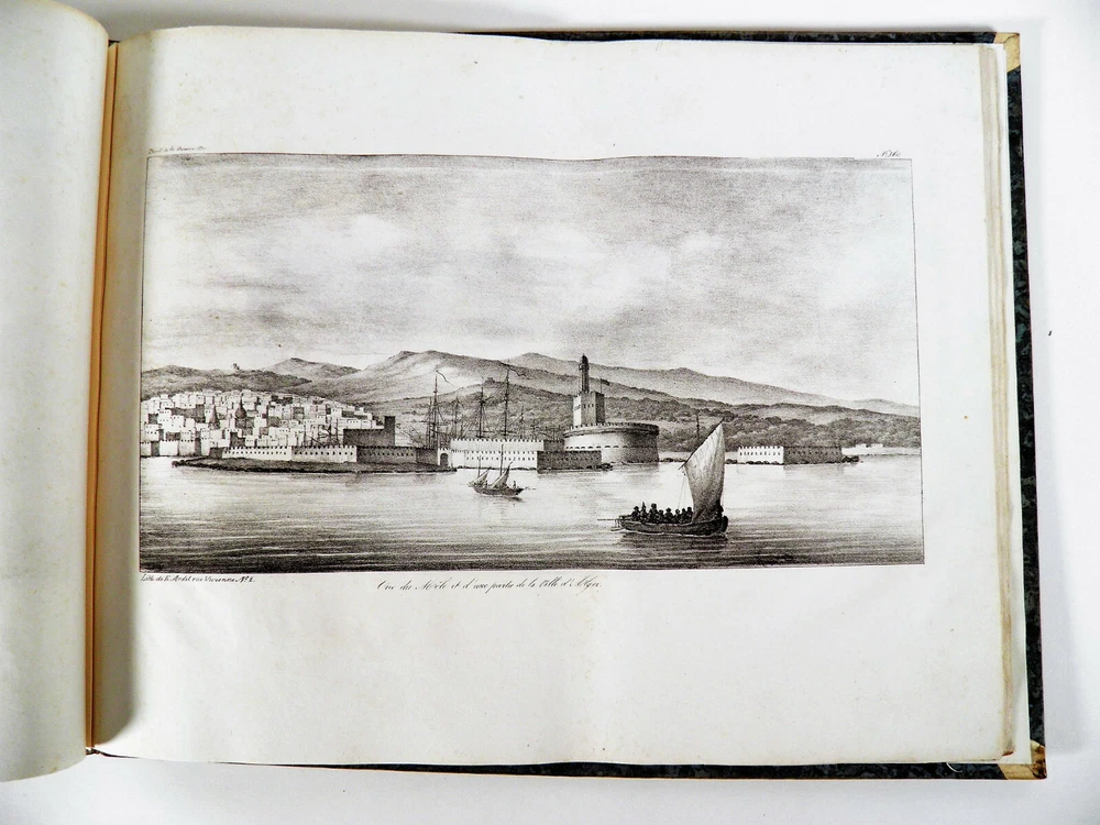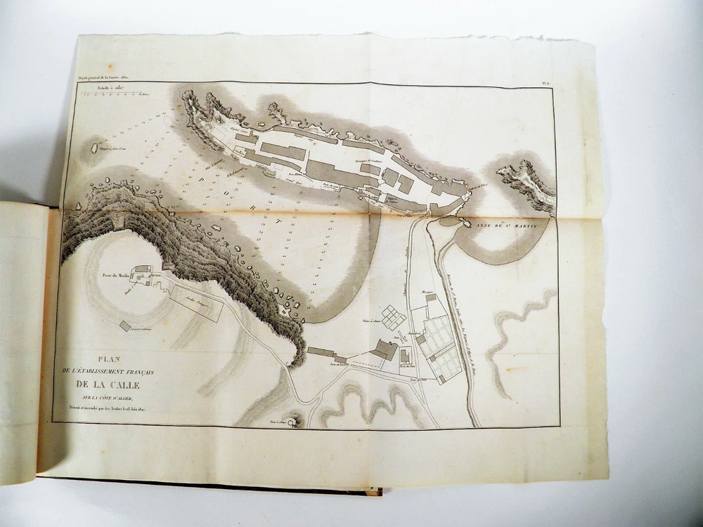 Please consult the conditions of sale at the end of the description before purchasing. ANONYMOUS [PIQUET, Charles; BOUTIN, Vincent-Yves Captain]. Historical, statistical and topographical overview of the State of Algiers, for the use of the African Expeditionary Army. Paris, Ch. Picket, 1830. Text + Atlas, complete. In-12, 10.5 x 17.5 cm (text); Oblong folio, 36 x 28 cm. Pastiche posterior binding in half fawn calfskin and cream vellum corners , smooth spine decorated with cold fillets and gilded wheels, title label in black morocco, edges of the text volume marbled. viii, 238 pp. ; 21 pl. (atlas). Second edition, published the same year as the original. “The first edition of this Overview was sent to the African Expeditionary Army. We will find, at the end of it, some new plans, and, in the text or in the appendix, some additions that new research has enabled us to present to the reader. The atlas contains 7 engraved maps or plans, including 6 leaflets (2 established according to Captain Boutin's surveys) and 14 lithographed plates , including several from the collection of Colonel Rottiers representing views and costumes, all mounted on tabs. “Work published by the General War Depot for the use of the African expeditionary army, which left the port of Toulon on May 25, 1830, heading for Algiers. It was written by the geographer Charles Piquet, largely based on the report of Captain Boutin, sent on a spy mission in 1808 to the regency of Algiers. Gay, 852 and 873; Tailliart, 1455. Ex-dono JJL from Querelles on the first card. Title page of the atlas missing, some rare foxing on the plates which also include, for some, old restorations linked to discreet tears, otherwise beautiful copy, the most complete we have found. ___ Bookstore L’Art et la Manner 19 Route de Pithiviers 45300 BOYNES France Member of SLAM and LILA ( National Union of Ancient and Modern Bookstores / International League of Old Booksellers) ILAB (International League of Antiquarian Booksellers) English spoken Please don't hesitate to contact us if you have any inquiry The greatest care is taken in the description of the works, however, unintentional errors may be made. Do not hesitate to inform us, including after receipt of your purchase. Regarding shipping: The choice is yours! So that you can benefit from the best services and the most advantageous quality/price ratio, the bookstore offers you: Hand delivery by appointment, in Boynes, near Pithiviers, or in Paris on Saturday mornings or during old book fairs. Sending by the Post Office : by letter for folds less than 3 cm thick (packaging included) or by colissimo. Deposit in Relay Point . The bookstore practices group shipments . If you make multiple purchases in our store, u A new claim for payment with adjusted postage costs will be sent to you within a maximum period of 24 hours . THE insurance is optional (option not available for Relay Point shipments). For shipments to Overseas , please contact us beforehand to find out the exact amount of postal costs. Although packaging costs are offered, packages are reinforced and prepared with great care. The Librairie l'Art et la Manière is always on the lookout for rare and old works, to purchase individually or in batches. We travel primarily in Loiret (45), Paris (75) and the south of Ile-de-France (91, 77, 78, 92, 94) as well as in Yonne (89) and Eure-et-Loir (28). If you would like to sell some, do not hesitate to contact us. Just type “Librairie l’Art et la Manière” into your favorite search engine! Second edition, published the same year as the original. “The first edition of this Overview was sent to the African Expeditionary Army. We will find, at the end of it, some new plans, and, in the text or in the appendix, some additions that new research has enabled us to present to the reader. “Work published by the General War Depot for the use of the African expeditionary army, which left the port of Toulon on May 25, 1830, heading for Algiers. It was written by the geographer Charles Piquet, largely based on the report of Captain Boutin, sent on a spy mission in 1808 to the regency of Algiers. The Librairie l'Art et la Manière is always on the lookout for rare and old works, to purchase individually or in batches. We travel primarily in Loiret (45), Paris (75) and the south of Ile-de