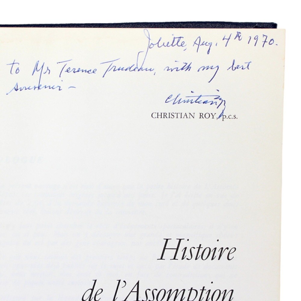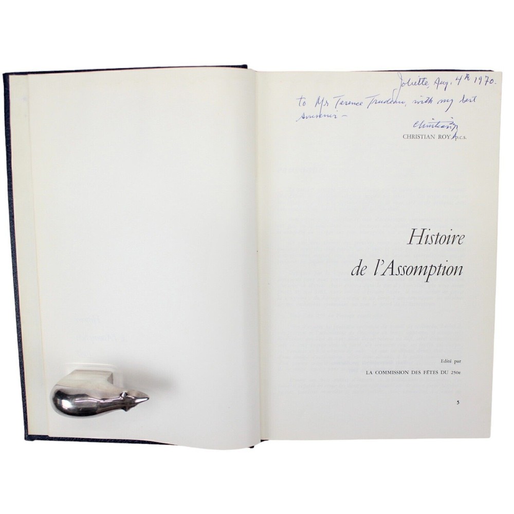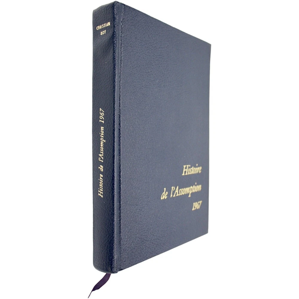 FRENCH LANGUAGE BOOK Histoire de l'Assomption by Christian ROY Published by La Commission des fêtes du 250e, Montreal, Canada, 1967. French Text. First Edition, presentation copy inscribed and signed by author on title page. Very good hardcover, no dustjacket. Tight binding, solid spine, clean unmarked text. Illustrated, 8vo, faux leather cover, 540 pages. L'Assomption is an off-island suburb of Montreal, in southwestern Quebec, Canada on the L'Assomption River. It is the seat of the Regional County Municipality of L'Assomption. It is located on the outer fringes of the Montreal urban area.Most of the economy depends on the agricultural industries of the surrounding plains. It is also the cultural centre of the region Loc: B2 Store Add to Favorites Feedback QUEBEC MONTREAL L'ASSOMPTION HISTORY FRENCH TEXT MAPS CHURCHES SIGNED LEATHER FRENCH LANGUAGE BOOK Histoire de l'Assomption by Christian ROY Published by La Commission des fêtes du 250e, Montreal, Canada, 1967. French Text. First Edition, presentation copy inscribed and signed by author on title page. Very good hardcover, no dustjacket. Tight binding, solid spine, clean unmarked text. Illustrated, 8vo, faux leather cover, 540 pages. L'Assomption is an off-island suburb of Montreal, in southwestern Quebec, Canada on the L'Assomption River. It is the seat of the Regional County Municipality of L'Assomption. It is located on the outer fringes of the Montreal urban area.Most of the economy depends on the agricultural industries of the surrounding plains. It is also the cultural centre of the region Loc: B2