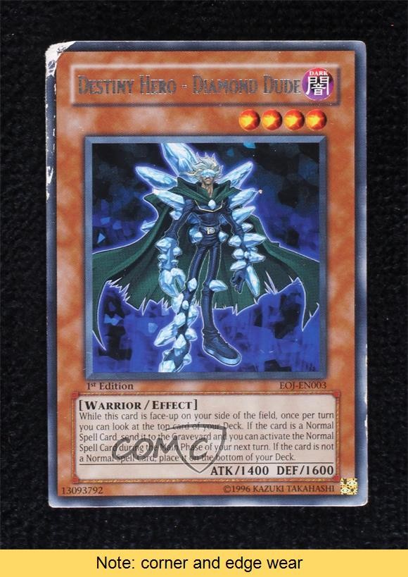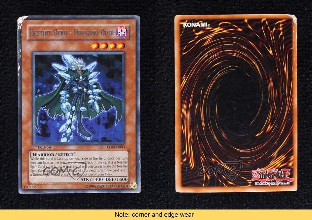 Love this Destiny HERO Diamond Dude card! The 1st Edition rarity from Enemy of Justice is a great find for any collector. While it has some corner and edge wear, it’s still in solid condition for play or display. Perfect addition to a HERO deck or nostalgic collection. Fast shipping and great service from COMC—highly recommend!