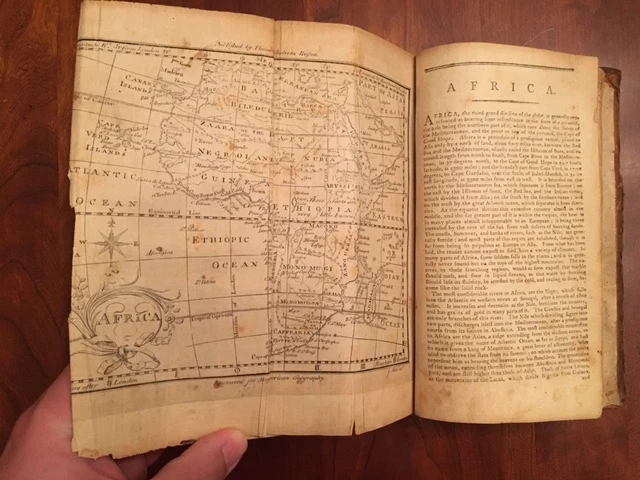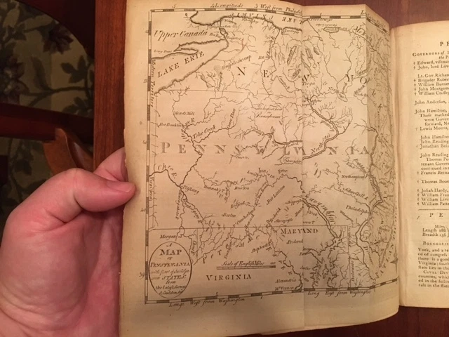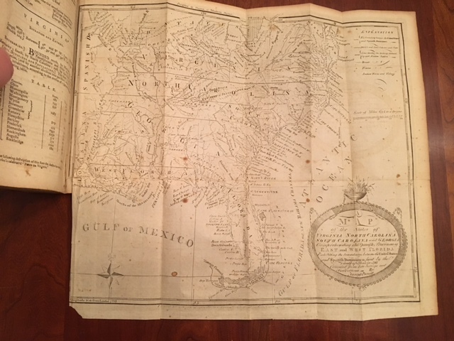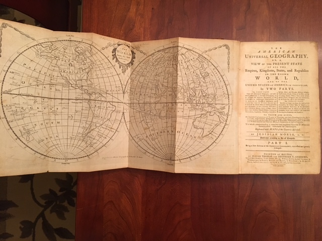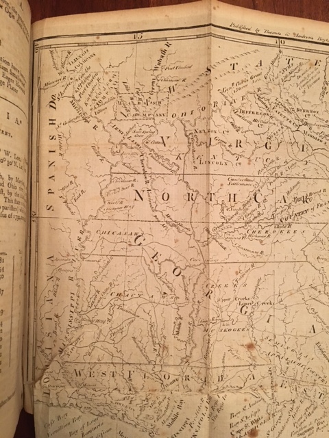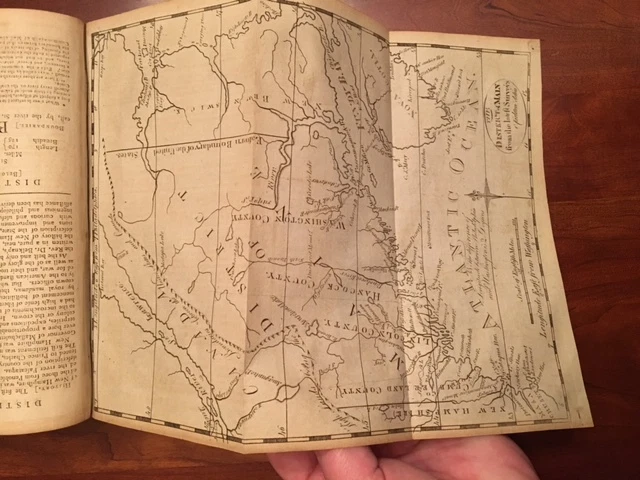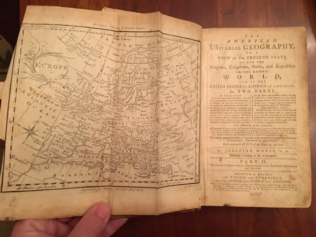 American Universal Geography – or, a view of the present state of all the empires, kingdoms, states and republics in the known world, and of the United States of America in particular. In two parts. .Part I. Being a New Edition of the American Geography, corrected and greatly enlarged. Also Part II. containing a geographical description of the Eastern Continent and Islands . By Jedidiah Morse Published: Isaiah Thomas, Ebenezer T. Andrews, Boston, 1793 . Full leather binding. Married set, as faded spine labels are different color for each volume. Volume I has the front board detached and a crack along the spine, though the text block appears to holding well. Volume II is much more solidly bound. Scuffing to the covers on both volumes. All maps are present. Many are in remarkable condition. A few have some minor issues with awkward fold lines (most of these maps are larger folding) and a few closed tears or edge wear. Happy to check on condition of any specific map or provide more detail or pics for specific maps upon request. All in all, a nice set of a work usually much more worn and often incomplete in form or another. The map District of Maine, by Osgood Carleton, is the first separate map of Maine not part of a regional map. Joseph Purcell's map of the Southeast shows the "Country of Frankland", the only appearance of this designation known on a map (easily worth 2/3 the value of the set). Scarce example in this completeness and condition. Very SCARCE title to be found COMPLETE with all 10 maps! Not Ex-Lib. I've done my best to describe the books, but if you have additional questions, please don't hesitate to send me an e-mail.