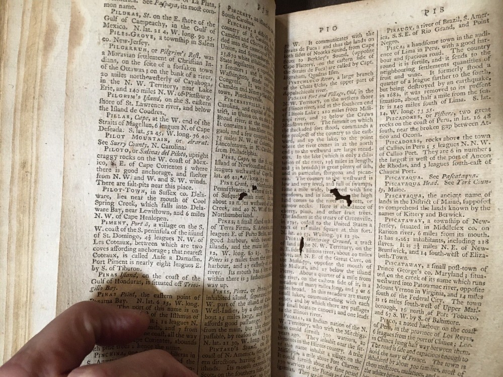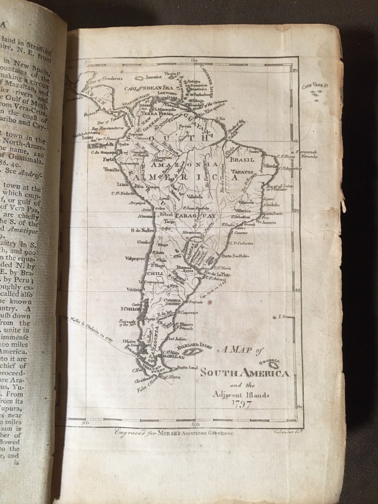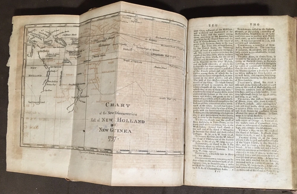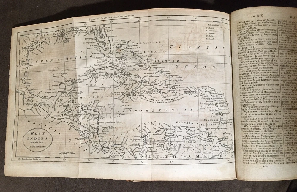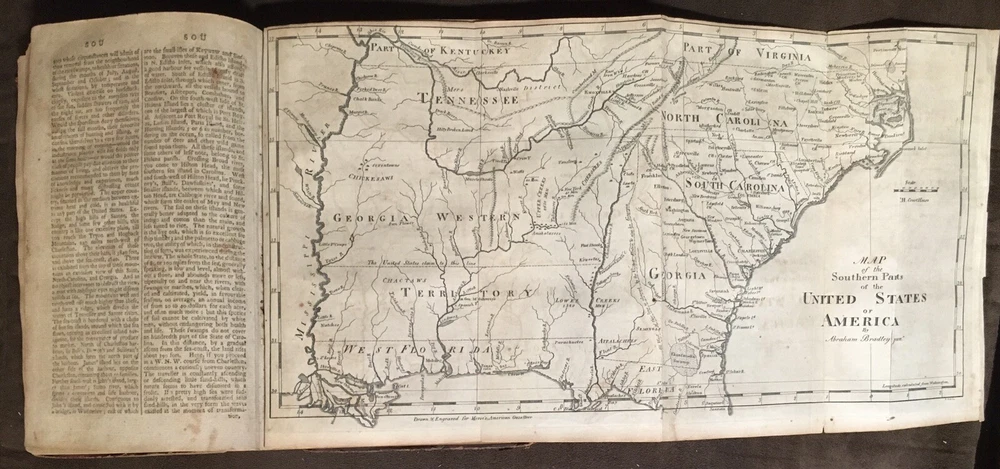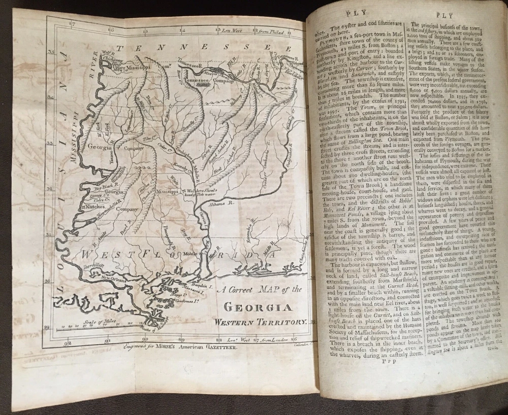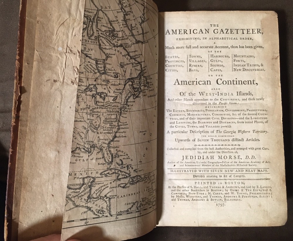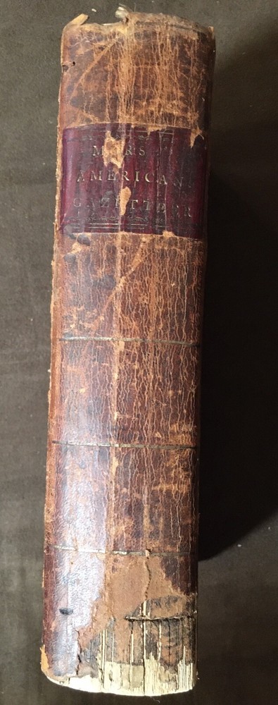 Very rare original 1979 American Gazetteer by Jedidiah Morse. Its title page description reads, "Exhibiting, in Alphabetical Order, a Much More Full and Accurate Account, Than Has Been Given of the States, Provinces, Counties, Cities, ... Forts, Indian Tribes, & New Discoveries on the American Continent, Also of the West-India Islands... with a Particular Description of The Georgia Western Territory... collected and compiled ... and arranged ... by Jedidiah Morse. Illustrated with Seven New and Neat Maps" Printed in Boston : At the Presses of S. Hall and Thomas & Andrews, and sold by E. Larkin,... 1797. 8vo. viii, [619] p. Complete. This is a compendium of alphabetical entries of all the geographic and cultural points of the American continent at the time. Lists many cities, counties, towns, lakes, rivers, Indian tribes, and so forth. Absolutely incredible look into early American history. Includes the map showing the Georgia Western Territory, which was apparently not included in every printing. The heading says there are seven maps, but this volume only has six, unless I am just not finding it. I don't see any evidence of a map being torn out, and I don't see any information on line about the 7th map, so I am not sure if it is missing or not. Anyhow I have included photos of all the maps in this volume. Note that the map of North America opposite the title page is torn and missing half. Otherwise all the maps are just beautiful. The leather cover has some wear, as you can see, but the binding is still intact and fairly strong. There are a few spots where you can see the threads and it is a touch loose, but not coming apart at all. There are exactly three pages which have little holes, but really it is only three that I see and the holes are not bad. See photo. Other than some wear on the cover, the torn map, and the little holes, this copy is in remarkably nice condition. All the pages are clean with aging but no damage. Truly a beautiful copy. There is a beautifully hand-written note on the first blank page about the sale of this book in 1815 for $2.25. A name and 1799 date are written at the last page. This is a very rare collection of information about early America, with amazing maps and fascinating descriptions. And in remarkably lovely condition. Feel free to ask any further questions or request more photos. The higher shipping is for insurance.