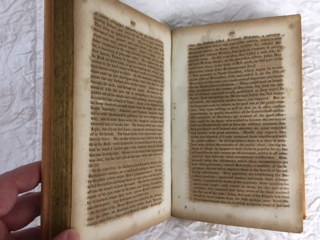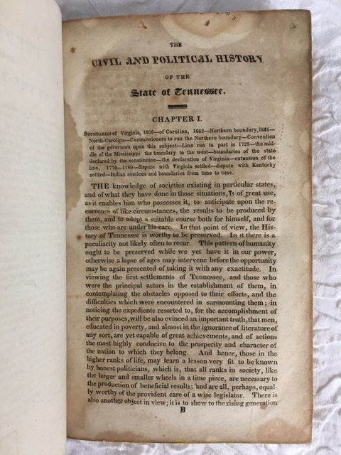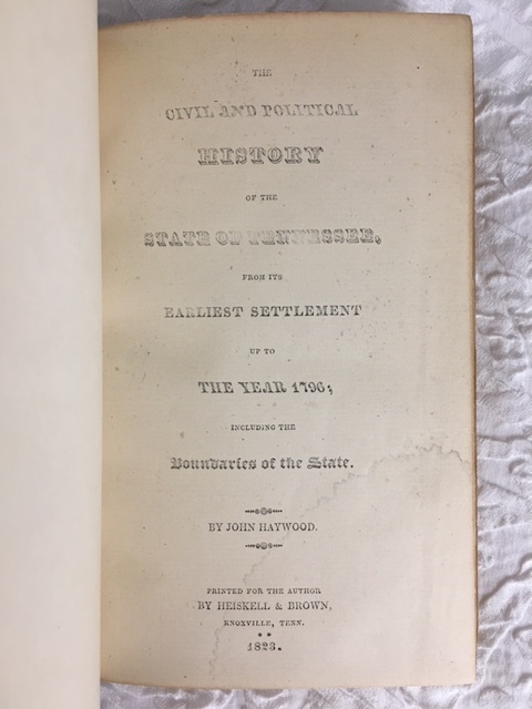 The Civil and Political History of the State of Tennessee, from its Earliest Settlement up to the Year 1796; Including the Boundaries of the State . By John Haywood Published: Printed for the author by Heiskell and Brown, Knoxville, TN, 1823 . FIRST EDITION. (6), 504 pp. Bound in full leather. Half-title; copyright slip inserted ahead of the preface. Title page and preface page are expert facsimiles, bound in. Some age toning to the text, with some sections greater affected than others. Haywood (1762-1826), early Tennessee's pre-eminent legal scholar and historian, was a native of North Carolina, compiling several volumes of judicial reports and other legal writings there, before moving to Tennessee in 1807; "[Civil and Political History and Natural and Aboriginal History] have always been deemed high authority. Haywood was the pioneer in this field in the Southwest" (DAB). Howes H-358 ("b"). Sabin 31084 (incorrectly calling for a map): "This work, only less rare than [Haywood's Natural and Aboriginal History], contains a large portion of material relating to the border warfare with the Indians, narrated in that work. The speculative and antiquarian portions and descriptions of mounds are omitted, but the story of Indian conflicts and massacres is narrated with greater detail and minuteness, filling much the larger portion of the work. The story of the formation of the State of Franklin, and the civil war which ensued, is a chapter of American history but little known, and scarcely exceeded in interest by any other." American Imprints 12799. Streeter sale 1658. Siebert sale 372. Allen Tennessee Imprints 561. Allen Some Tennessee Rarities 25: "One of the earliest and most significant historical works on Tennessee." Horn Twenty Tennessee Books 5: "[Haywood] was writing only a few year after the actual occurrence of the events discussed and still had the advantages to be derived from personal contacts with actual participants." McMurtrie Early Printing in Tennessee 205. Not Ex-Lib. I've done my best to describe the book, but if you have additional questions, please don't hesitate to send me an e-mail.