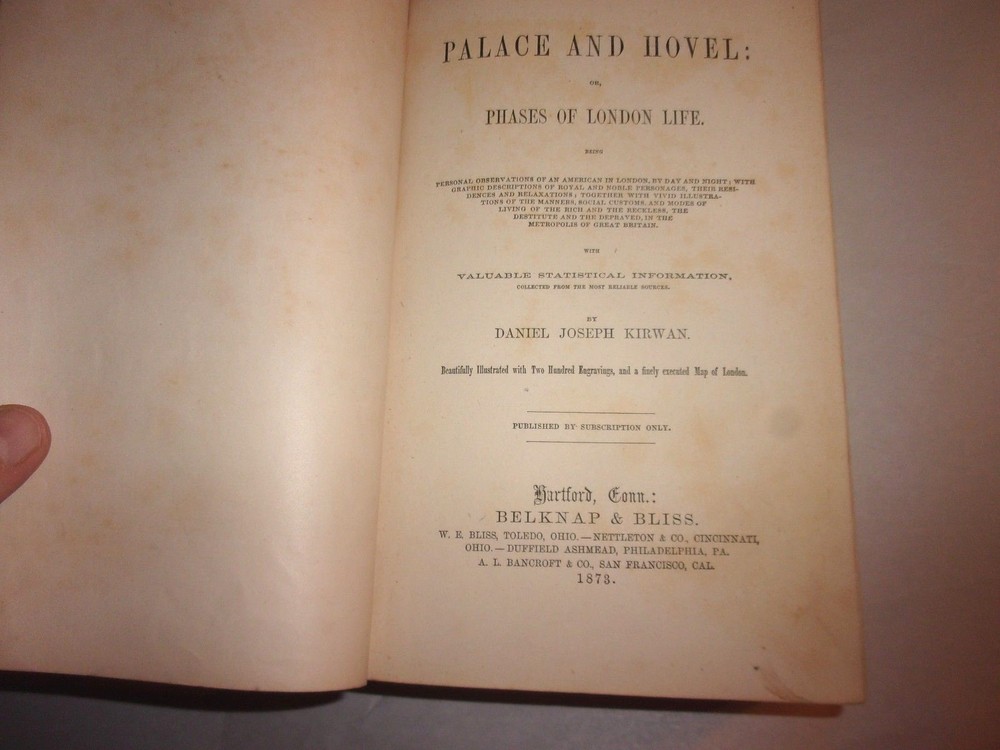 RARE 1873 PALACE AND HOVEL HIGH & LOW LIFE LONDON ENGLAND UK with Map of London Leather shows wear. Cover nealy loose from book. Damage to spine are. Foxing. See pictures. See pictures for details Thanks for looking!