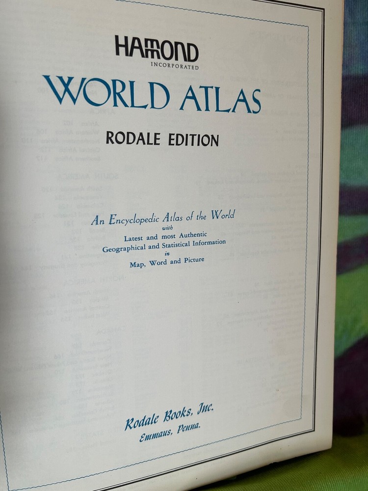 RARE VINTAGE 1966 Hammond Encyclopedic World Atlas: Special Rodale Edition There is a large free standing map of the World. An excellent addition to any collection. The colors are beautiful. See pictures for more details.