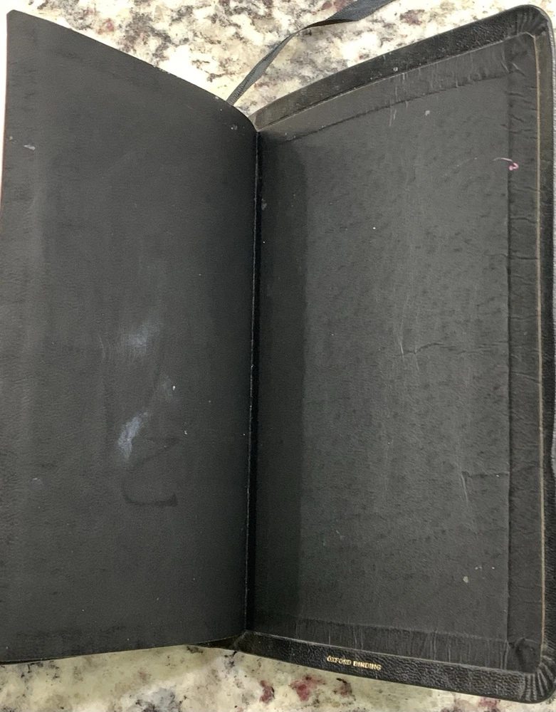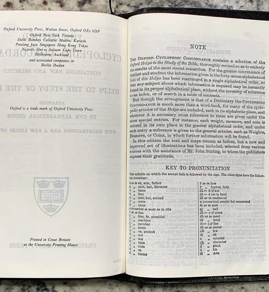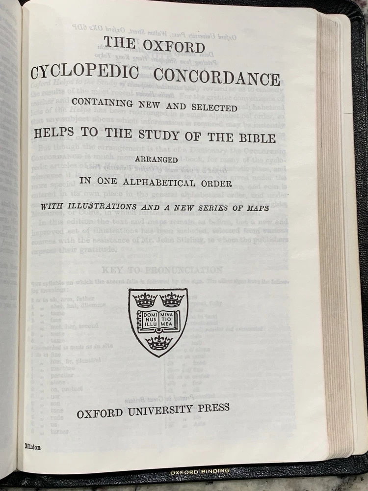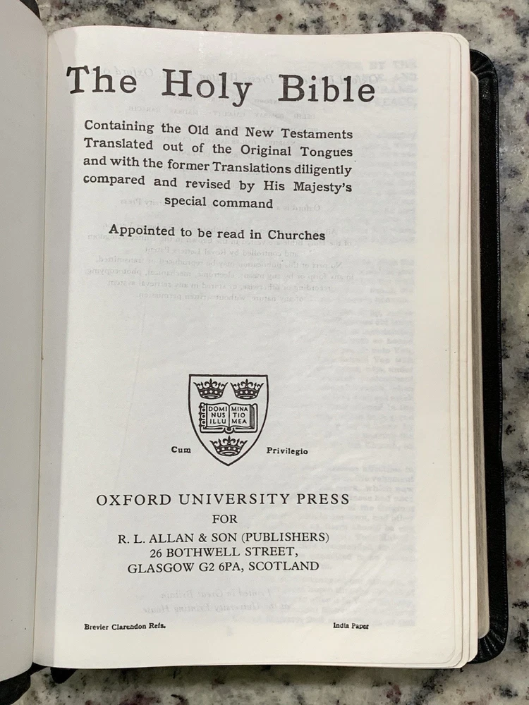 It has an in-depth Concordance with historical pictures and tables. At the back in Maps 1-5 the binding is visible yet intact. The bottom half of New Testament title page is torn off. This Bible is in really good condition with some pages having minimal markings, corner folds, creases, and the faint aroma of perfume. See Photos for details. Dive into the richness of Christian theology with RL Allan's Oxford Binding King James Bible. This edition, the Brevier Clarendon, is crafted with care by R.L. Allan & Son Publishers and boasts a luxurious goatskin format. It is a treasure trove for both personal reflection and scholarly study, complete with a cyclopedic concordance and maps that enhance understanding of biblical narratives. Measuring at 7.5 inches in length, 5.3 inches in width, and a 1.5-inch spine, this Bible is both portable and substantial. It is published in English by Oxford University Press, Incorporated and is a testament to the dignity of the Authorized King James Version Holy Bible. Whether for daily reading or in-depth analysis, this volume is an essential addition to any Christian's library.