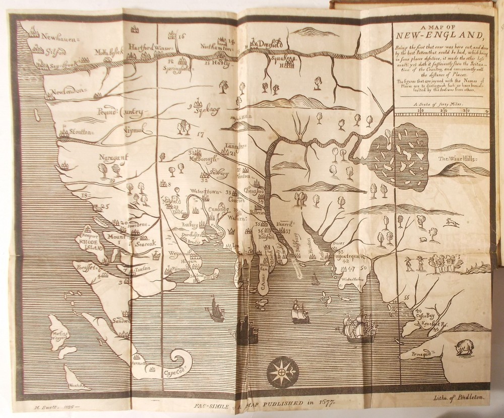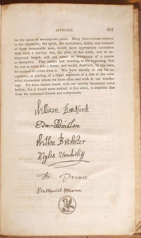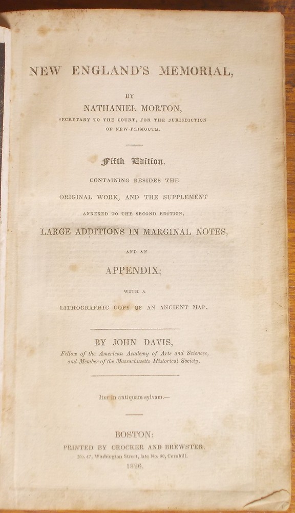 Morton, Nathaniel; Davis, John. New England's Memorial, Containing Besides the Original Work, and the Supplement Annexed to the Second Edition, Large Additions in Marginal Notes, and an Appendix with a Lithographic Copy of an Ancient Map. Boston: Crocker and Brewster, 1826. Fifth Edition. Leather: Good. Handsomely bound in contemporary calf with a crimson spine label with gilt lettering. Early signature of Isaiah Alden in several places on the endpaper and the following blank leaf. The folding map is in good condition with a few closed tears repaired on the back; some foxing. Octavo, 482pp. Including the Errata.