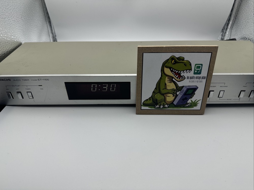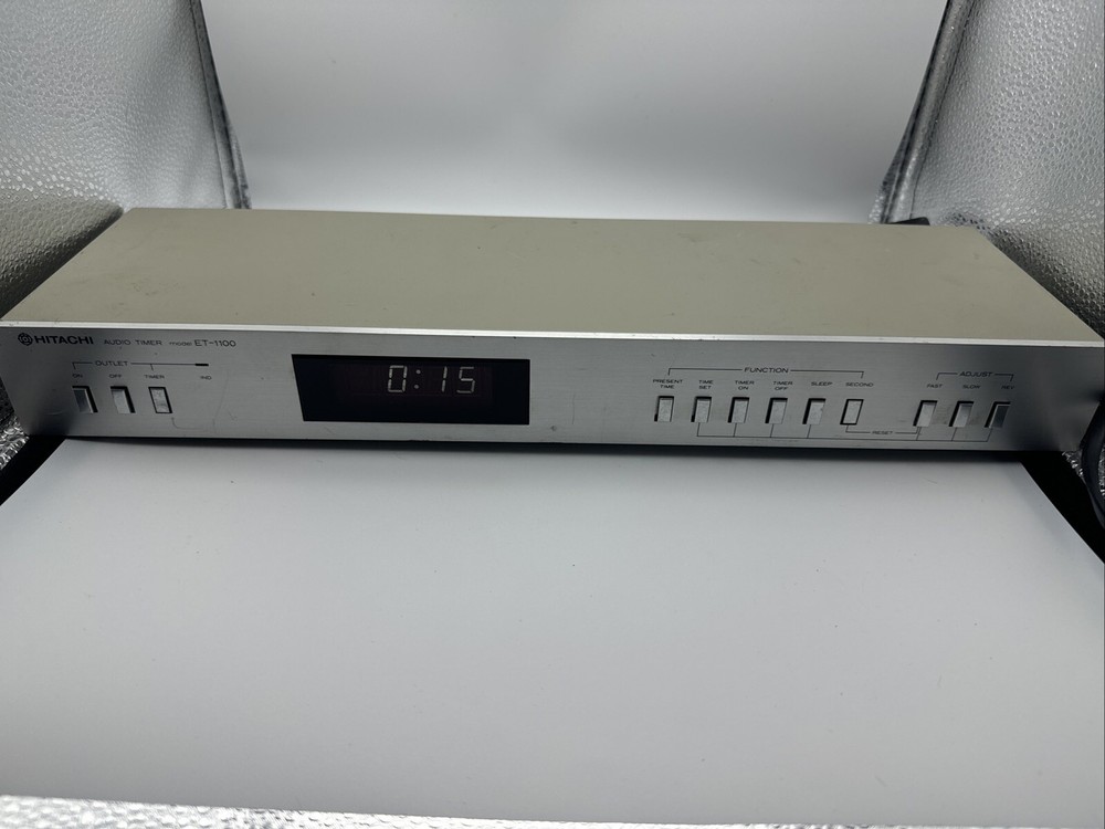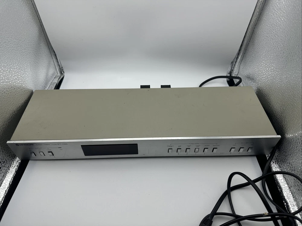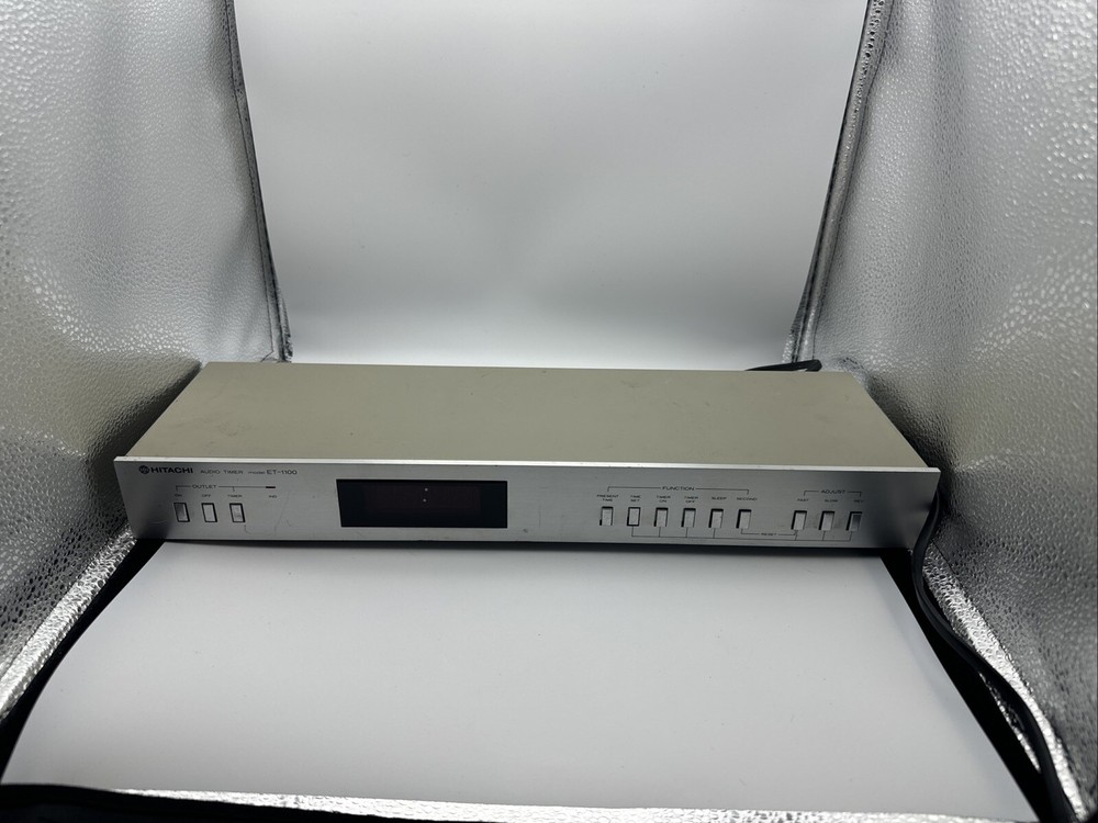 This rare and hard-to-find audio timer is a must-have for any vintage audio enthusiast. Made in Japan by Hitachi, this digital controlled timer is the perfect addition to your vintage audio collection. With its high-quality construction and precision engineering, this timer is sure to provide you with the perfect audio experience. The ET-1100 model is a digital controlled audio timer that is made in Japan by Hitachi. This timer is a rare and hard-to-find item that is perfect for any vintage audio enthusiast. With its high-quality construction and precision engineering, this timer is sure to provide you with the perfect audio experience. General Manufacturer: Hitachi Model: ET-1100 Type: Timer Years of manufacture: 1983 - 1985 Made in: Japan Color: Silver, Black Remote control: No Power consumption: 5 watts Dimensions: 43.5(W)x14.2(D)x5.5(H) cm Weight: 1.7 kg Original price approx.: 290 DM Connections Number of inputs: 1x mains Number of outputs: 2x mains Technical data Display: backlit LCD Sleep timer (Sleep): Yes Total switching power: 500 Watt max Accuracy: +0,02 sec. Special Features 12/24 hours display switchable Works great please see pictures for details, runs 50z / 60z