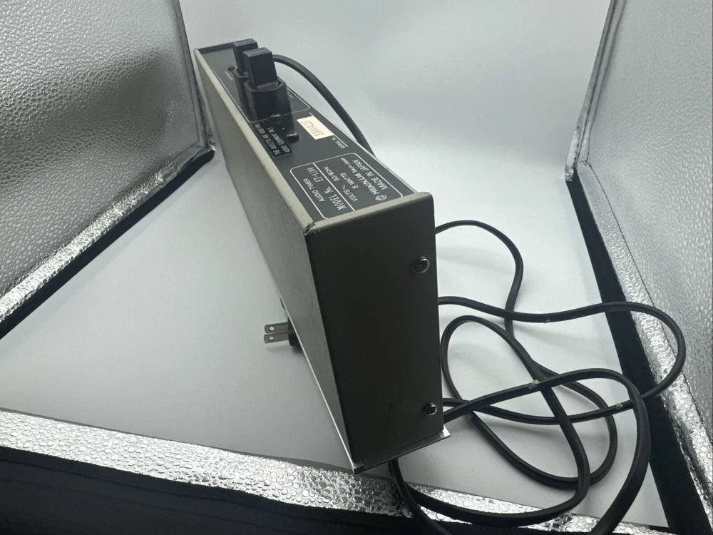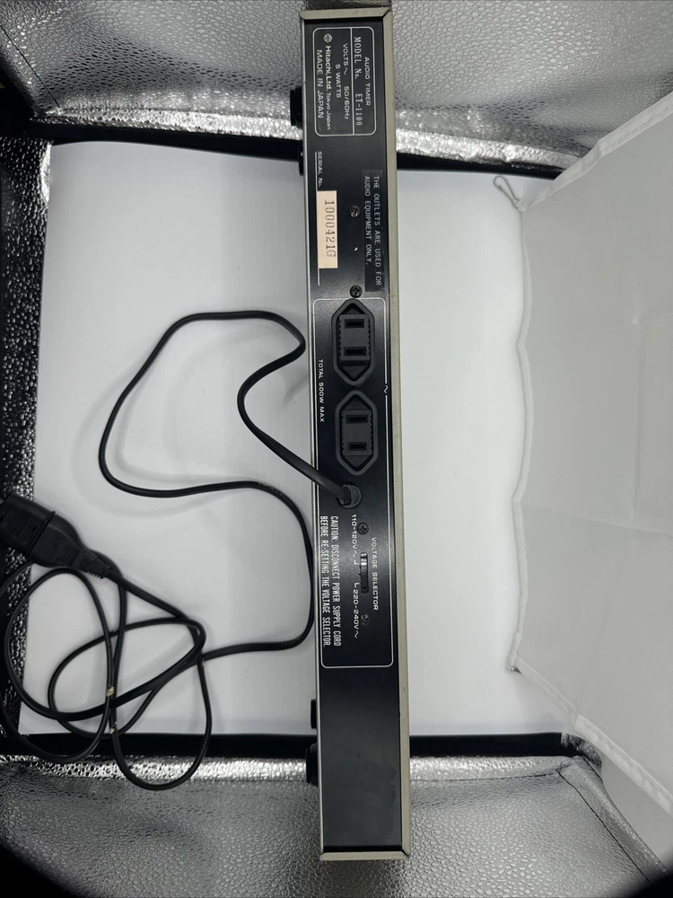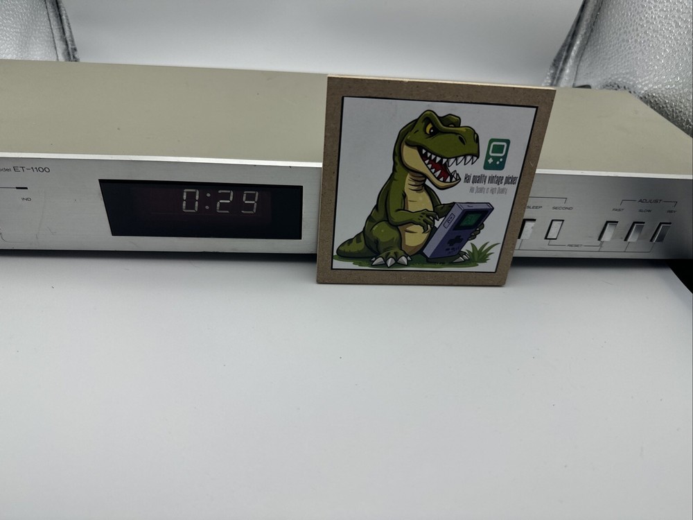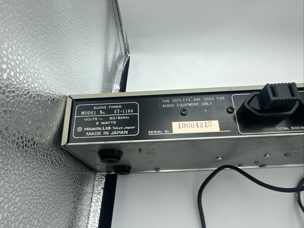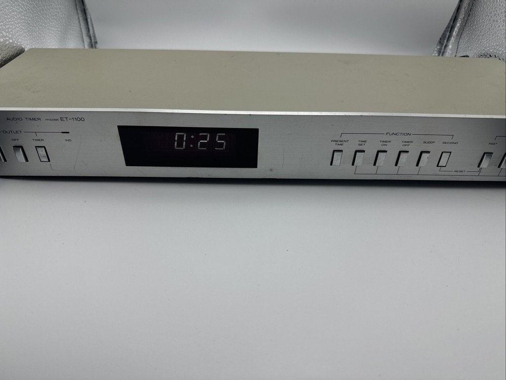 This rare and hard-to-find audio timer is a must-have for any vintage audio enthusiast. Made in Japan by Hitachi, this digital controlled timer is the perfect addition to your vintage audio collection. With its high-quality construction and precision engineering, this timer is sure to provide you with the perfect audio experience. The ET-1100 model is a digital controlled audio timer that is made in Japan by Hitachi. This timer is a rare and hard-to-find item that is perfect for any vintage audio enthusiast. With its high-quality construction and precision engineering, this timer is sure to provide you with the perfect audio experience. General Manufacturer: Hitachi Model: ET-1100 Type: Timer Years of manufacture: 1983 - 1985 Made in: Japan Color: Silver, Black Remote control: No Power consumption: 5 watts Dimensions: 43.5(W)x14.2(D)x5.5(H) cm Weight: 1.7 kg Original price approx.: 290 DM Connections Number of inputs: 1x mains Number of outputs: 2x mains Technical data Display: backlit LCD Sleep timer (Sleep): Yes Total switching power: 500 Watt max Accuracy: +0,02 sec. Special Features 12/24 hours display switchable Works great please see pictures for details, runs 50z / 60z