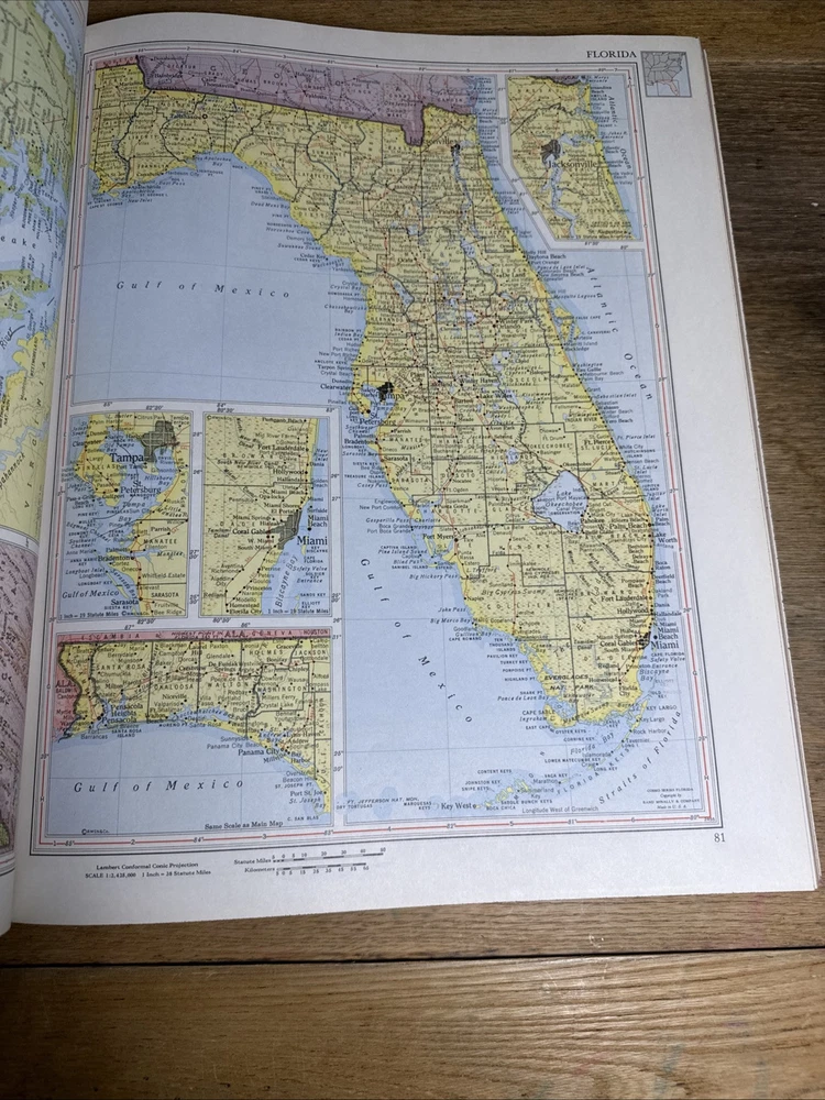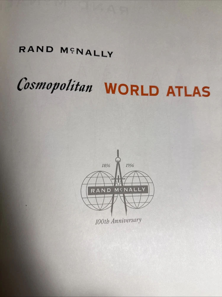 Rare Rand McNally Premier Centennial World Atlas SNAKESKIN Compass Cover 1955 14 3/8" x 11 1/2" This vintage 1955 Rand McNally World Atlas is not perfect, but it is amazing! From the snakeskin bound cover with the gold-stamped compass ... to the mid-century style illustrated end papers ... to the 120 pages of color maps plus 173 page index, this is a rare find. I do not know if the snakeskin is genuine, as this edition is extremely rare. Records of this edition are hard to find, but what little I did find out about it suggests that the snakeskin is the real deal. However, I am not an expert and cannot guarantee this. There are 120 pages of color maps of the United States and nations around the world. The maps are followed by 10 pages of reference charts, tables, and lists. Then follows a comprehensive 173 page index. CONDITION: 1.5" Crack in Snake skin on Front Cover far right, some rubbing to the cover on back side and some corner wear. Inside small tear on Centennial Edition Page only. All other Pages inside are in Great Condition with No Markings at all. This item will ship via USPS Media Mail unless you select another option. Keep in mind that Media Mail can take up to two weeks or sometimes longer. Will Ships Very Securely in Box.