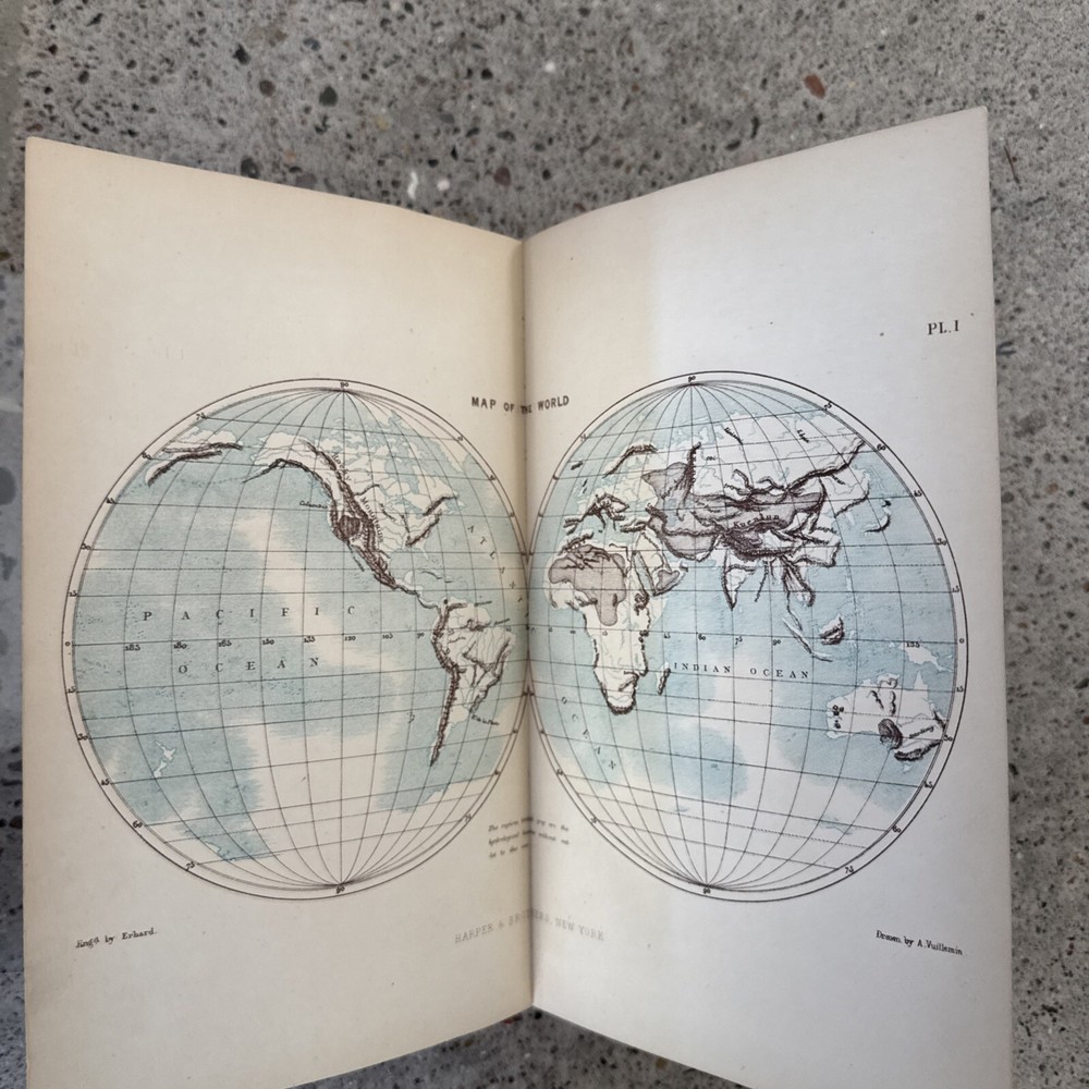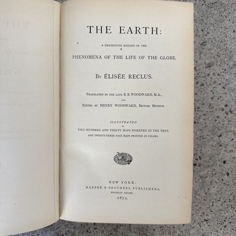 This is a very well cared for scarce copy. I will ship media mail with full coverage insurance THE EARTH: A DESCRIPTIVE HISTORY OF THE PHENOMENA OF THE LIFE OF THE GLOBE. BY ÉLISÉE RECLUS. TRANSLATED BY THE LATE B. B. WOODWARD, M.A., AND EDITED BY HENRY WOODWARD, BRITISH MUSEUM. ILLUSTRATED TWO HUNDRED AND THIRTY MAPS INSERTED IN THE TEXT, AND TWENTY-THREE PAGE MAPS PRINTED IN COLORS.
