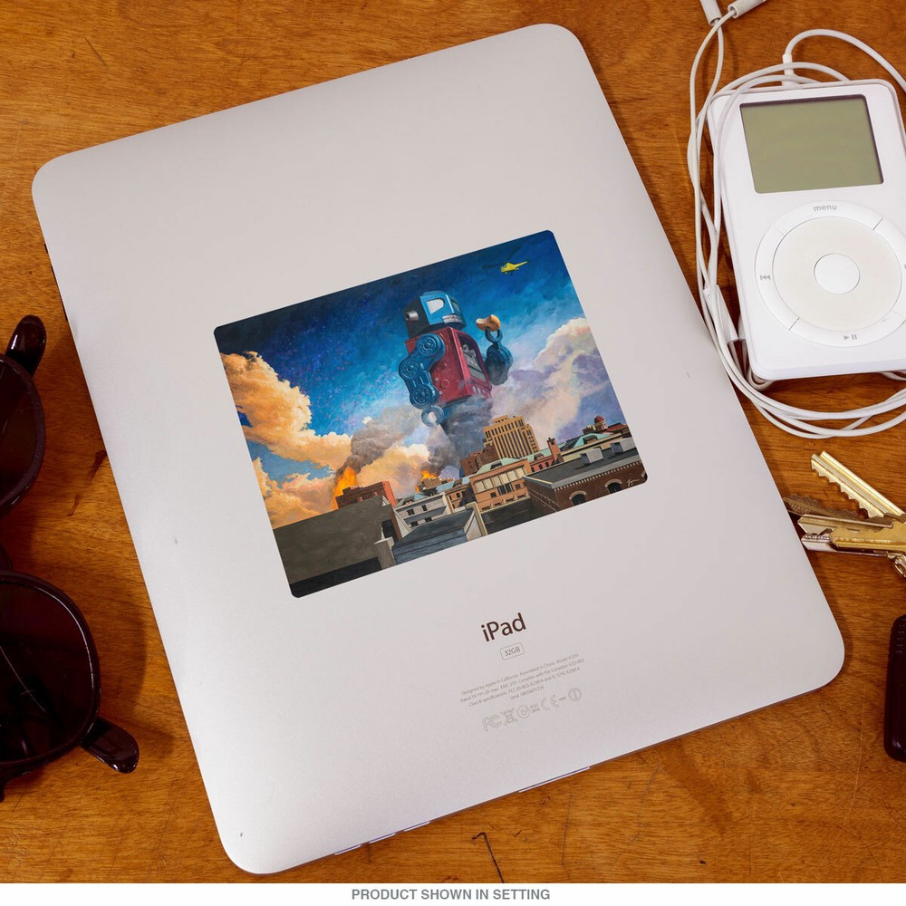 RetroPlanet Our eBay Store Robot Godzilla Donut Lunchtime Vinyl Sticker Sci-Fi Laptop Bumper This durable, retro-futuristic sticker features a glossy finish that looks great on any laptop, car bumper, and more. Made in the USA. Copyright Eric Joyner/artlicensing.com. Product Details Height 3.370 Width 4.400 Features: Durable Vinyl Sticker with Glossy Finish Measures 4.4W x 3.375H Inches Made in the USA Copyright Eric Joyner/artlicensing.com