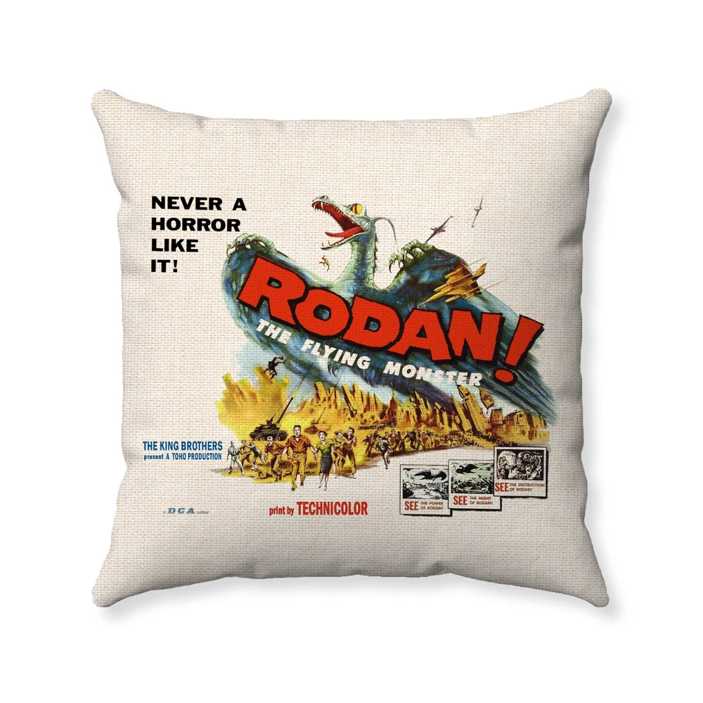Have a Godzilla movie monsters fan in your life? Our vintage Rodan Movie Poster pillow was made just for them! Long live the king! This pillow is the perfect Father's Day gift or even a thoughtful birthday present for your Movie Monsters (Kaiju) film buff. Great decor for a home theater, game room, den or anywhere in the home that needs a bit of nostalgia. The artwork on this pillow brings Rodan to life! This pillow is not available anywhere else, so you can be sure that you will have a unique piece of Godzilla movie monsters themed decor. Choose with or without black above and below the poster art. This iconic decorative throw pillow features a full color image of the iconic vintage Godzilla Destroy all Monsters movie poster. This amazing pillow has a hidden zipper closure. Features ------------ ✔️ 18 x18 Inch ✔️ Hidden Zippered ✔️ Polyester Linen ✔️ Insert Included Care Instructions ------------------------ ✔️ Machine wash cold with zipper closed 🤐 ✔️ Lay flat to dry. Iron on synthetic settings. Pillow Insert Installation ------------------------ ✔️ Insert Included - a 19 x 19 inch insert is included and installed with purchase.