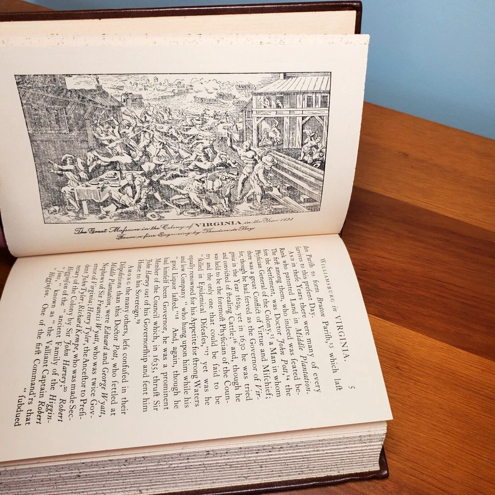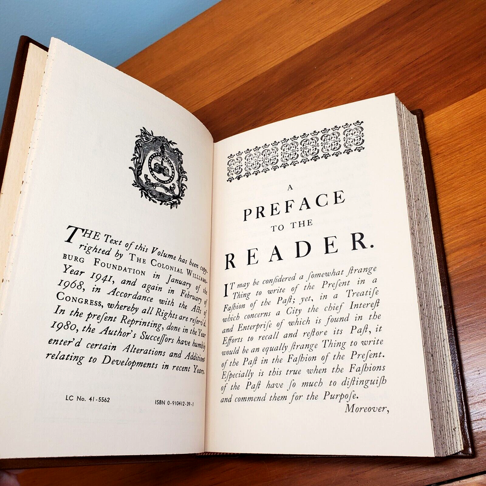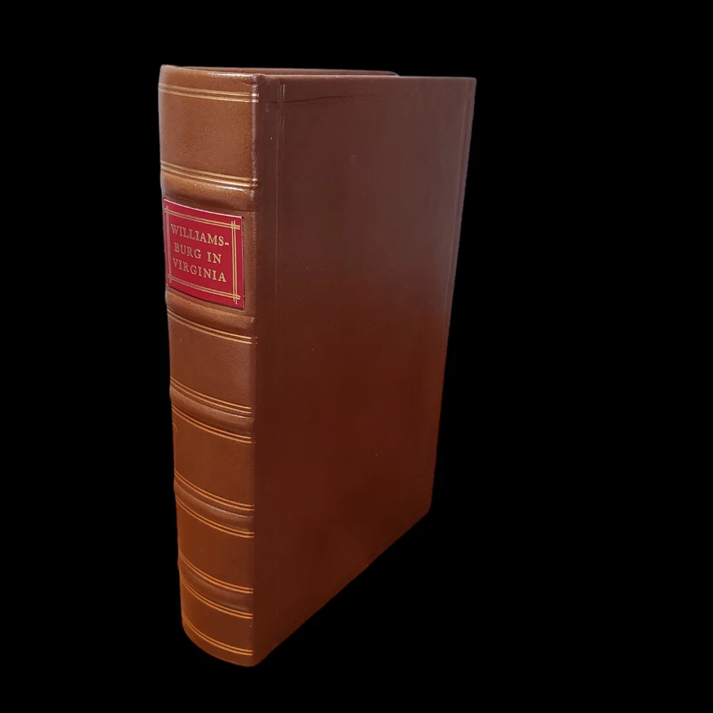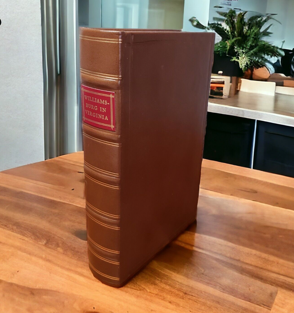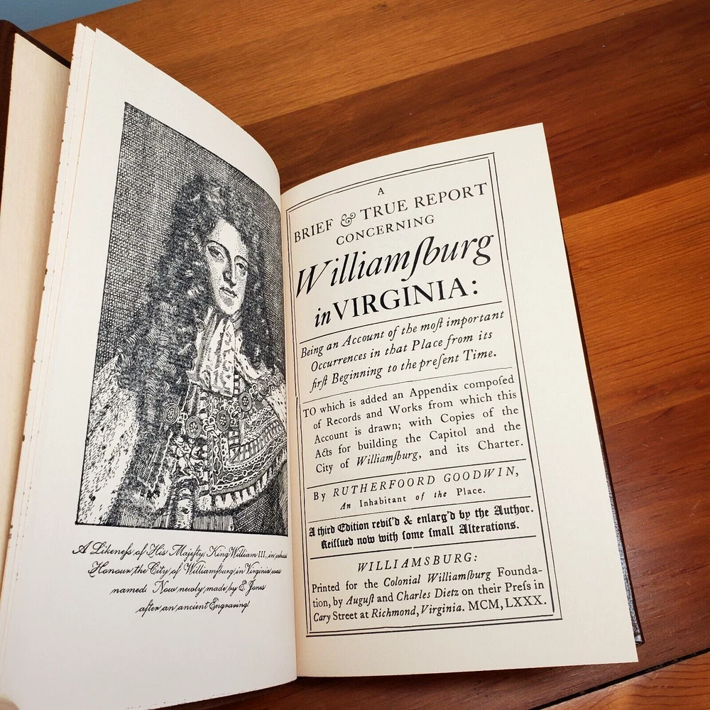 Quality Leather Bound Book, A Brief and True Report Concerning Williamsburg in Virginia: Being an Account of the Most Important Occurrences in That Place, By Rutherford Goodwin Full brown leather with raised bands and a red and gold spine label Collector quality leather-bound reprint, p rinted in the style of 18th Century volumes. This is a history of the historic town of Williamsburg, Virginia. Includes a large appendix, fold out maps, and a list of source material. 406 pages. Will be carefully packed and shipped in a box