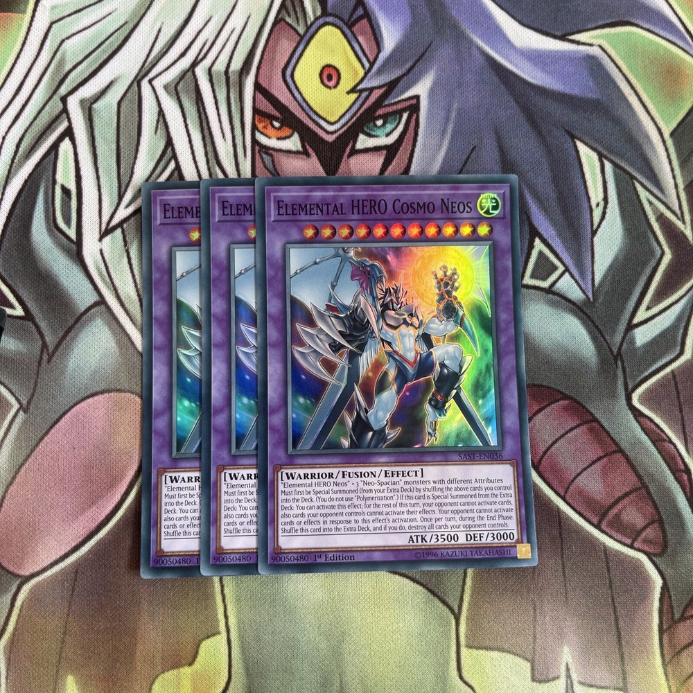 This playset is mixed edition (you will receive a mixture of unlimited and 1st edition cards) Listing Template 2018 Home About Us Shipping Returns View Feedback Contact Us SAST-EN036 x3 Elemental HERO Cosmo Neos Super Rare Excellent Conditon Yugioh These cards are in excellent condition as per the photos. You will receive a playset of cards. (x3) Thanks for viewing! Thanks for viewing! Please check out our eBay store for more cards and don’t forget to use our promotional offers to save money on multiple items! We offer COMBINED INTERNATIONAL SHIPPING! Please contact us and ask us to combine multiple cards in your shipment to save on postage costs! International tracking is included on all orders over £40. If you require a tracking code under this amount it is an additional charge of £6.50. Please add this to your order or contact us for more information. We provide postage free in the UK! All of our single cards are sleeved, with a taped Toploader to ensure maximum protection, and the best overall condition of your cards! Combined orders may in the same sleeve, unless requested otherwise. Do you want to earn extra cash for your old cards? Clear out your binder and send us photos of what you have! We will happily send you an offer and sort out postage to make it hassle free. There's no harm in trying! Message us now! Free UK Delivery! Honest Sellers. We take care of the cards so you can worry less about the fuss and more about winning, competing and collecting. About Us We started selling collectable cards over 6 years ago after selling off our own childhood Yu-Gi-Oh collection. We then rediscovered our passion for trading card games. Ever since, my brother and I have been trying to ensure that we provide a range of cards within the fastest possible time to ensure you can build your collection as you’d like it! With over 35,000 positive feedback we strive for quality customer service, aiming to give the service that we would like to receive and stock a huge inventory of new and vintage collectable cards from popular games such as Yu-Gi-Oh and Pokemon so there’s something for everyone! Our goal is that we hope to build a collectable card community as passionate about collectable cards as we are! Contact Us The best way to get in contact is through eBay’s ‘contact seller’ button where we’ll try to get back to you as soon as possible. Feedback We always prioritise your buying experience so you can shop without worry. Contact us if there’s any part of an order you were dissatisfied with as we hope to resolve any issues as soon as possible. Buy with confidence. View Our Categories