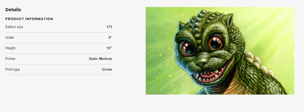 Little Godzilla Poster Artist Jason Edmiston Giclée print on archival paper Details PRODUCT INFORMATION Edition size 175 Height 10" Printer Static Medium Print type Giclee Width 8" Limited edition of 175. San Diego Comic Con Exclusive In Hand ready to ship