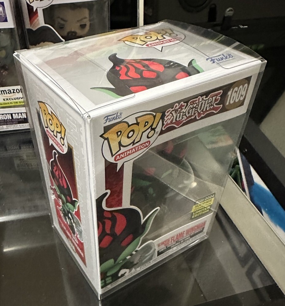 This is a 2024 San Diego Comic Con exclusive Funko Pop! vinyl figure featuring Elemental Hero Flame Wingman from the Yu-Gi-Oh! TV show. It is part of the Heroes collection and comes with the original packaging. The figure is a limited edition with an official SDCC sticker, making it a highly sought-after collector's item for fans of the franchise. Comes with pop protector