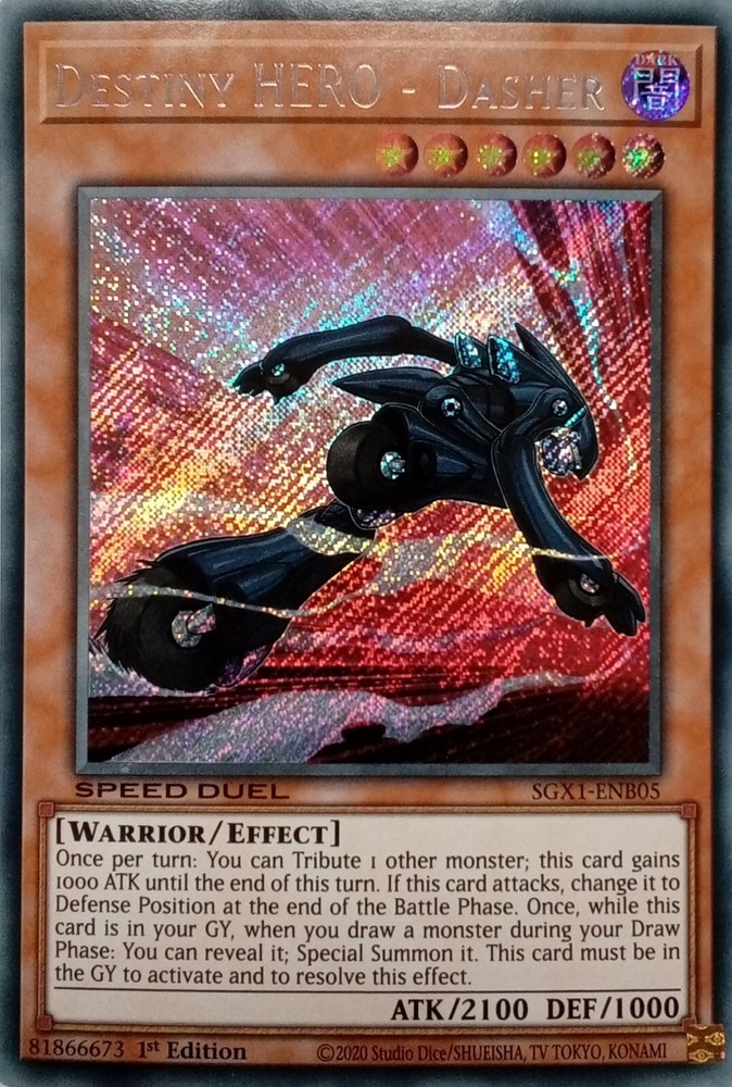 SGX1-ENB05 DESTINY HERO - DASHER SECRET RARE 1ST EDITION ALL YU-GI-OH CARDS I SELL ARE KONAMI TOURNAMENT LEGAL. CARDS ARE ALL NEAR MINT TO LIGHTLY PLAYED CONDITION. POSTAGE IS FREE SO YOU CAN BUY AS MANY CARDS AS YOU WANT FROM US AND NOT PAY A PENNY POSTAGE. IF YOU HAVE ANY QUESTIONS PLEASE FEEL FREE TO CONTACT ME. Track Page Views With Auctiva's FREE Counter