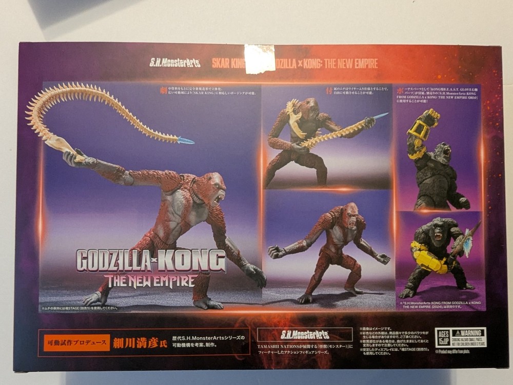 The S.H. MonsterArts 2024 Godzilla X Kong SKAR KING Figure by Bandai is a brand new collectible action figure featuring the character Skar King from the Godzilla X Kong movie. This multicolor plastic figure stands at 6 inches tall and comes with a whip accessory. The TV show King Kong and the movie franchise Godzilla X Kong are the inspirations for this action figure, perfect for fans of all ages 10 and above. The boxed packaging ensures the item is protected and ready for display.