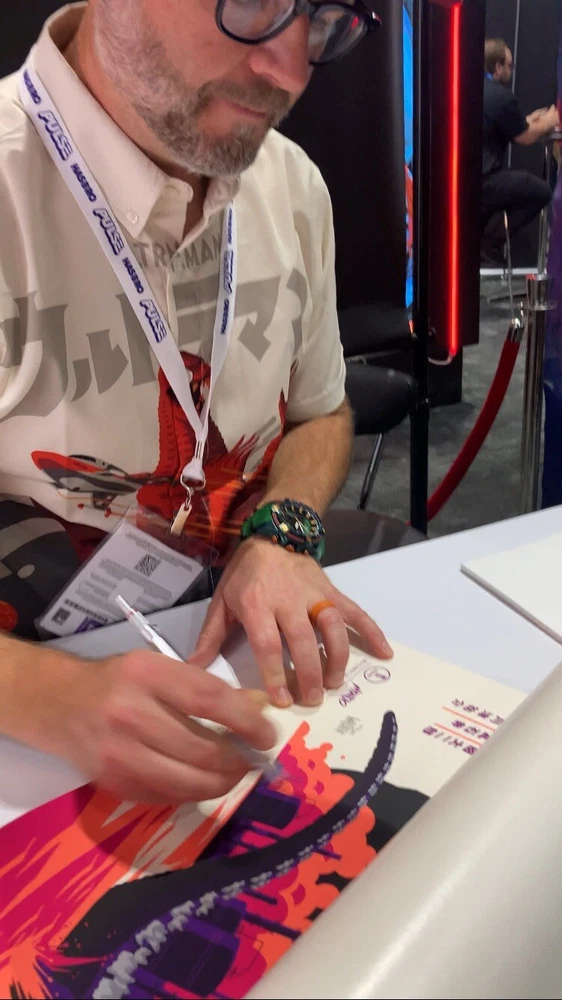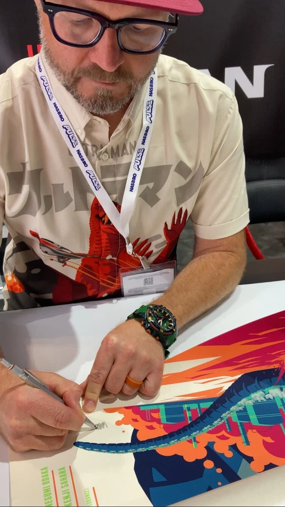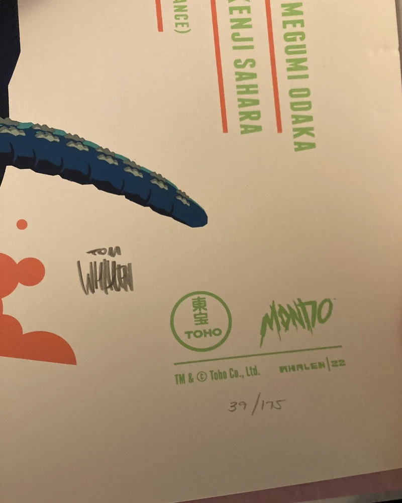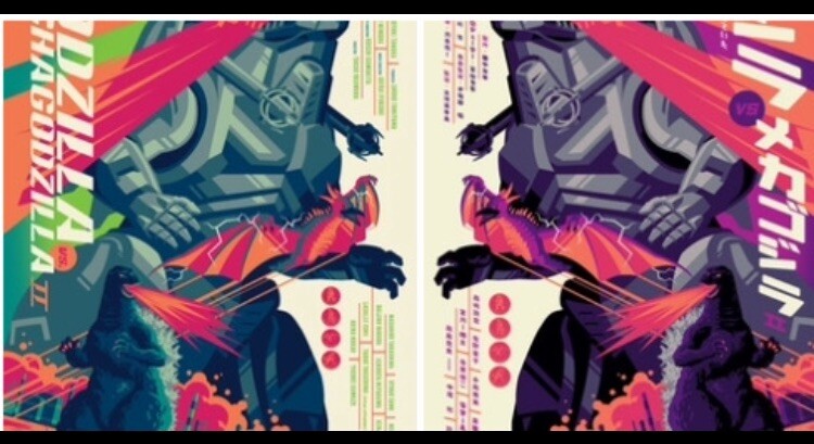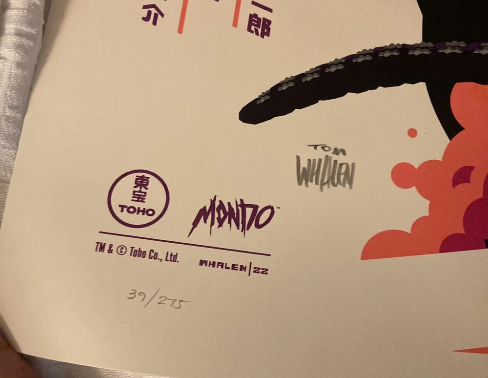 This Tom Whalen print is a must-have for any art enthusiast. The piece features a classic battle between Godzilla and Mechagodzilla, with stunning details that will make it a standout addition to any collection. The print is signed by the artist and is a limited edition. Low matching number set of 39 in both copies The production technique is screen printing, which adds depth and texture to the piece. The print is perfect for framing and displaying in any art gallery or home. This item falls under the categories of Art and Art Prints, and is sure to be a valuable addition to any collection. These posters were just signed by Tom at San Diego Comic Con. Pictures were added for authenticity. These posters have never been framed or outside of their original tube from Mondo except for these signings.