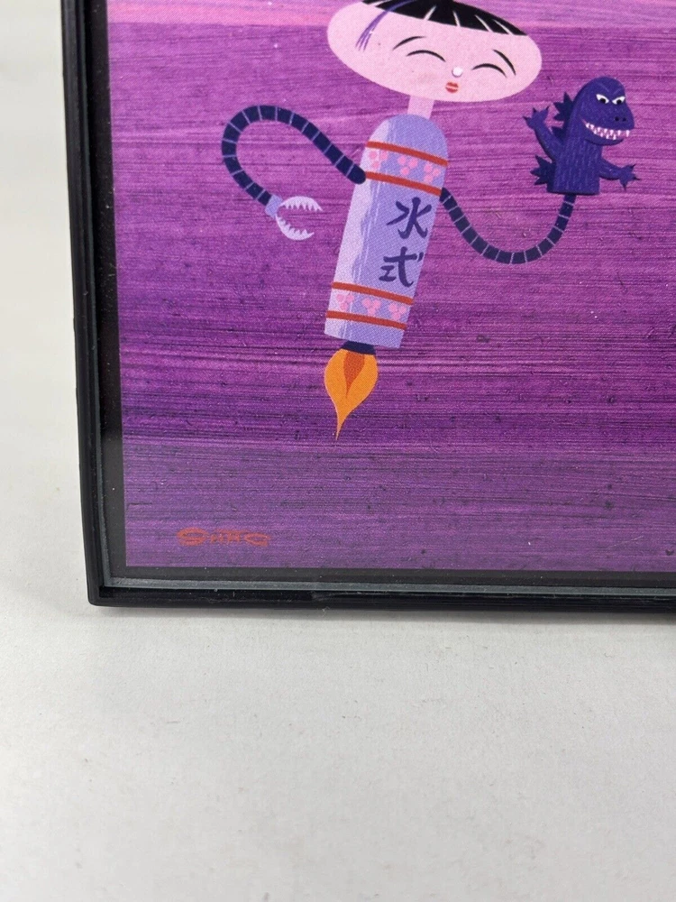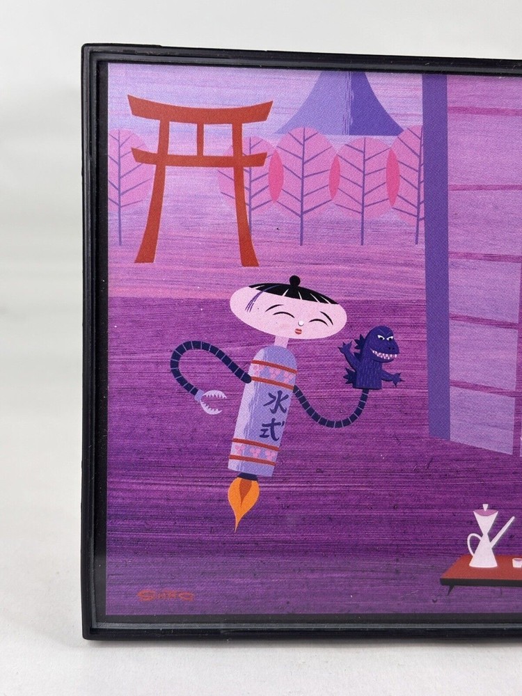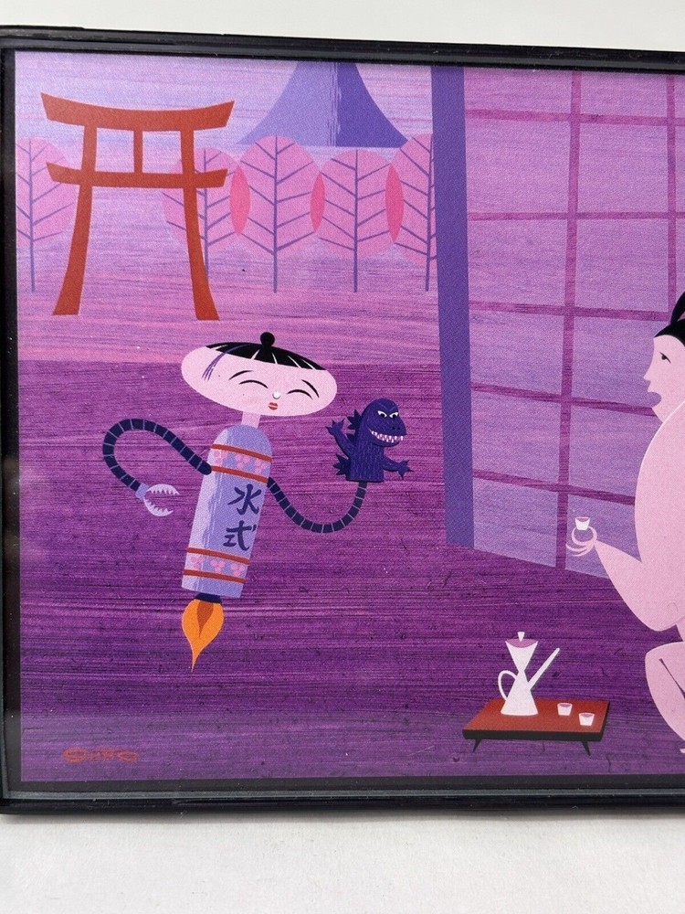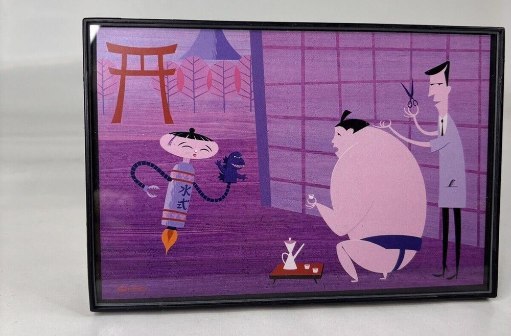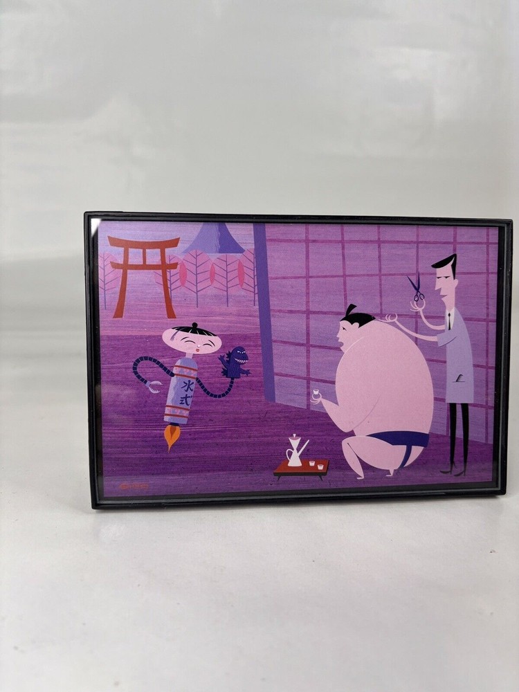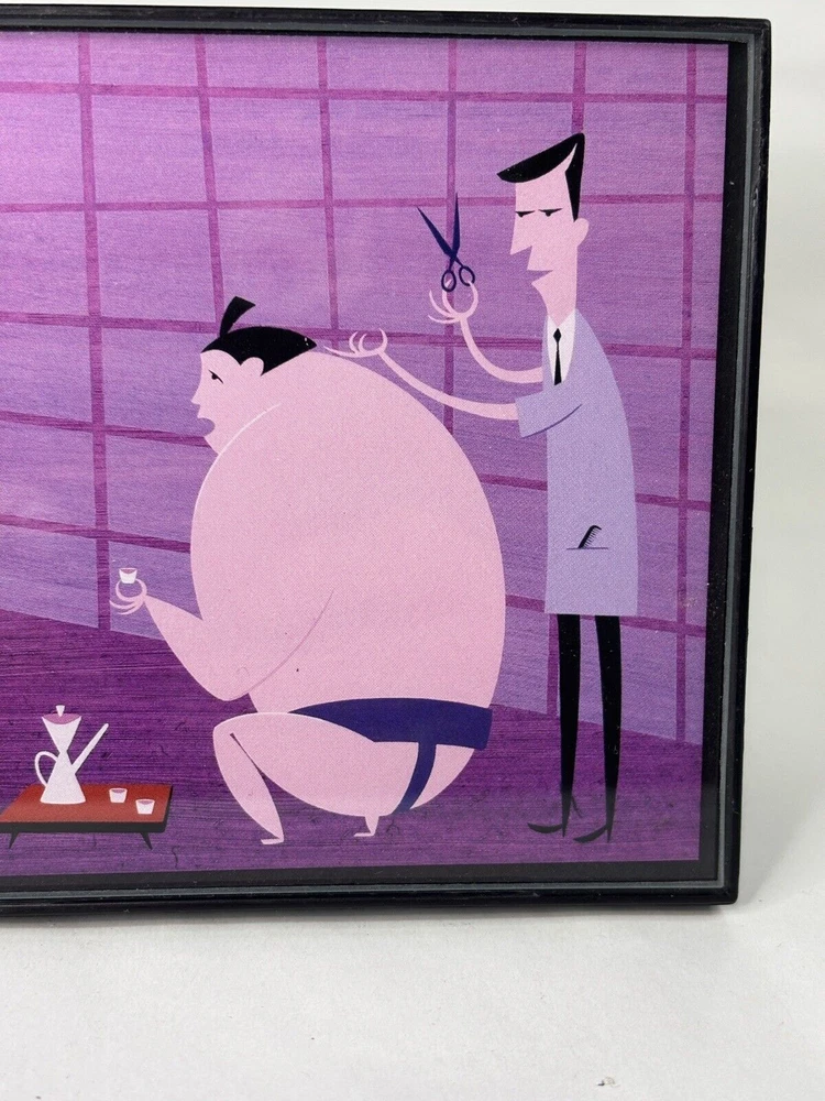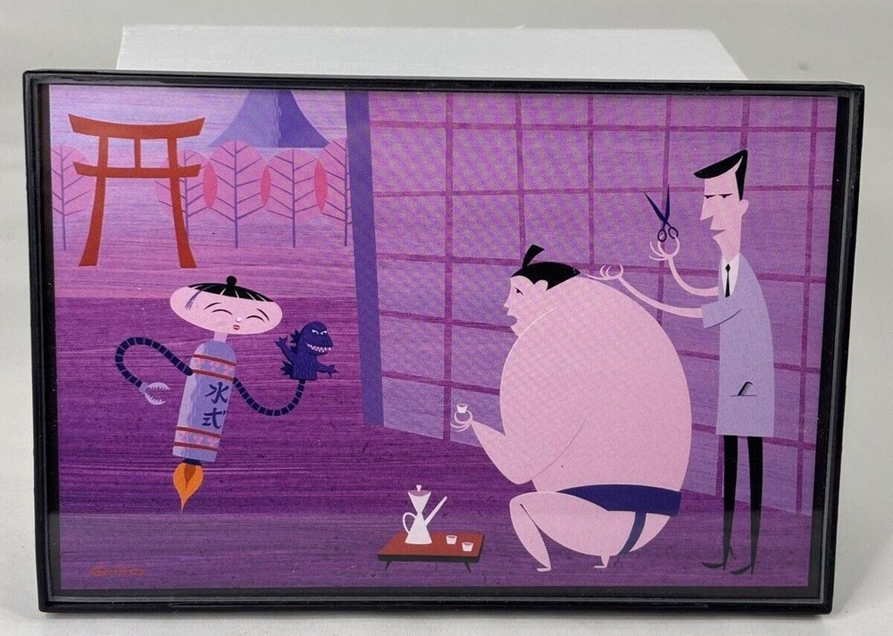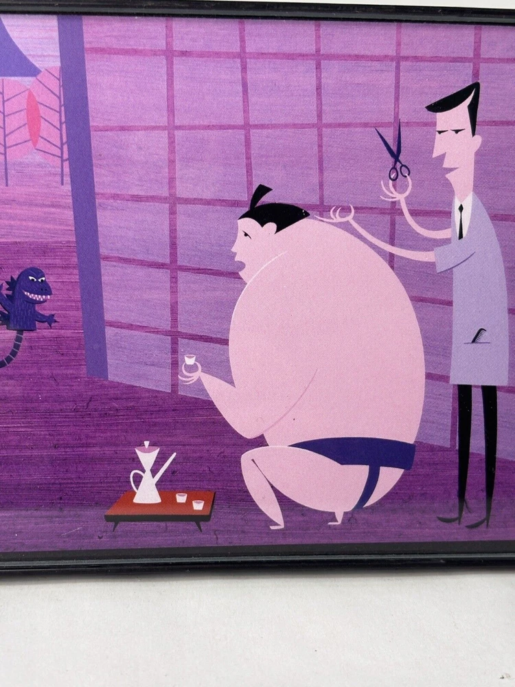 Shag Card Framed Sumo Wrestler getting hair cut by Barber while sipping on Tea Child like Robot with Godzilla Hand Puppet Measures 4" x 6" Tiki Artist Mid Century Modern Art Josh Agle...