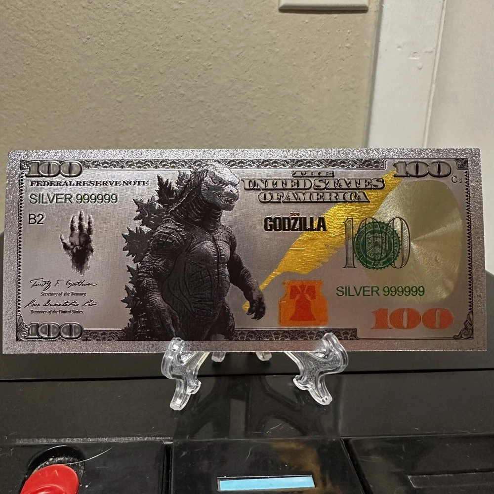 Silver Foil Plated Godzilla Banknote Set (Not real currency) Includes 4 banknotes - also sold separately Amazing quality! Pictures do not do these justice, what you see in person is amazing! So much detail and shine in each one. You will be very happy with what you see. Stand not included Great gift for any collector or Godzilla Movie fan! Unique gift. Great stocking stuffer. Perfect for birthdays/baby showers/Christmas/Graduation and more! View my page for many more options and tons of characters and styles. Will bundle!