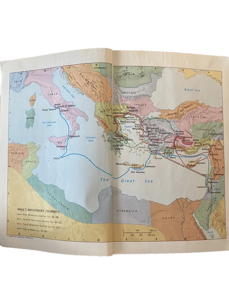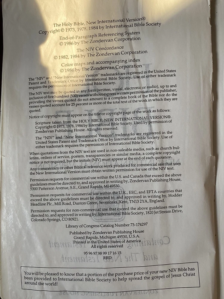 Soft cover leather like cover Bible NIV maps Zondervan 1973, 1978, 1994 has maps of Holy Land binding is a bit separated in areas...