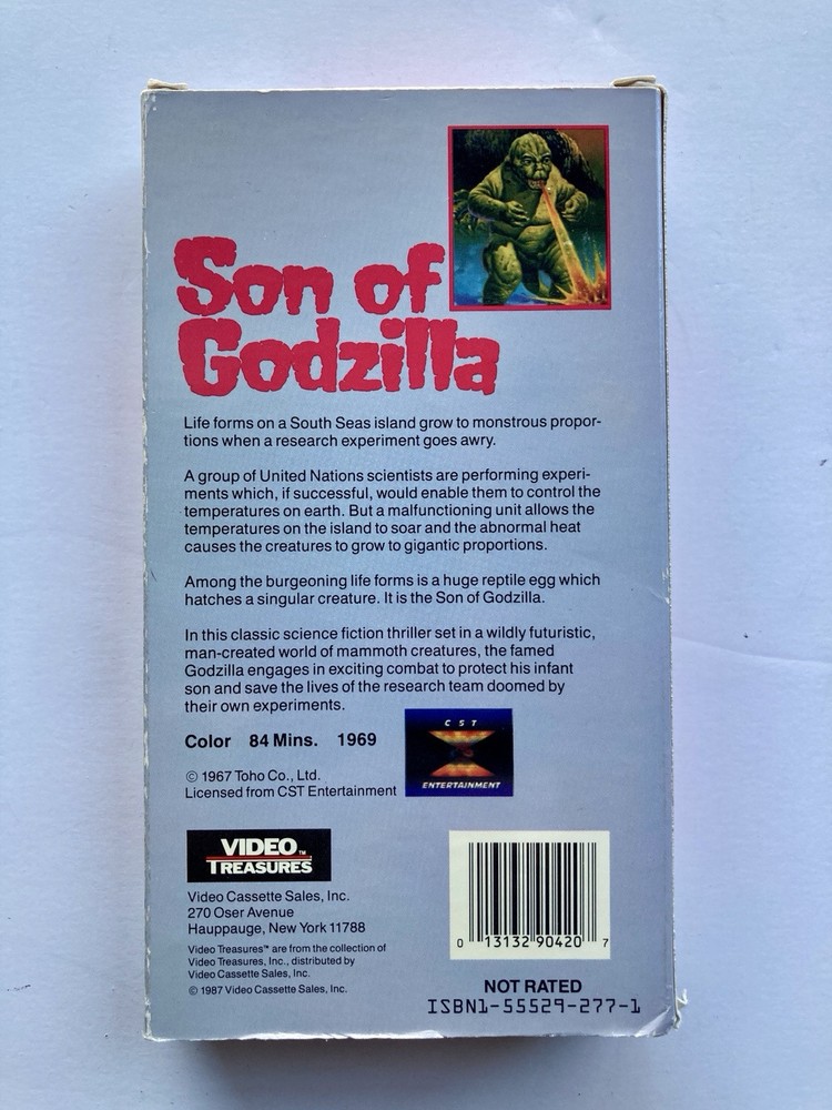 "Son of Godzilla" is a rare 1987 VHS release by Video Treasures in English and Japanese. It is a monster movie in the creature sub-genre, rated NR. The signal standard is NTSC for this vintage film. S...