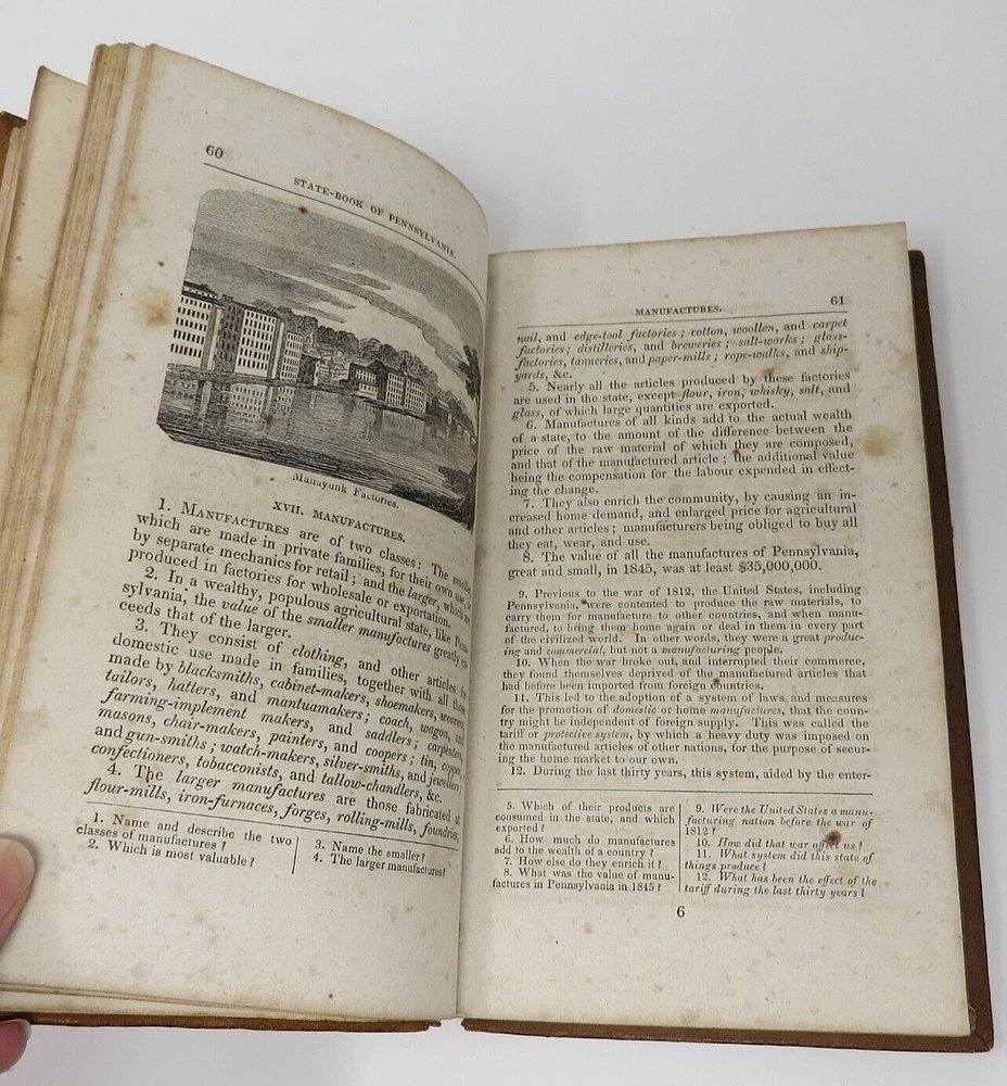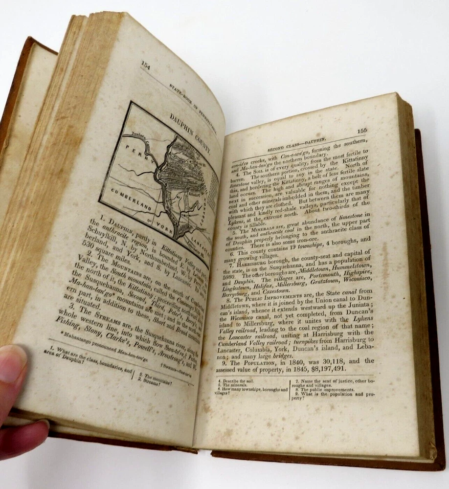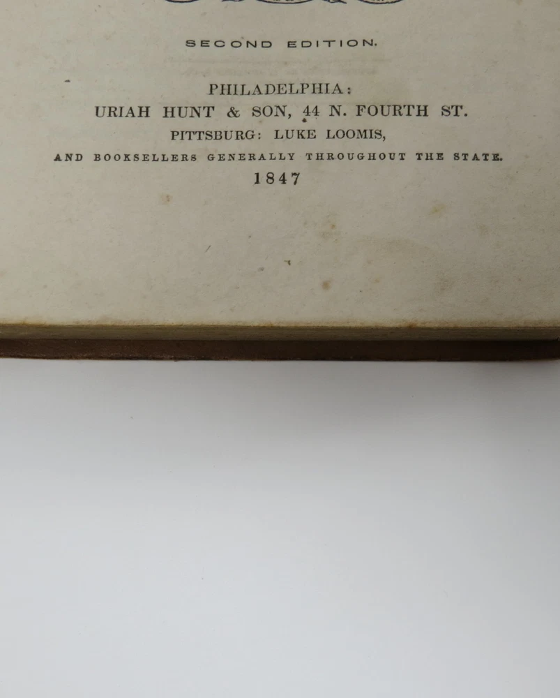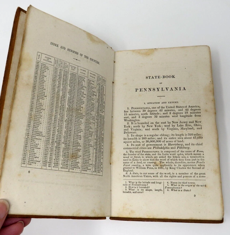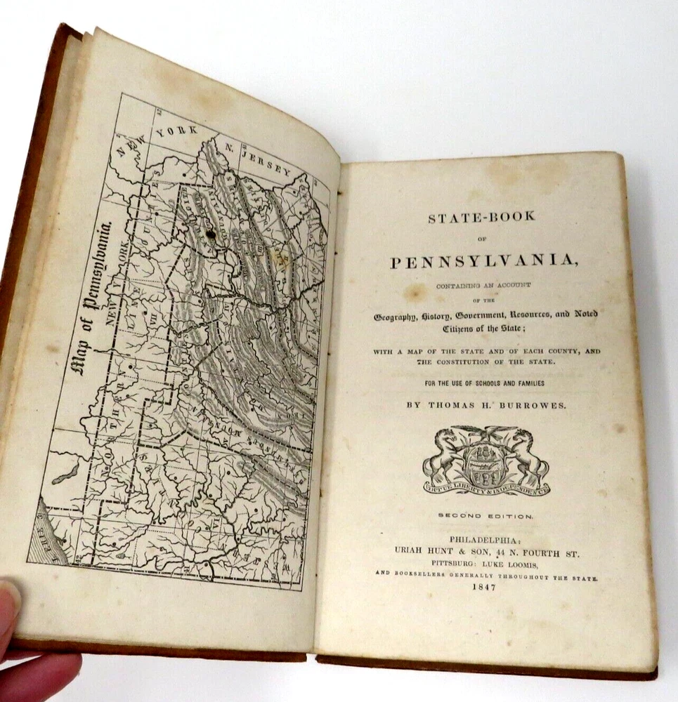 State-Book of Pennsylvania Containing an Account of the Geography, History, Government, Resources, and Noted Citizens of the State With a Map of the State and of Each County, and the Constitution of the State by Thomas H. Burrowes Philadelphia: Uriah Hunt & Son, 1847. Second Edition. 4 7/8 x 8 inches. 332 plus 3 pp “Recommendatory Notices and Resolutions.” Frontispiece is a map of Pennsylvania. Illustrated primarily with maps of the counties. Leather-bound. Solid binding. Front cover has minor soiling, minor chipping to title on spine, 2.5-inch x ¾-inch soiled area on back cover. Interior is overall pretty clean with foxing throughout. 1-inch tear to front end paper.