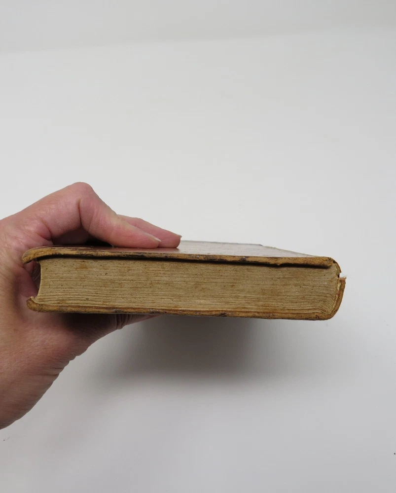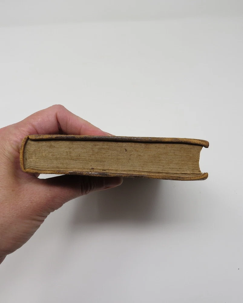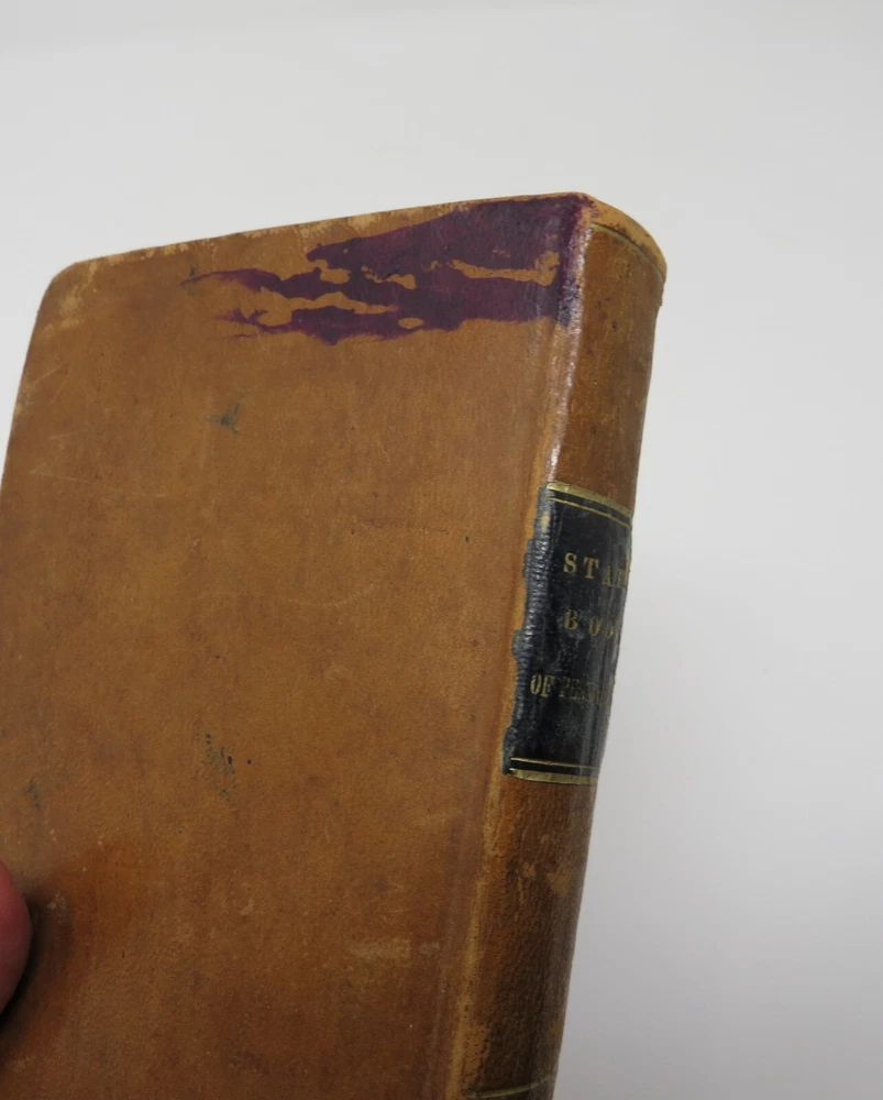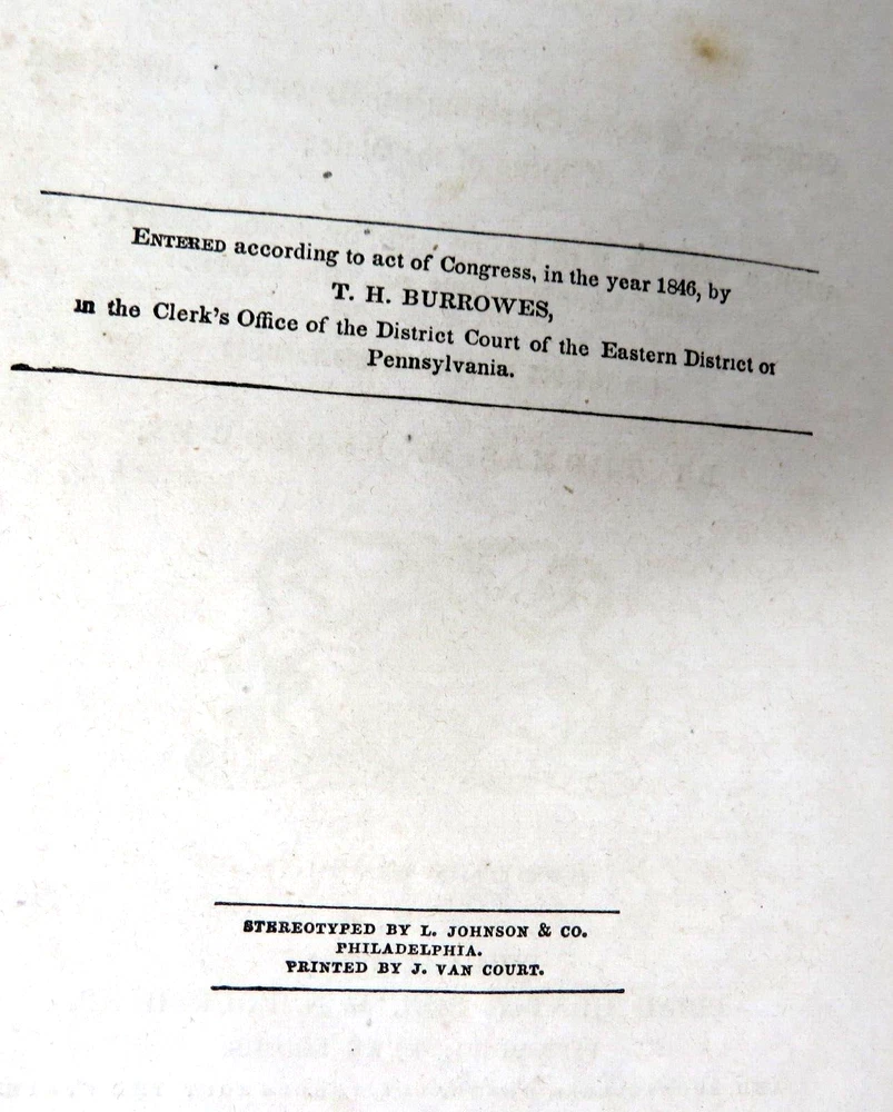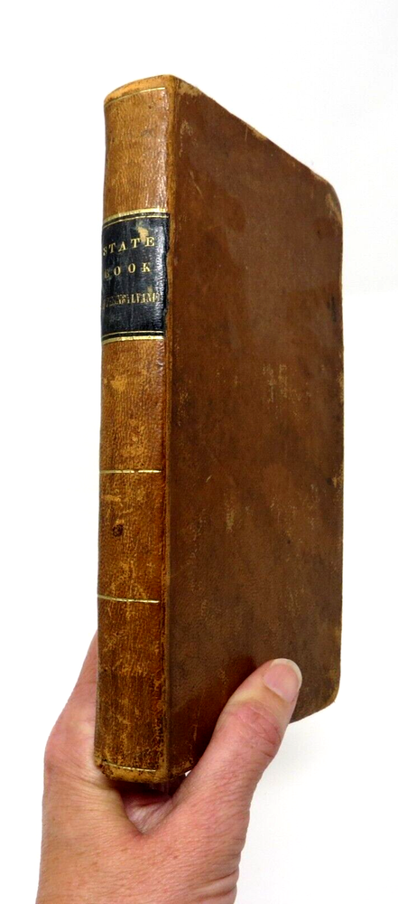 State-Book of Pennsylvania Containing an Account of the Geography, History, Government, Resources, and Noted Citizens of the State With a Map of the State and of Each County, and the Constitution of the State by Thomas H. Burrowes Philadelphia: Uriah Hunt & Son, 1847. Second Edition. 4 7/8 x 8 inches. 332 plus 3 pp “Recommendatory Notices and Resolutions.” Frontispiece is a map of Pennsylvania. Illustrated primarily with maps of the counties. Leather-bound. Solid binding. Front cover has minor soiling, minor chipping to title on spine, 2.5-inch x ¾-inch soiled area on back cover. Interior is overall pretty clean with foxing throughout. 1-inch tear to front end paper.