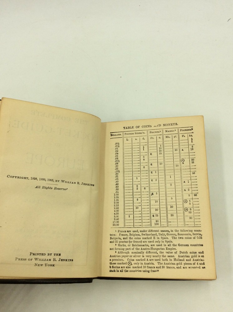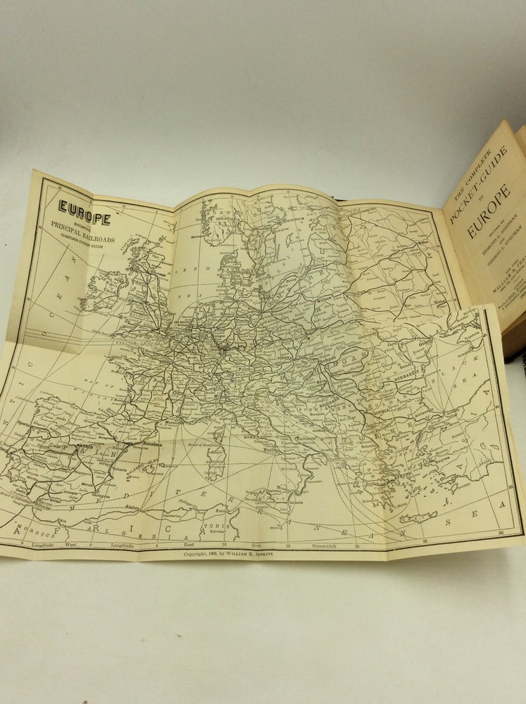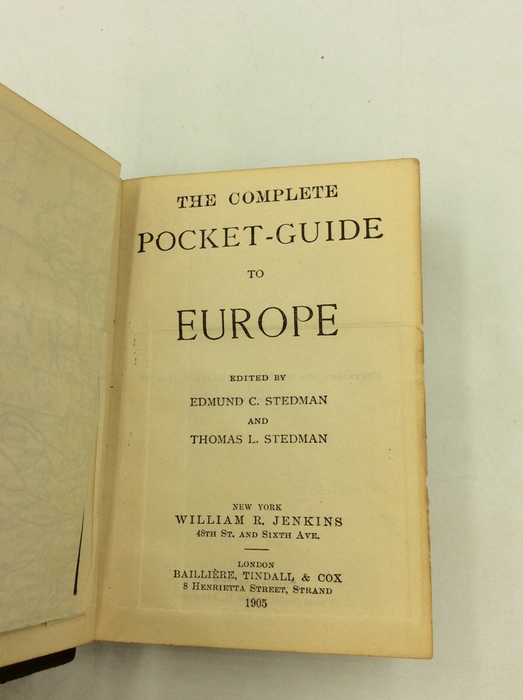 Edmund C. Stedman and Thomas L. Stedman, eds. THE COMPLETE POCKET-GUIDE TO EUROPE New York/London: William R. Jenkins/Bailliere, Tindall & Cox, 1905. Leather. 505p. A small, flexible hardcover book bound in black leather. Very good condition overall. Edges and spine visibly rubbed. Old owners' signatures on front endpaper. Folding frontispiece is torn. Otherwise, text clean and binding secure. Item #174649 A turn-of-the-century European travel guide featuring two folding maps. Measures approx. 5.2" x 3.75"