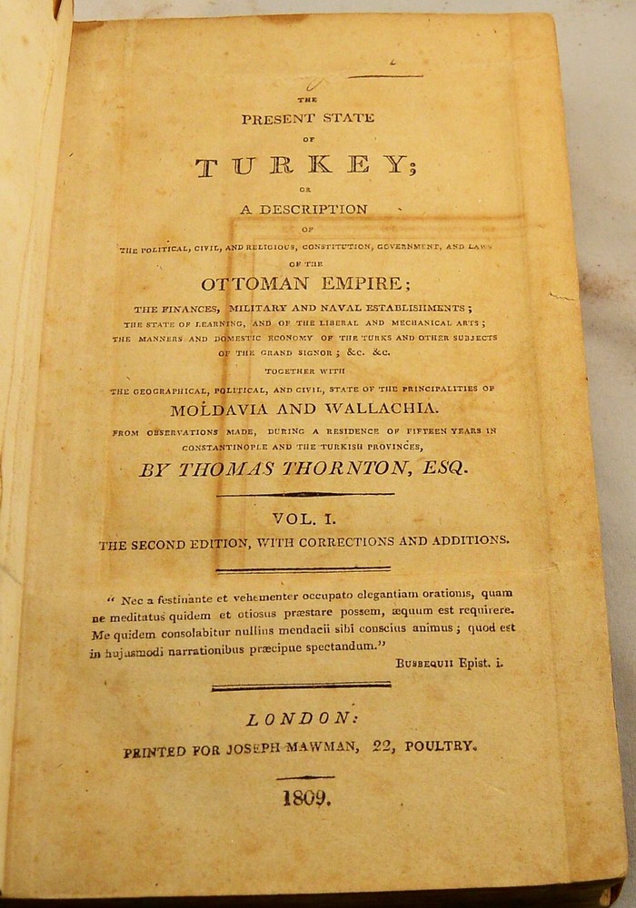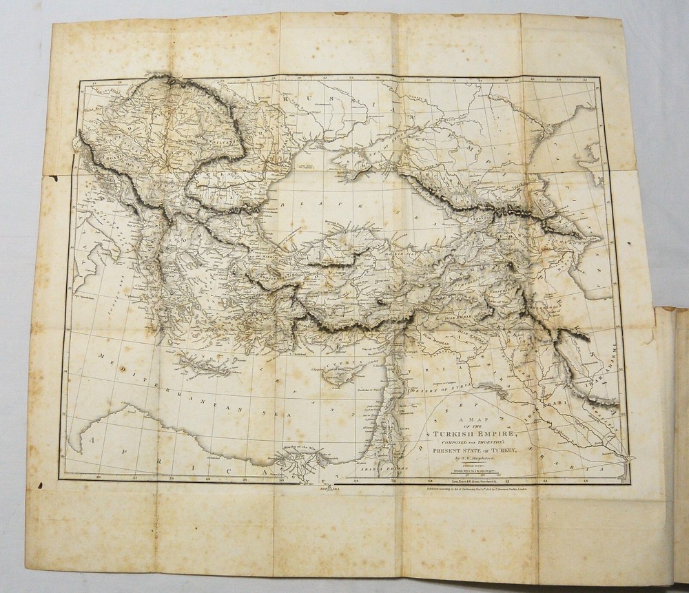 THE PRESENT STATE OF TURKEY 1809 Second Edition with corrections and additions with 304 pages, foldout map of Turkish Empire and foldout of Constantinople. This is Volume I only. Very Scarce Hard cover binding is worn covers are detached. Contents are tight and in good condition.