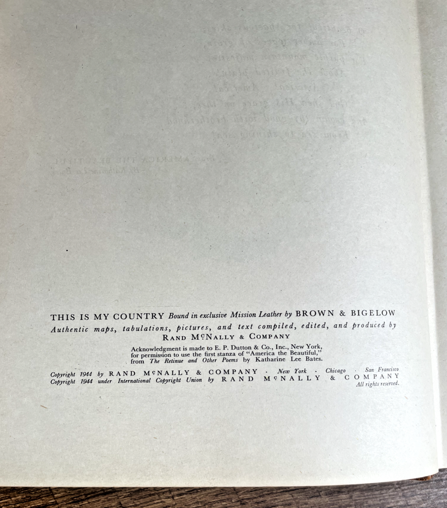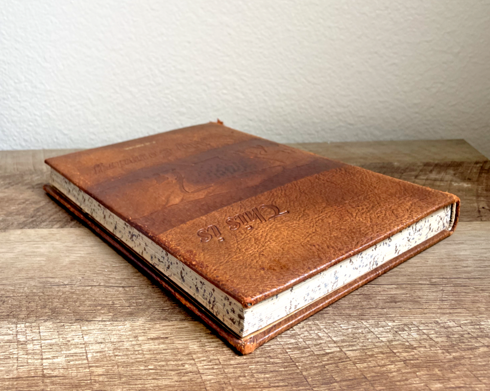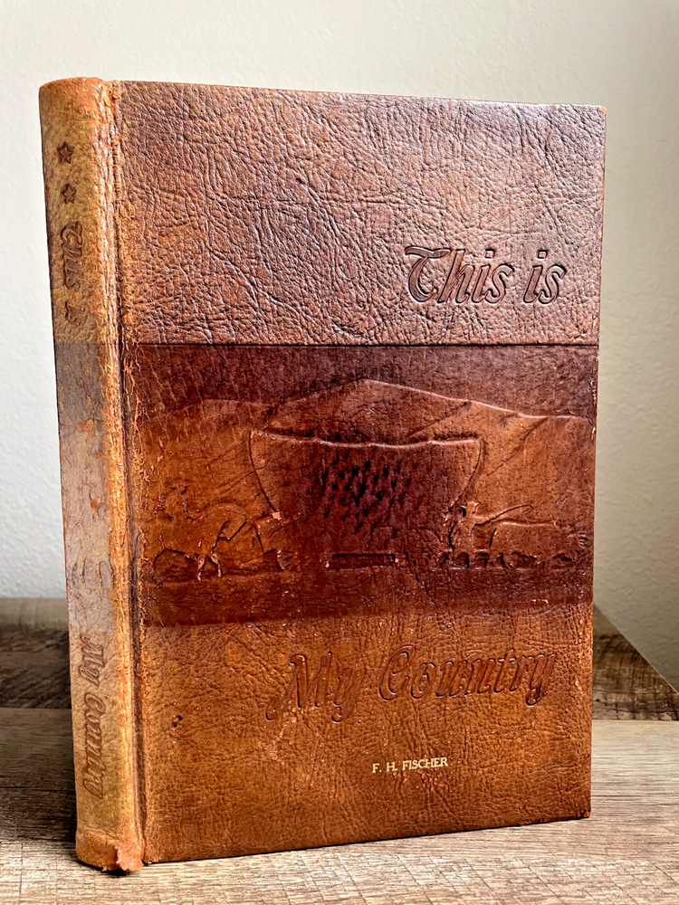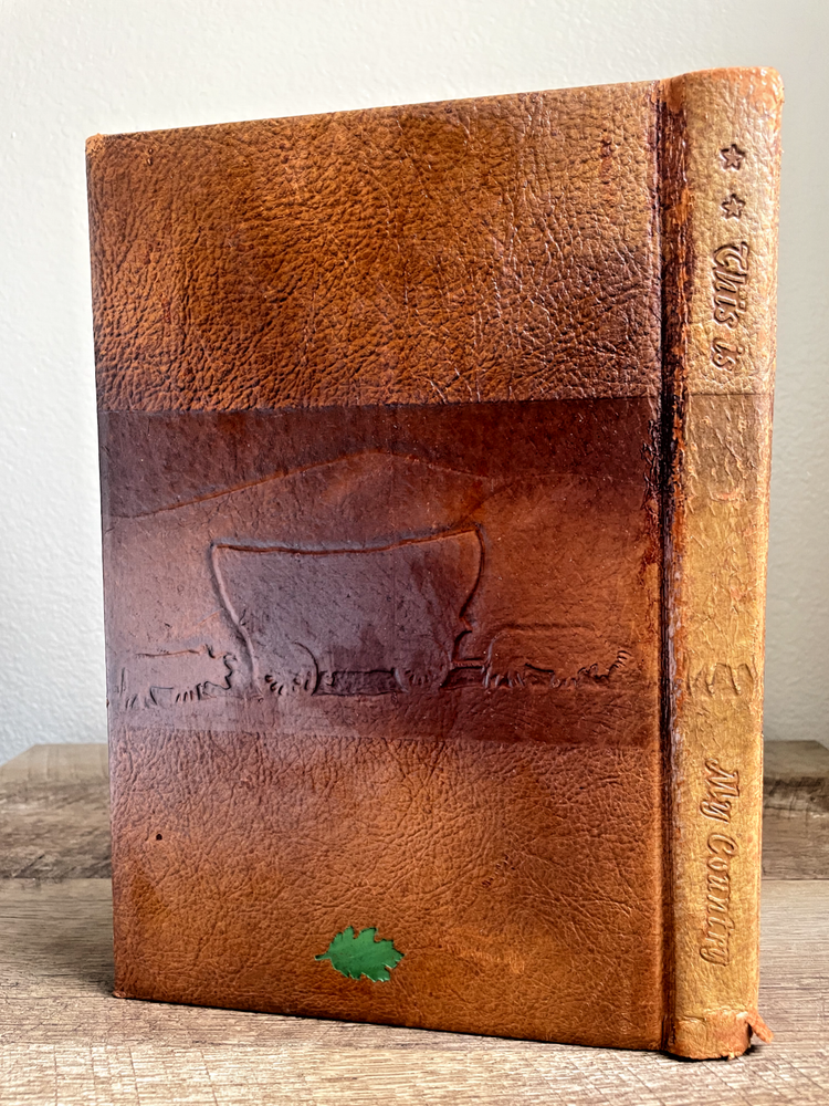 This Is My Country Rand McNally & Company (1944, Mission Leather Binding, Illustrated) Published in 1944, This Is My Country is a richly illustrated atlas that captures the essence of the United States during the mid-20th century. Compiled and produced by Rand McNally & Company, the book offers a comprehensive overview of the 48 states (prior to the admission of Alaska and Hawaii), featuring detailed maps, statistical data, photographs, and descriptive texts. Key Features: Mission Leather Binding: The edition is bound in exclusive Mission Leather by Brown & Bigelow, with the front cover embossed with imagery such as a covered wagon, horse, cowboy, and cow, reflecting the American frontier spirit. Illustrations and Decorations: The book includes illustrations and decorations by Elmer Jacobs, enhancing its visual appeal. Pictorial Map: A notable inclusion is a 26x39 inch fold-out pictorial map of the United States, designed by Elmer Jacobs, housed in a pocket at the rear board. Condition: Hardcover in good condition. The leather binding shows some wear, particularly along the spine; pages are clean and unmarked; binding is tight. Please see photos for visual inspection.