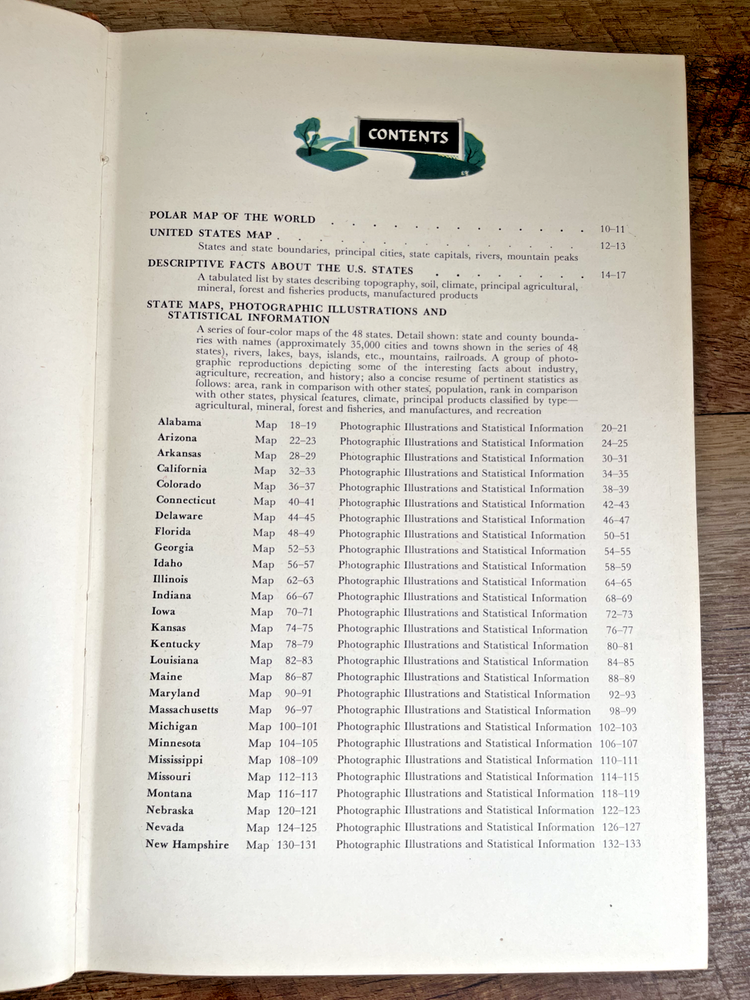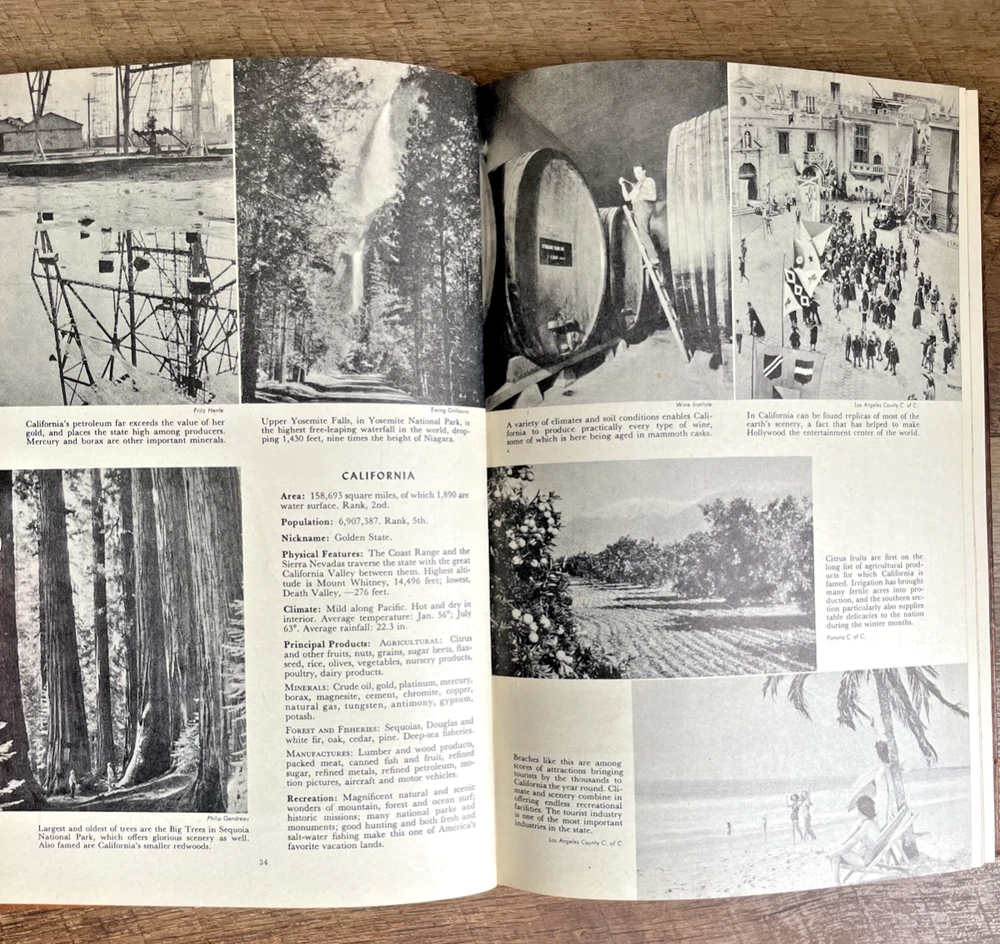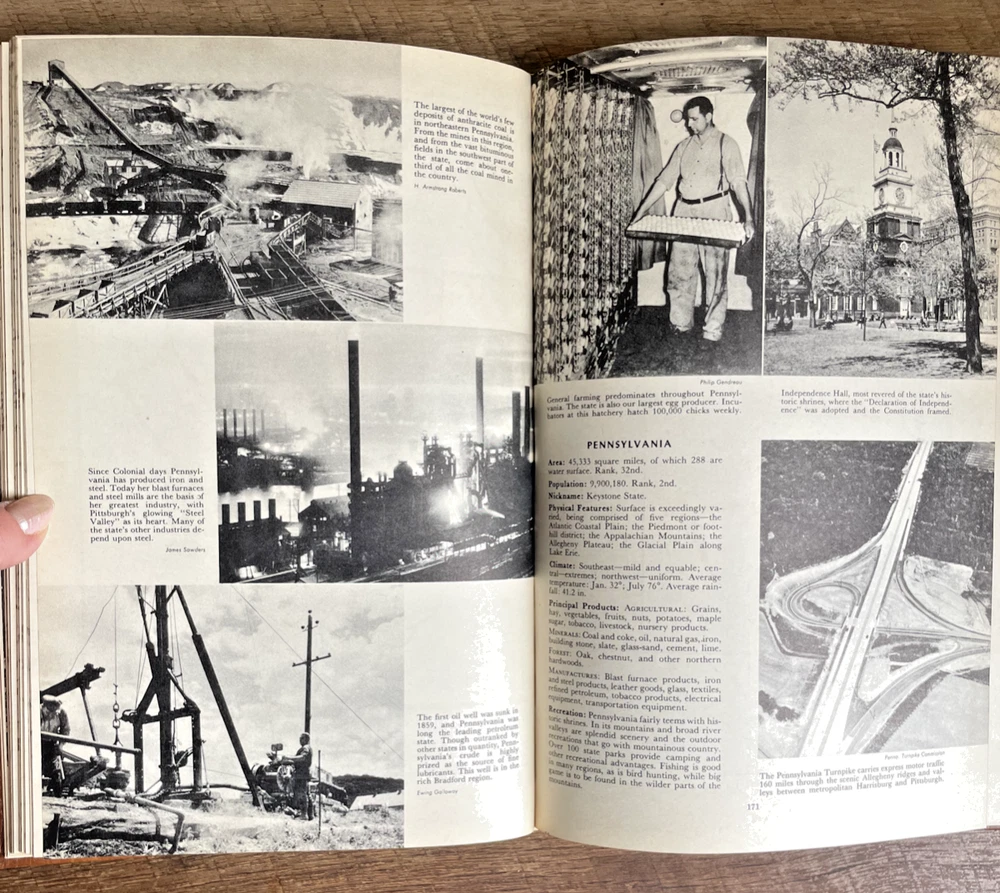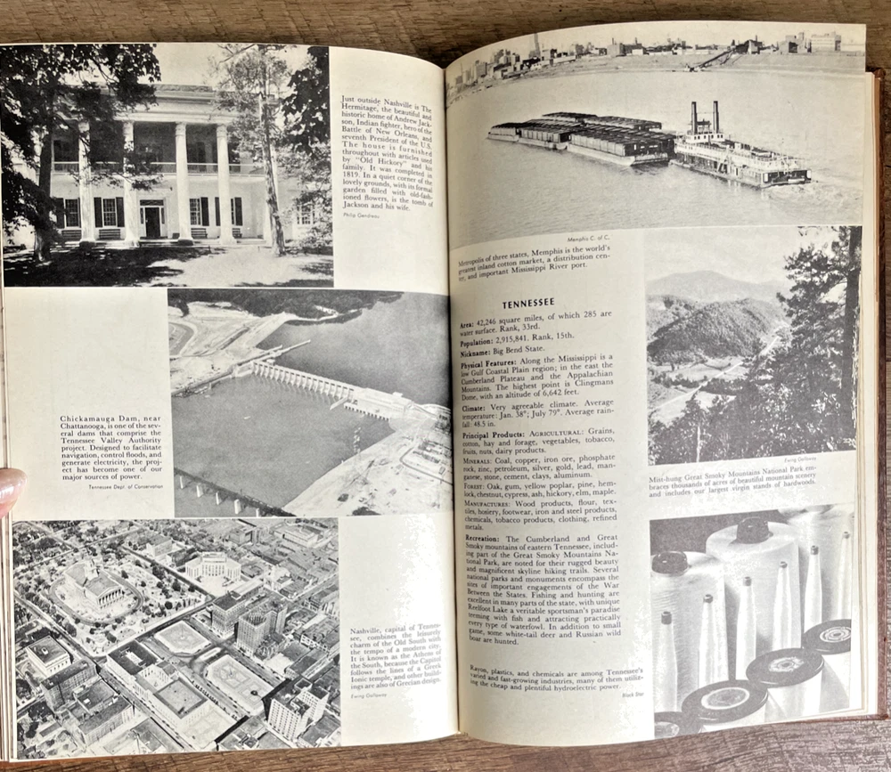 This Is My Country Rand McNally & Company (1944, Mission Leather Binding, Illustrated) Published in 1944, This Is My Country is a richly illustrated atlas that captures the essence of the United States during the mid-20th century. Compiled and produced by Rand McNally & Company, the book offers a comprehensive overview of the 48 states (prior to the admission of Alaska and Hawaii), featuring detailed maps, statistical data, photographs, and descriptive texts. Key Features: Mission Leather Binding: The edition is bound in exclusive Mission Leather by Brown & Bigelow, with the front cover embossed with imagery such as a covered wagon, horse, cowboy, and cow, reflecting the American frontier spirit. Illustrations and Decorations: The book includes illustrations and decorations by Elmer Jacobs, enhancing its visual appeal. Pictorial Map: A notable inclusion is a 26x39 inch fold-out pictorial map of the United States, designed by Elmer Jacobs, housed in a pocket at the rear board. Condition: Hardcover in good condition. The leather binding shows some wear, particularly along the spine; pages are clean and unmarked; binding is tight. Please see photos for visual inspection.