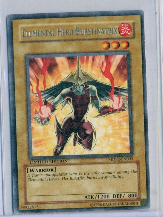 THIS AUCTION IS FOR A TRADING CARD YU-GI-OH ELEMENTAL HERO BURSTINATRIX WARRIOR ATK/1200 DEF/800 KONAMI 1996 - KAZUKI TAKAHASHI FEEDBACK Please feel free to ask any questions before bidding I try very hard to be fair and honest and to give you very good customer service and strive for a 5 star rating If you have any problems with any of your items - please contact me before leaving feedback - I will definitely try to make things right THANKS FOR LOOKING AND CONSIDERING MY AUCTIONS - GOOD LUCK!