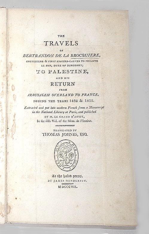The Travels of Bertrandon De La Brocquiere, Counsellor & First Esquire-Carver to Phillipe Le Bon, Duke of Burgundy, To Palestine and His Return From Jerusalem Overland to France, During the Years 1432 & 1433. Extracted and put into modern French from a Manuscript in the National Library at Paris, and published by M. Le Grand D'Aussy, in the ninth Vol. of the Mem. de L'Institut. Translated by Thomas Johnes, Esq., published at the Haford Press, Haford, Shropshire, by James Henderson, in 1807. First English edition. Illustrated with a folding map of Tartary and one plate in the dedication to his late sister. 8vo, full leather, with armorial device embossed on the covers, and publisher's device at the end of the text. Text block clean, with minor signs of usage. Four leaves loose before the title page, including ffep with Beecher book plate, half-title page, and folding map. Spine rubbed. Both boards detached. Rare book, with no copies I could find of this or any other early edition offered for sale on line. The author was a secret agent, dispatched by the Duke to help instigate a new Crusade. TRAVELS OF BERTRANDON DE LA BROCQUIERE TO PALISTINE -1807 -LEATHER -TARTARY MAP TRAVELS OF BERTRANDON DE LA BROCQUIERE TO PALISTINE -1807 -LEATHER -TARTARY MAP Click images to enlarge Description The Travels of Bertrandon De La Brocquiere, Counsellor & First Esquire-Carver to Phillipe Le Bon, Duke of Burgundy, To Palestine and His Return From Jerusalem Overland to France, During the Years 1432 & 1433. Extracted and put into modern French from a Manuscript in the National Library at Paris, and published by M. Le Grand D'Aussy, in the ninth Vol. of the Mem. de L'Institut. Translated by Thomas Johnes, Esq., published at the Haford Press, Haford, Shropshire, by James Henderson, in 1807. First English edition. Illustrated with a folding map of Tartary and one plate in the dedication to his late sister. 8vo, full leather, with armorial device embossed on the covers, and publisher's device at the end of the text. Text block clean, with minor signs of usage. Four leaves loose before the title page, including ffep with Beecher book plate, half-title page, and folding map. Spine rubbed. Both boards detached. Rare book, with no copies I could find of this or any other early edition offered for sale on line. The author was a secret agent, dispatched by the Duke to help instigate a new Crusade. Payment Payment, as per eBay instructions, is by PayPal only, unless it is absolutely essential that another payment method be used. Shipping Shipping charges are for shipping only. There is no handling fee. In most cases USPS will be chosen. All fragile items will be double boxed, which, in the case of larger items, might result in the shipper charging a fee for an oversized package. Books will be sent Media rate in the US, unless otherwise requested. Terms of Sale Items can be returned within 30 days of sale, postage free for domestic sales, customer-paid shipping for international sales unless the item is shown to be not as described. About Us Freedonia is an eBay auction site for Water Street Antiques, long established in Wiscasset, Maine. We have been selling on-line for more than 20 years, and have been in the trade for over 40. The Freedonia listing site offers, as does our shop, a variety of goods in fields as varied as tribal Art, books, tools, orientalia, Americana, nautical and vintage household items. We attempt to describe our listings with great care, hoping that there are no suprises for the purchaser. Sometimes our thorough descriptions make the object sound worse than it is. If you wish more detail concerning an item feel free to contact us. Images sell! Get Supersized Images & Free Image Hosting Create your brand with Auctiva's Customizable Templates. Attention Sellers - Get Templates Image Hosting, Scheduling at Auctiva.com. Track Page Views With Auctiva's Counter