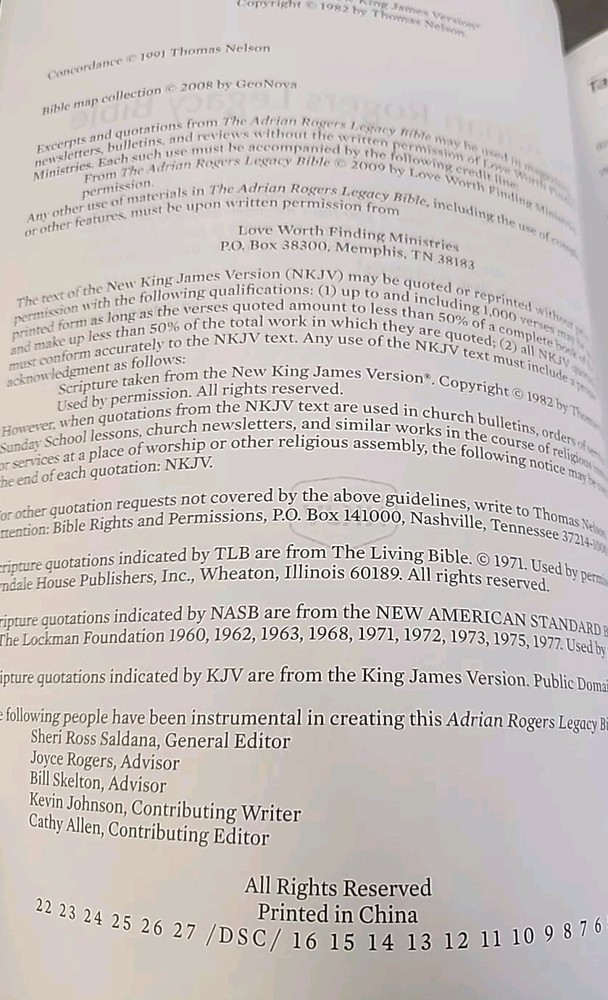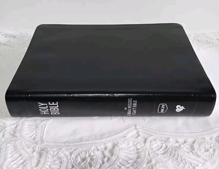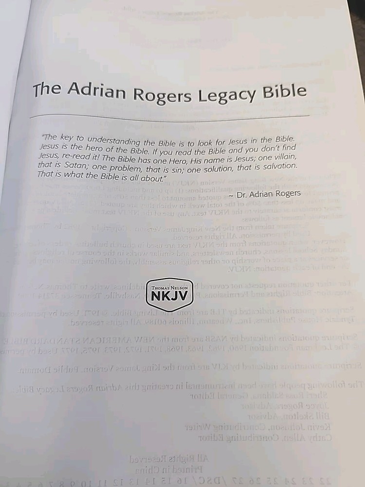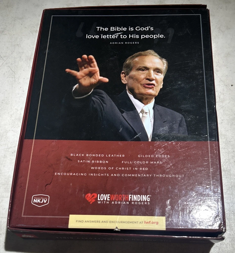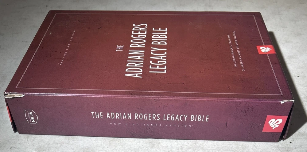 The Adrian Rogers Legacy Bible is a black bonded leather Bible with Christ's words in red. It features a leather bound cover, full color maps, silver gilded edges, and a satin ribbon. Published in 2009 by Thomas Nelson, this NKJV edition contains 1574 pages and is authored by Adrian Rogers. This Bible is a spiritual and religious nonfiction book with a focus on spirituality and religious content.