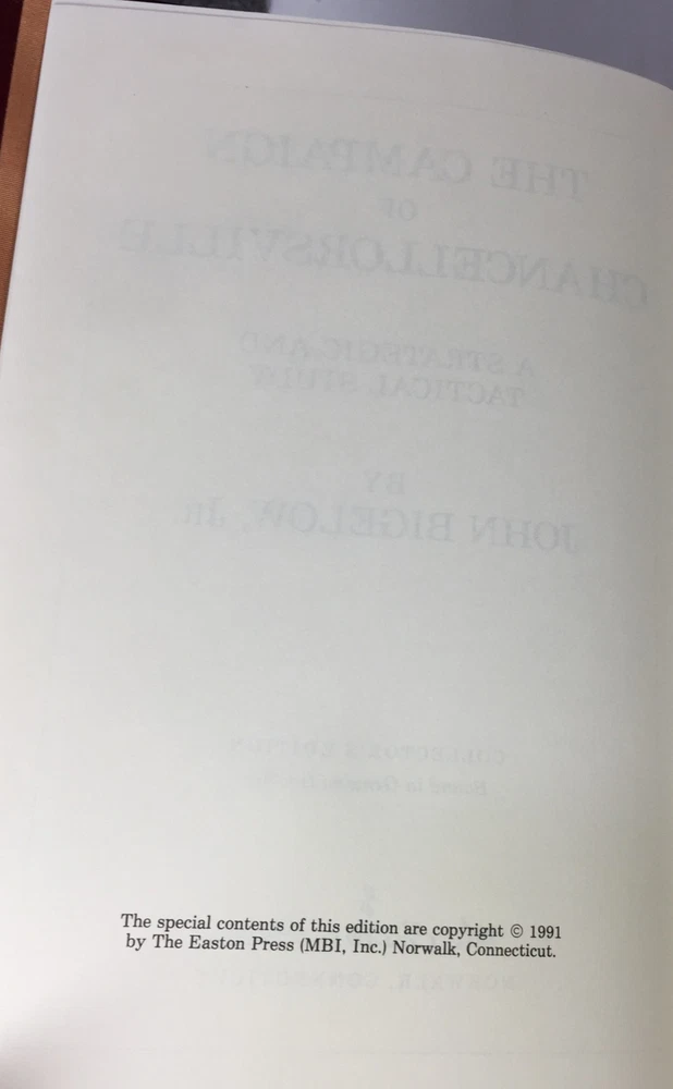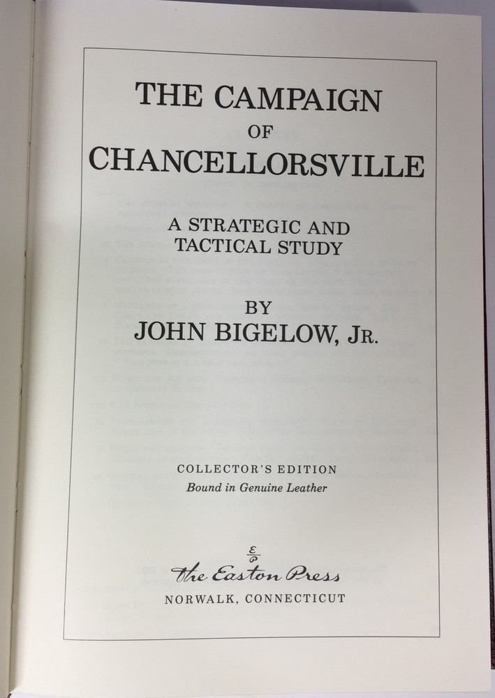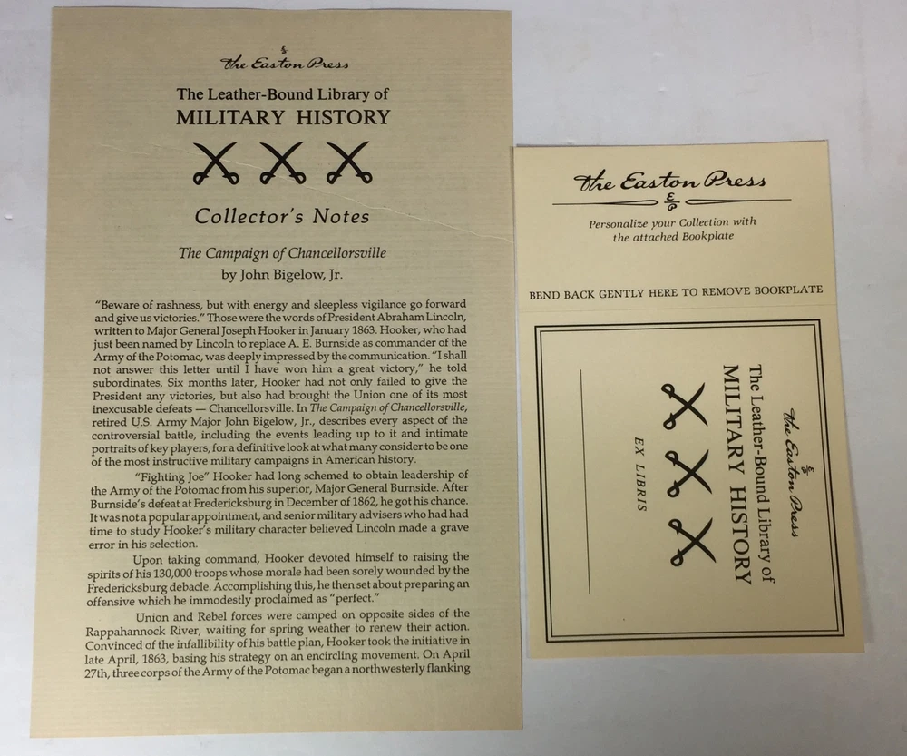 The Campaign of Chancellorsville by John Bigelow, Jr., Easton Press, 1991 The Campaign of Chancellorsville by John Bigelow, Jr., Easton Press, 1991 Plus Maps! The Campaign of Chancellorsville, A Strategic and Tactical Study by John Bigelow, Jr. Part of the The Library of Military History collection of The Easton Press, Norwalk, Connecticut, 1991. Includes Collector's Notes. This includes a rare set of The Campaign of Chancellorsville Maps, Sketches and Plans! This is not part of the Easton Press book but an additional bonus. This book is in excellent, unread condition. The Easton Press books are bound in genuine leather binding, with 22kt gold accents and hubbed spines, gilded page ends, acid-neutral paper, Moire fabric endsheets, and evocative illustrations and decorations. We will be happy to combine shipping, wherever possible. Some items cannot be combined because of their size, weight or because they are fragile. Please ask if you have any questions. Your order will ship by the next business day after receiving payment. All items are from a smoke-free environment. Thank you, and Happy Reading!