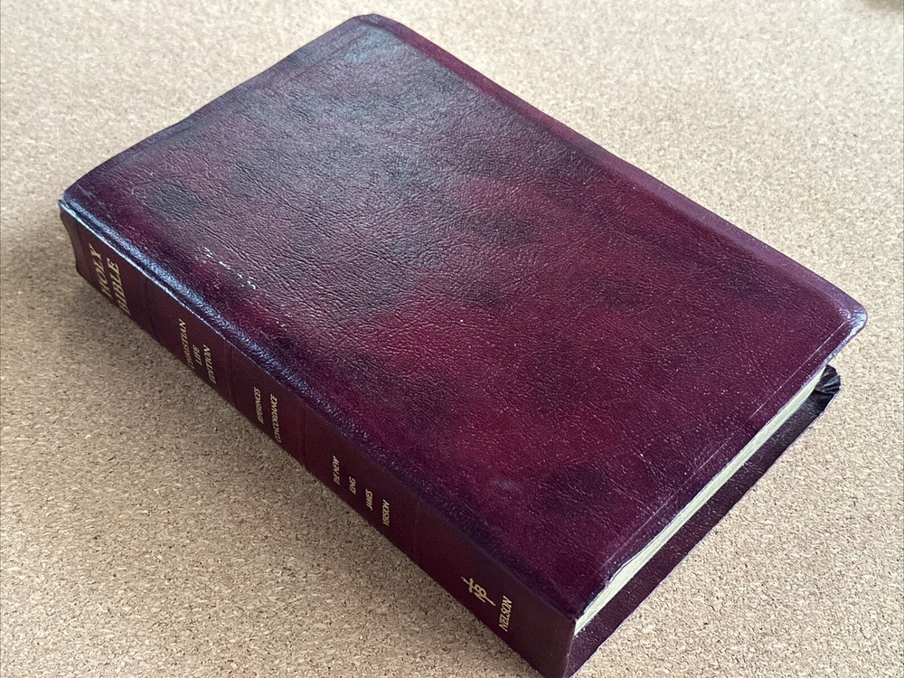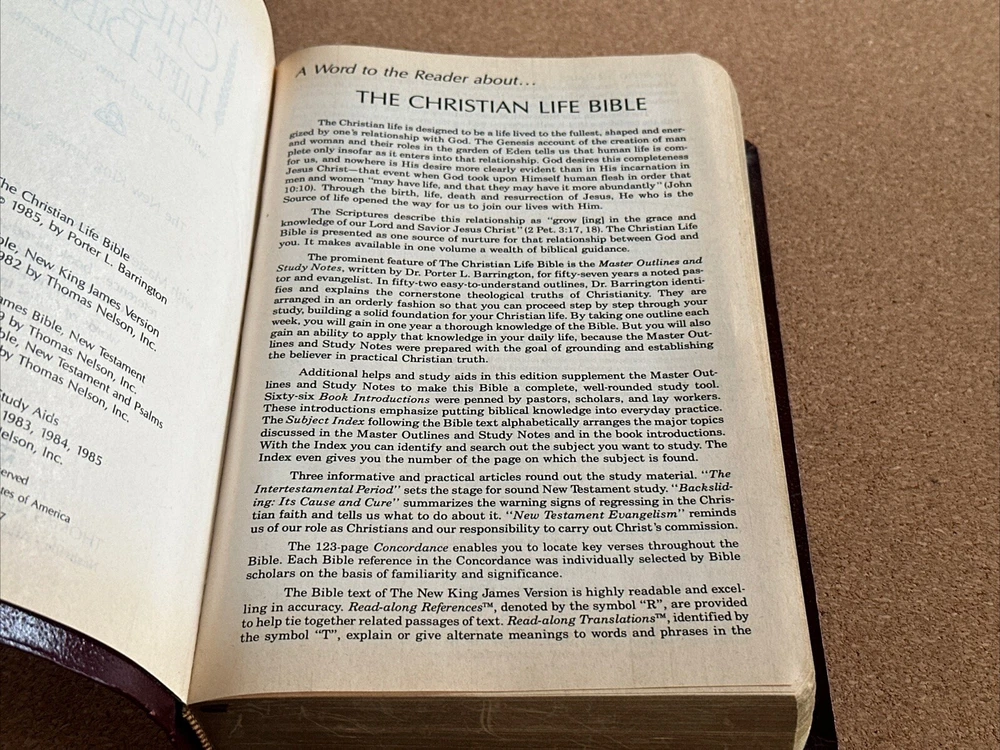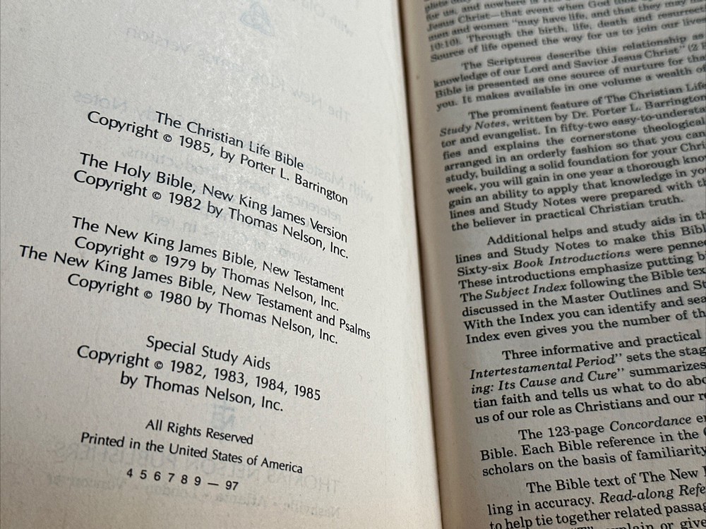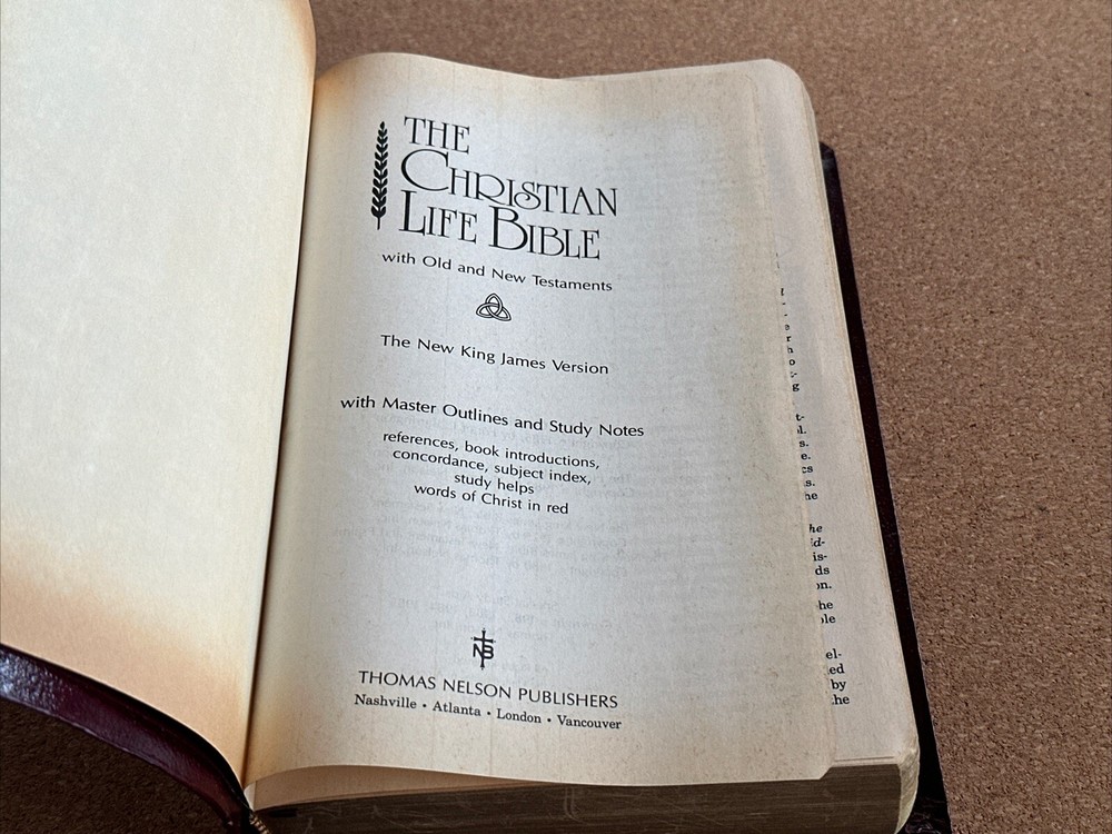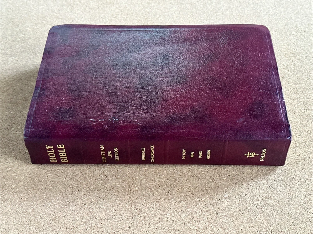 I have available a Christian Life Edition, New King James Version, Holy Bible. This also includes references and a concordance. This was published in 1985. Cover has lightly rubbed edges / corners, and some rubbed spots on the front that show as white. Pages have no rips or writing, there are a few pages in the back with some creases, see photos. The pages have also darkened. There are also a few tiny smudge marks. When the Bible is closed there is some light wear along the outer page edges. Overall, the Bible is still in good condition. Bible measures 6 1/2 inches across, by 9 3/4 inches in length, by 1 1/2 inches in depth. Please feel free to ask any questions. I only ship within the U.S. Thank you for viewing my auction.