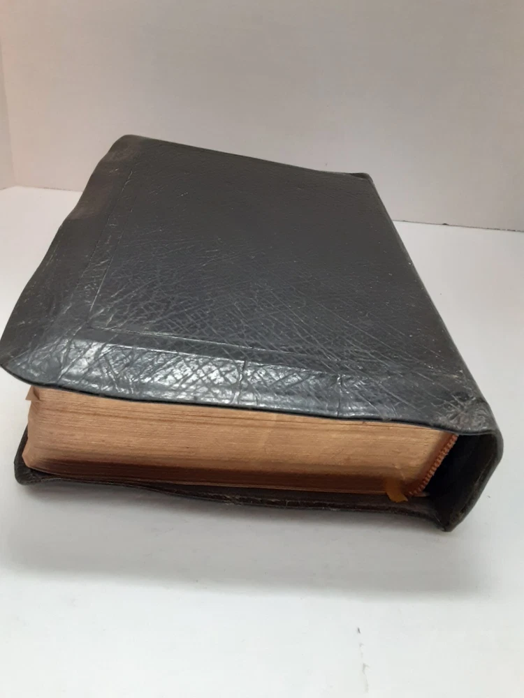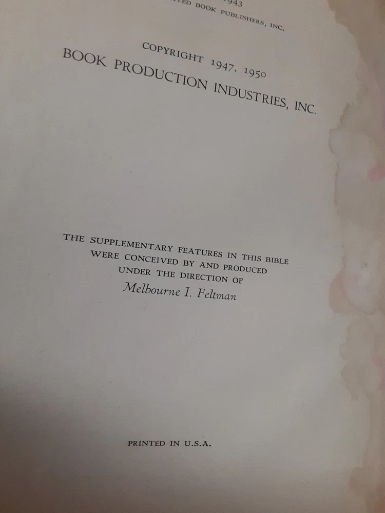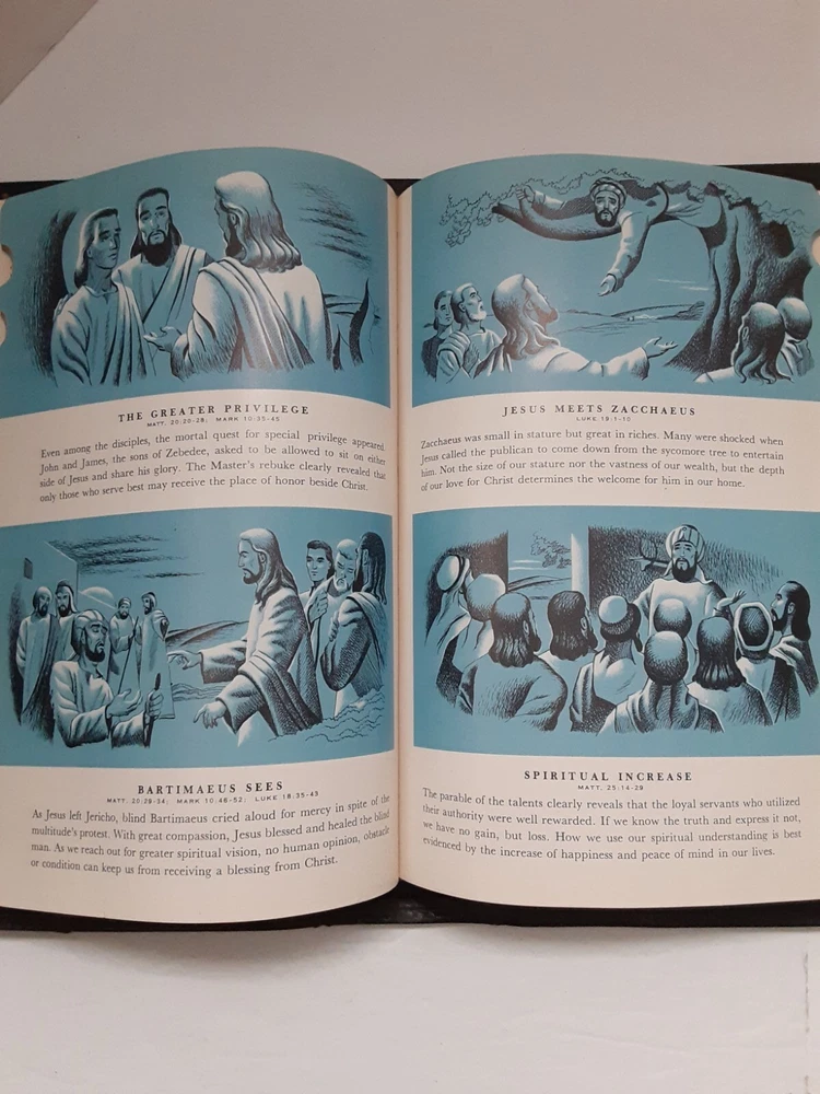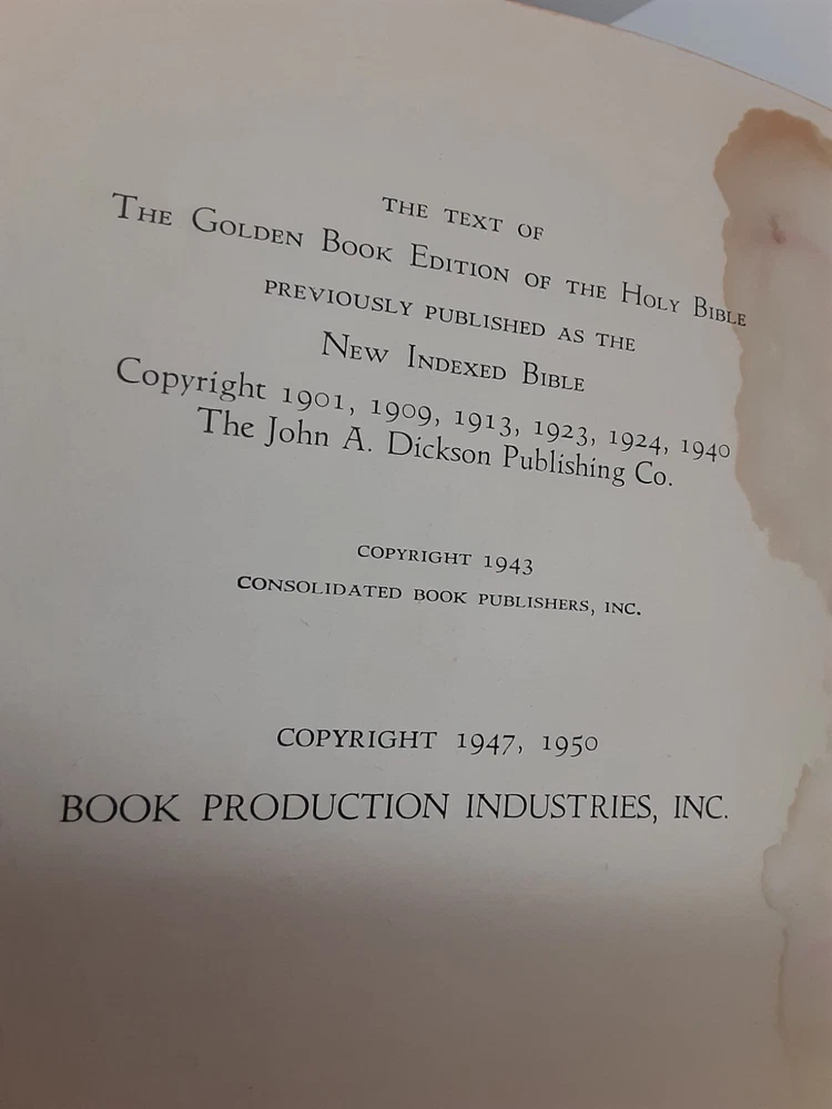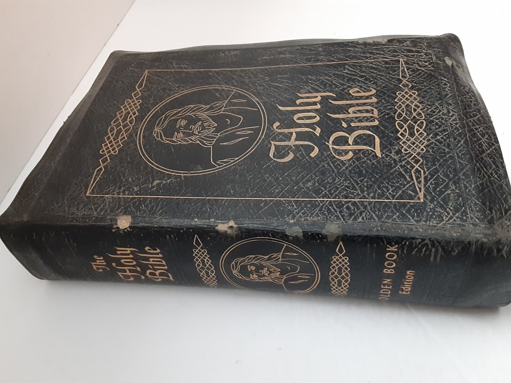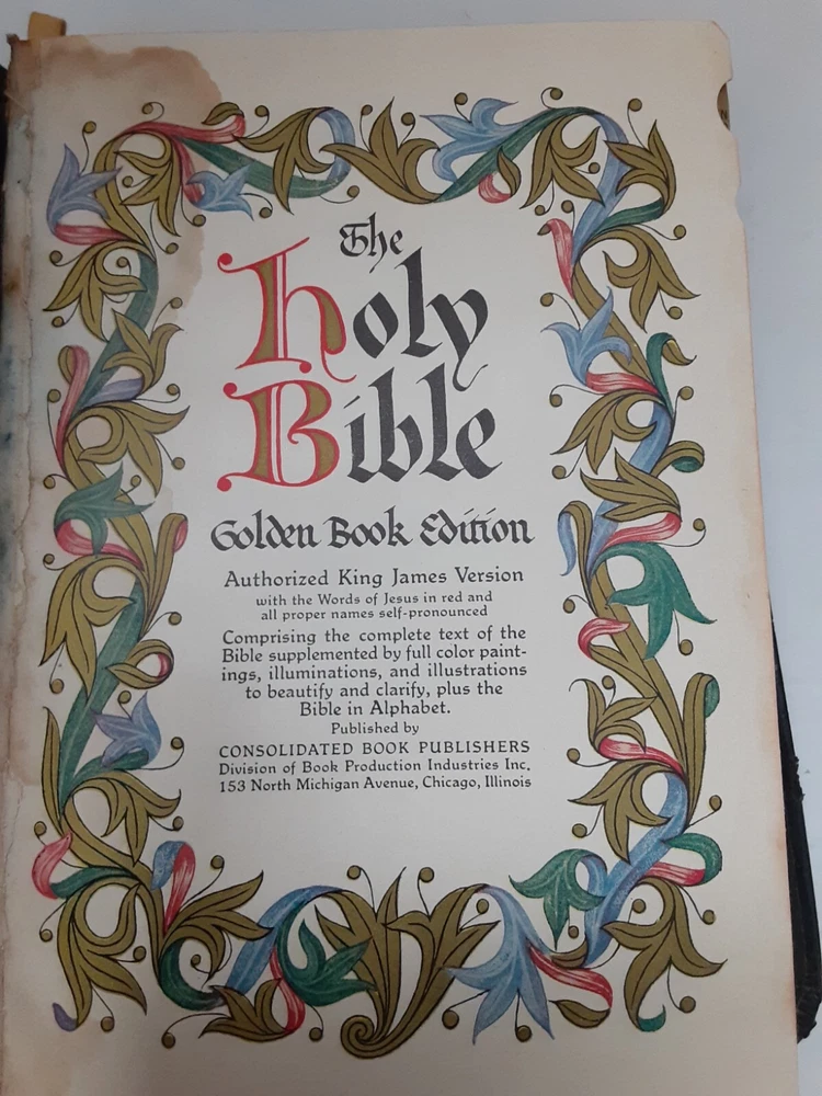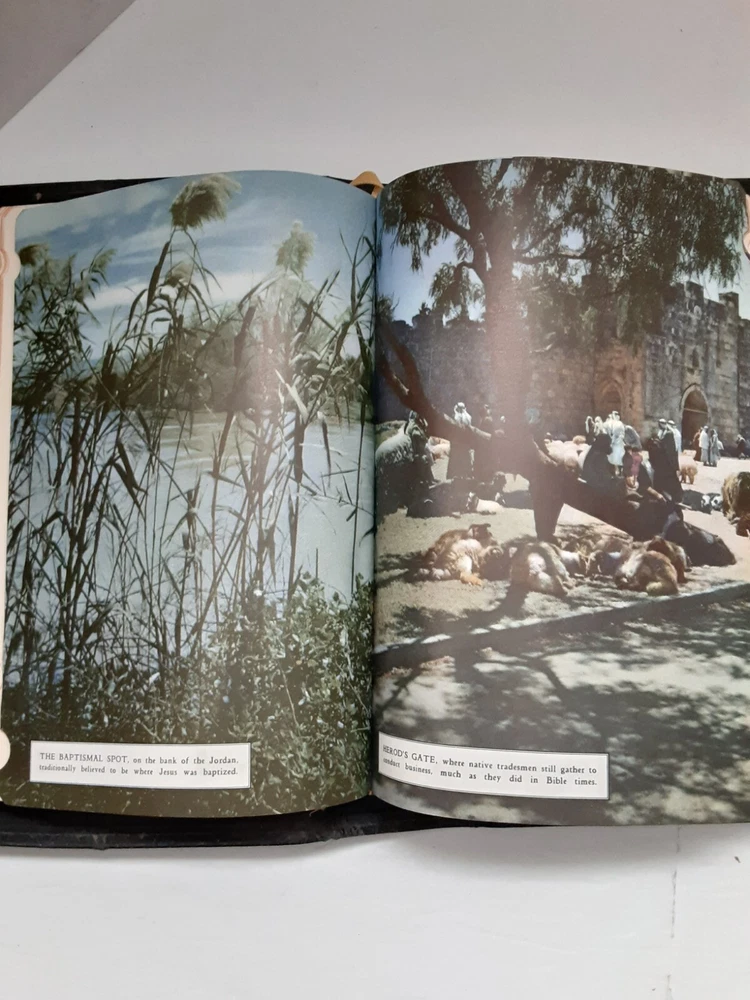 This vintage book is a must-have for anyone interested in the life of Jesus. Its leather-bound cover is adorned with gold edging, making it a beautiful addition to any collection. The book contains maps and illustrations, and is part of the Golden Book Edition series. Published in 1950 by Division of Book Production Industries, this book is in acceptable condition, with some wear and tear due to its age. Its dimensions are 6.75” length x 10” height x 2.25” width, and it weighs approximately 4.5 lbs. This book is in English and was originally written in English. It is an ex-library item with an ex libris stamp, but it has not been personalized. This book is intended for young adults, ages 9-12, and adults who are interested in the subject of religion. This Bible has some water staining on the inside as well as the outside of the binding is pulling away from the pages. No missing pages and no writing. This is still very legible.