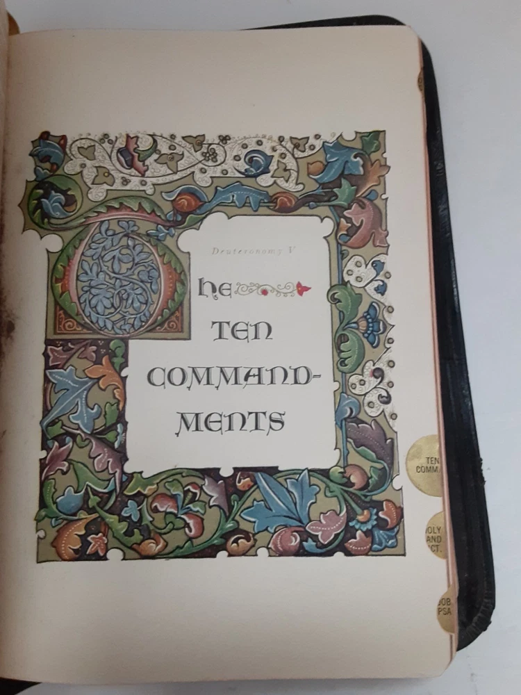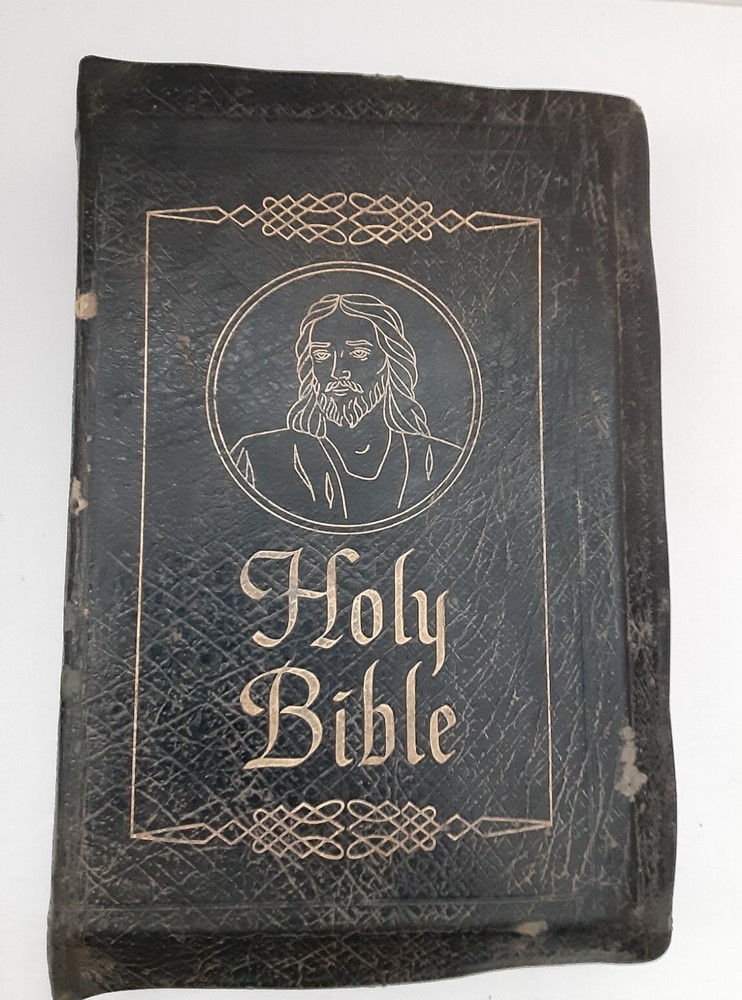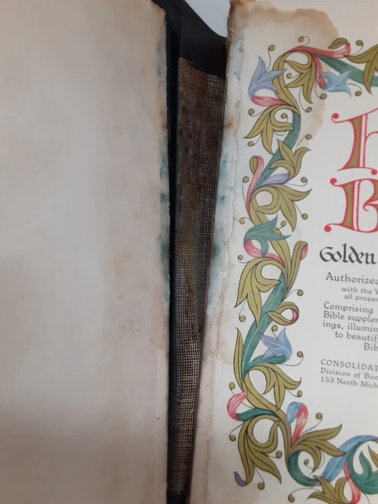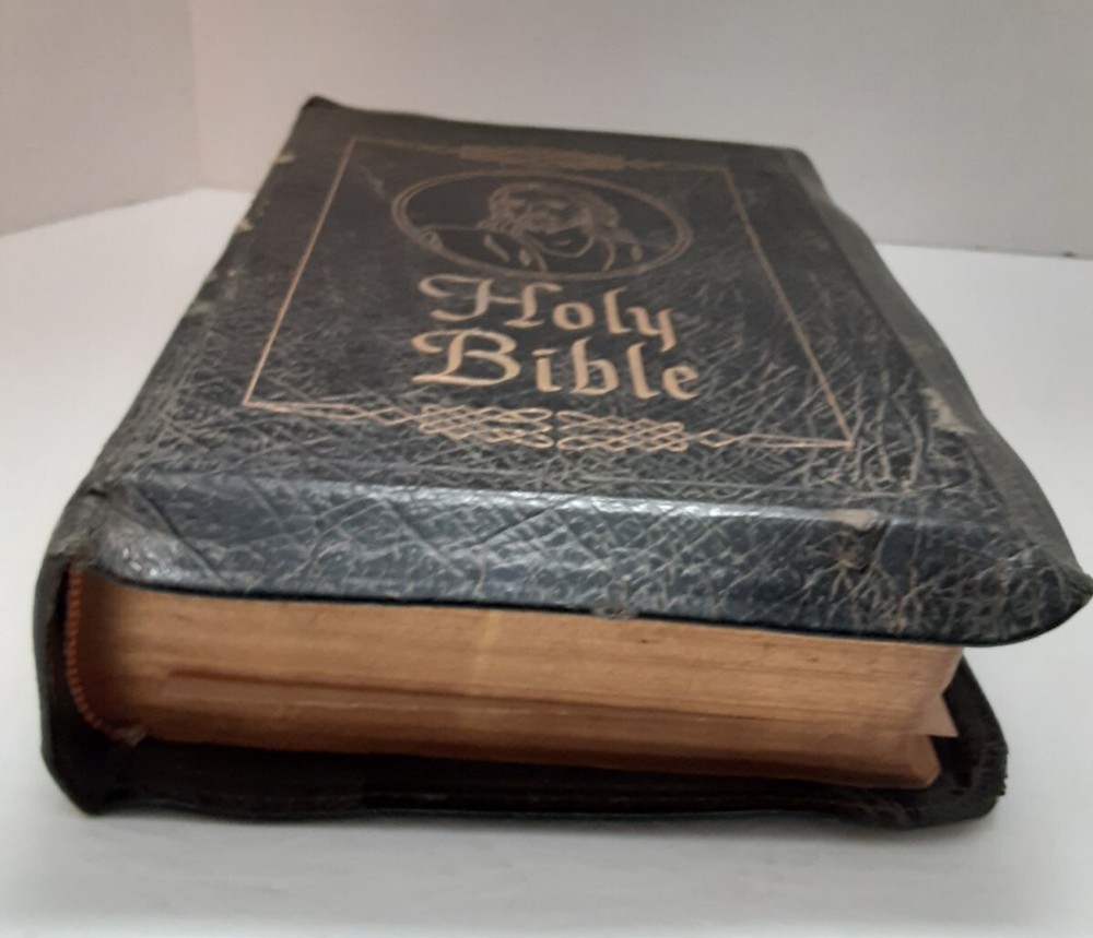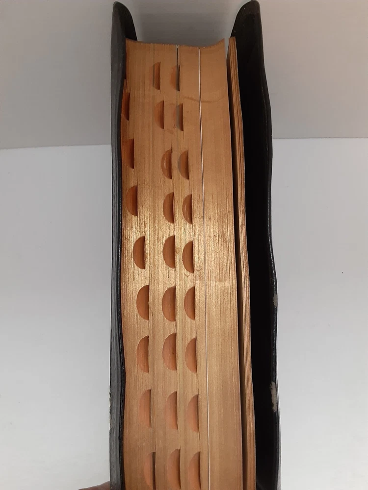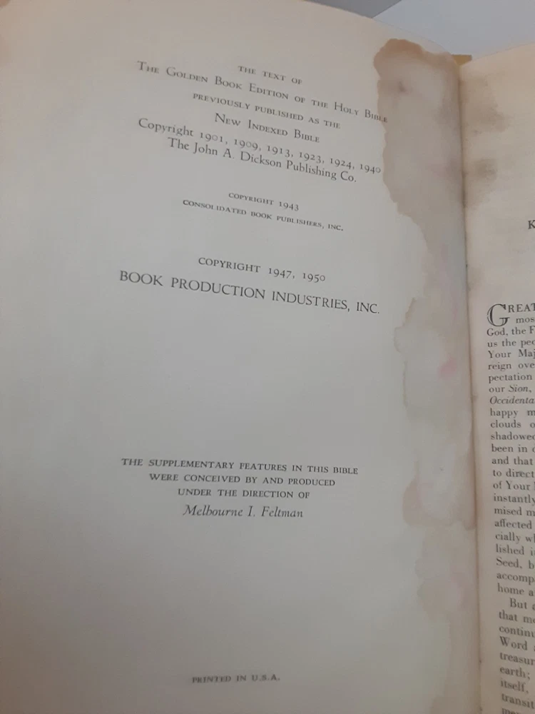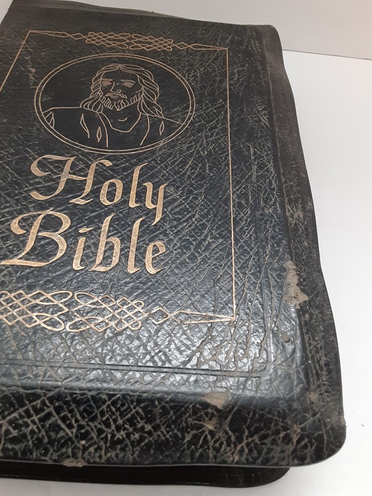 This vintage book is a must-have for anyone interested in the life of Jesus. Its leather-bound cover is adorned with gold edging, making it a beautiful addition to any collection. The book contains maps and illustrations, and is part of the Golden Book Edition series. Published in 1950 by Division of Book Production Industries, this book is in acceptable condition, with some wear and tear due to its age. Its dimensions are 6.75” length x 10” height x 2.25” width, and it weighs approximately 4.5 lbs. This book is in English and was originally written in English. It is an ex-library item with an ex libris stamp, but it has not been personalized. This book is intended for young adults, ages 9-12, and adults who are interested in the subject of religion. This Bible has some water staining on the inside as well as the outside of the binding is pulling away from the pages. No missing pages and no writing. This is still very legible.