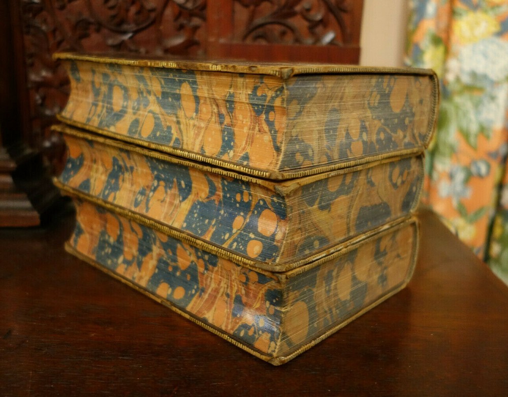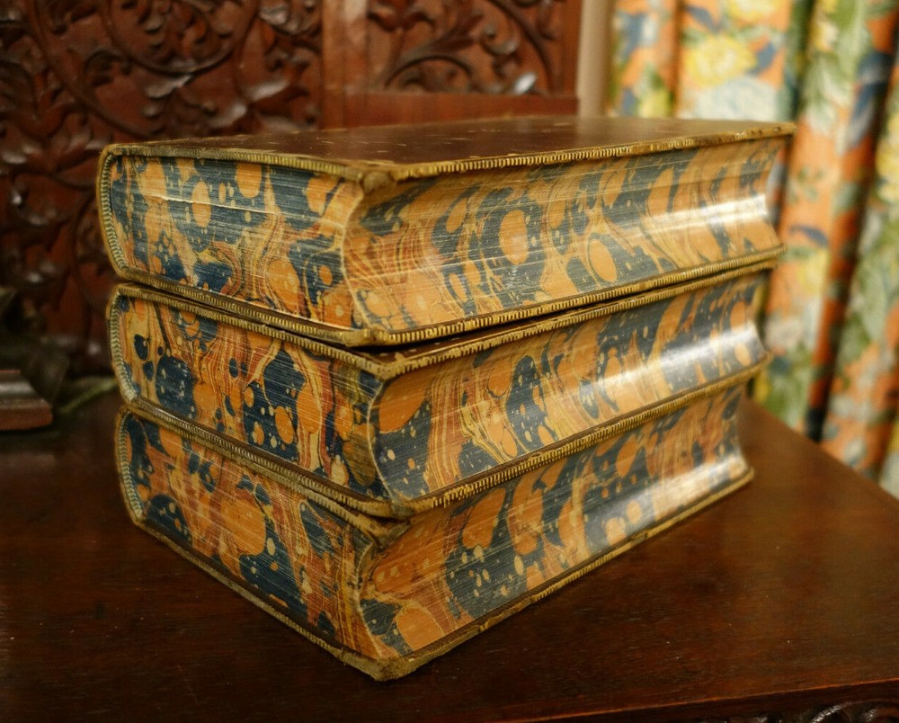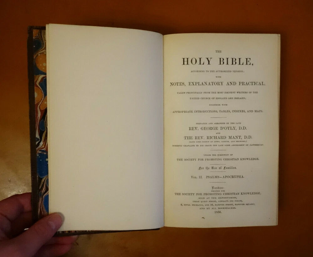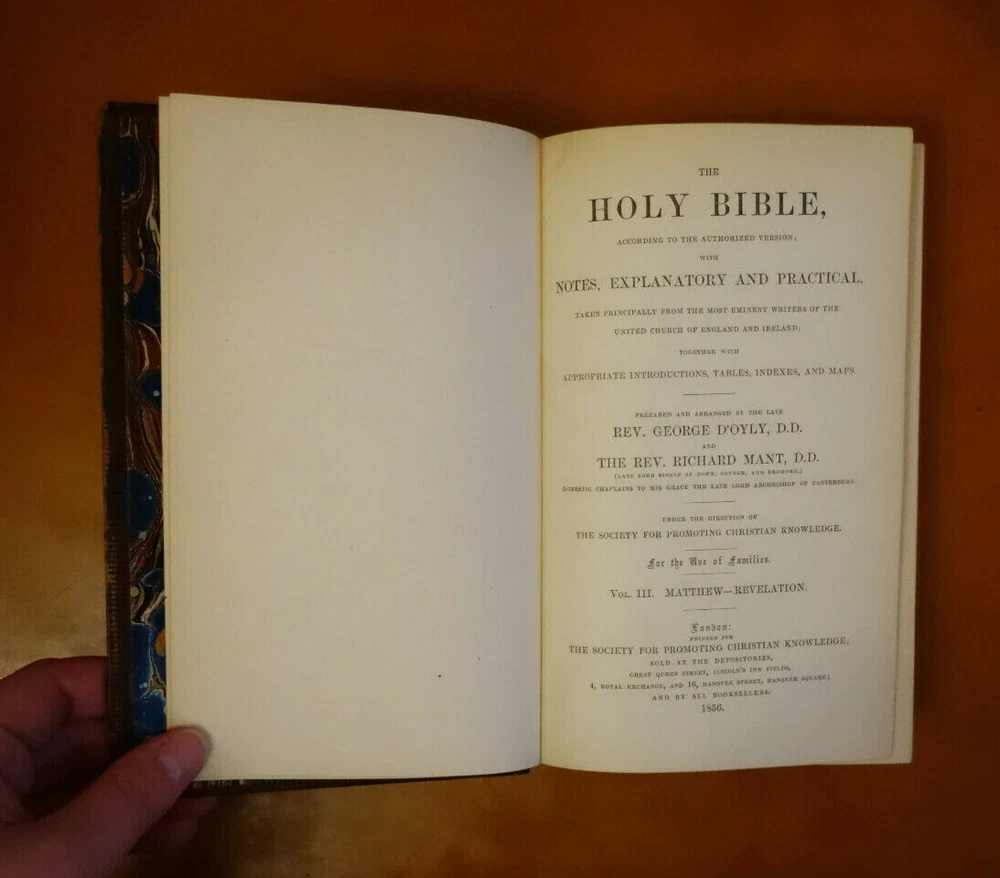 The Holy Bible in 3 volumes prepared and arranged by Rev. George D'oyly, D. D. & Rev Richard Mant, D. D. Printed in 1856. Beautiful marbled page ends and endsheets. Fold out maps. Leather covers have some damage. Pages are in great condition. Tight binding.