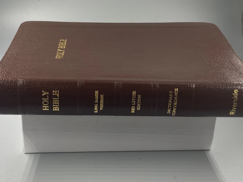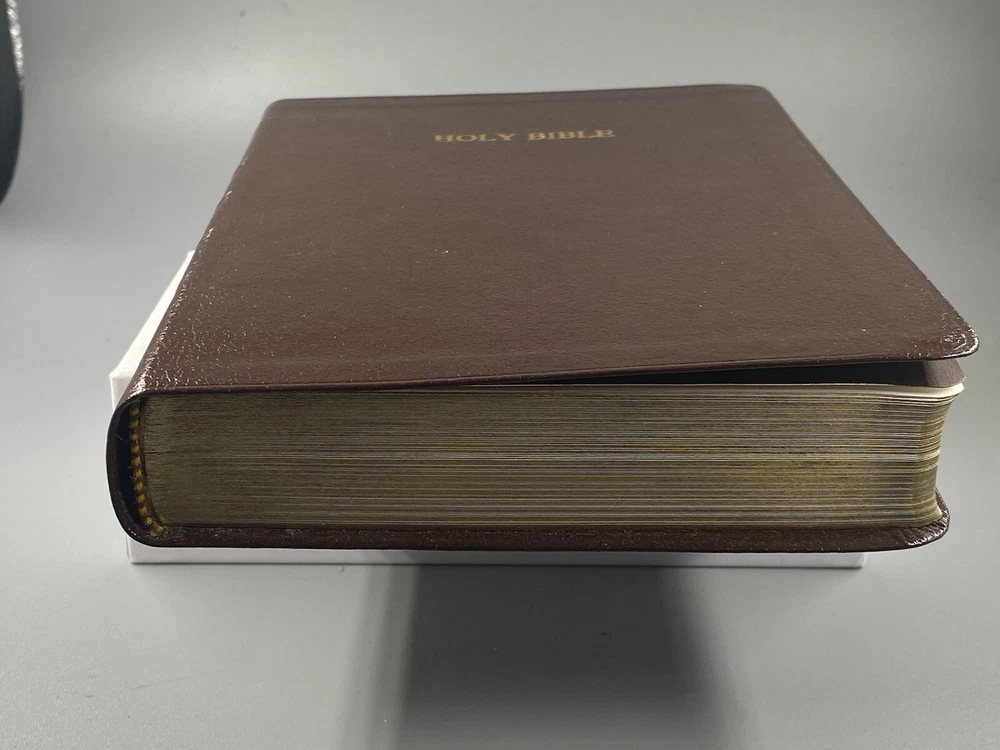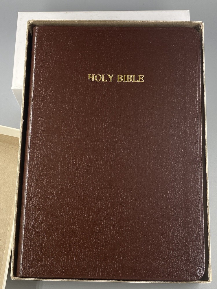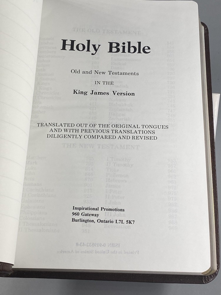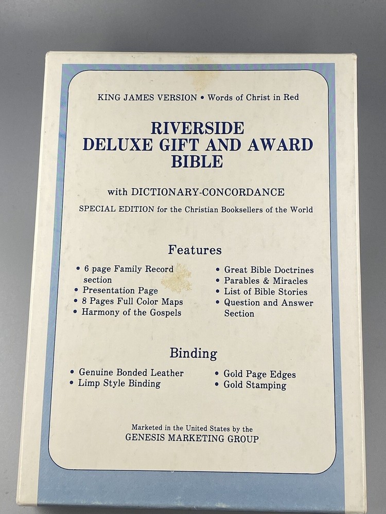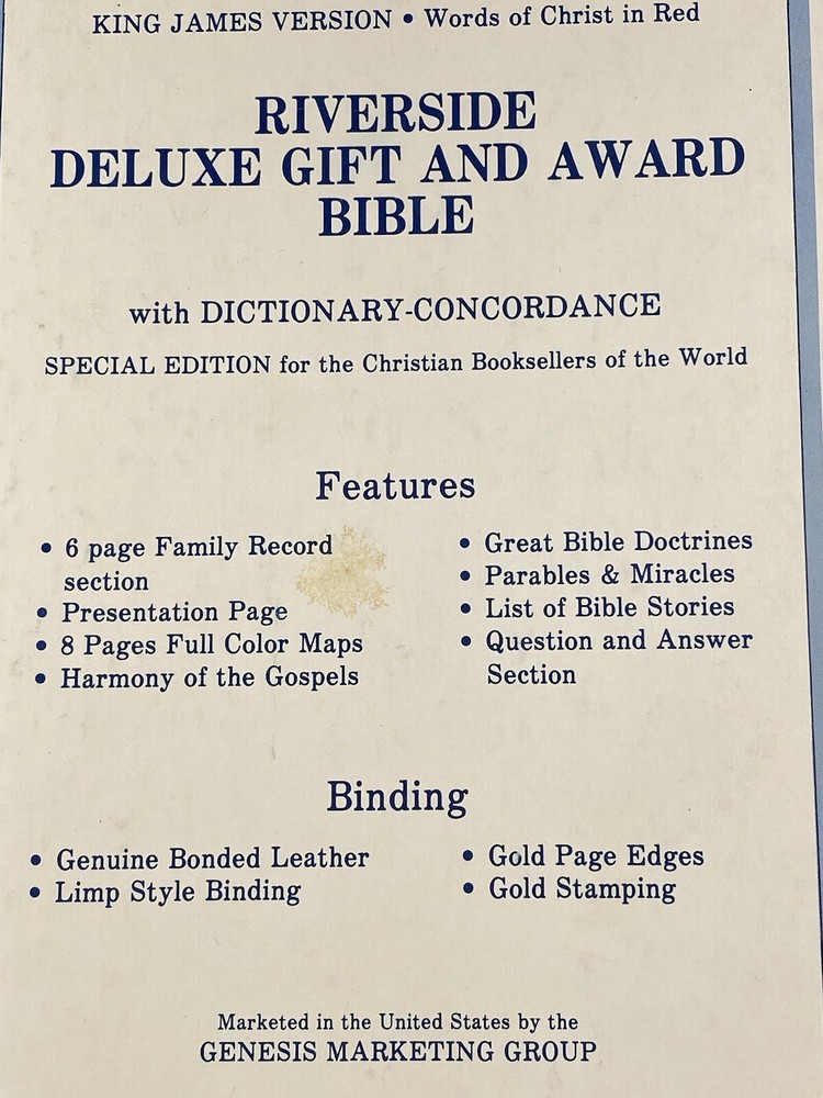 The product is a deluxe gift edition of the Holy Bible in King James Version. It features a leather binding and includes a dictionary and a map. The Bible is focused on Christianity and is categorized as an antiquarian and collectible book.