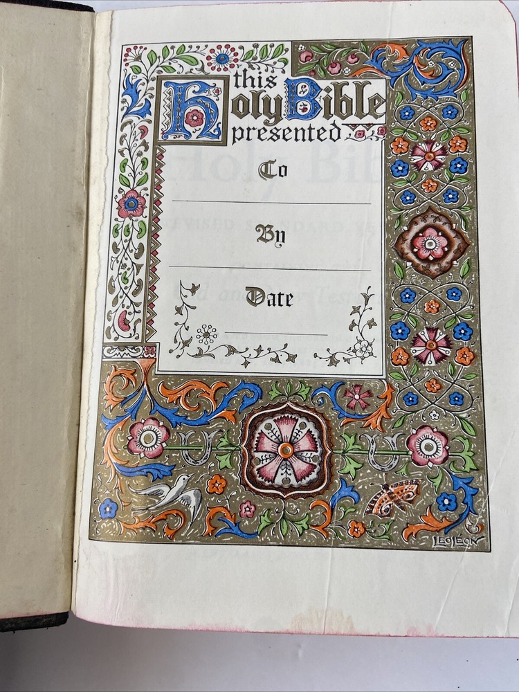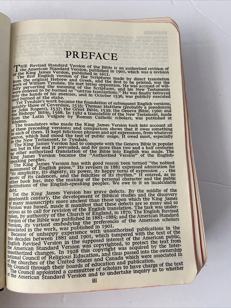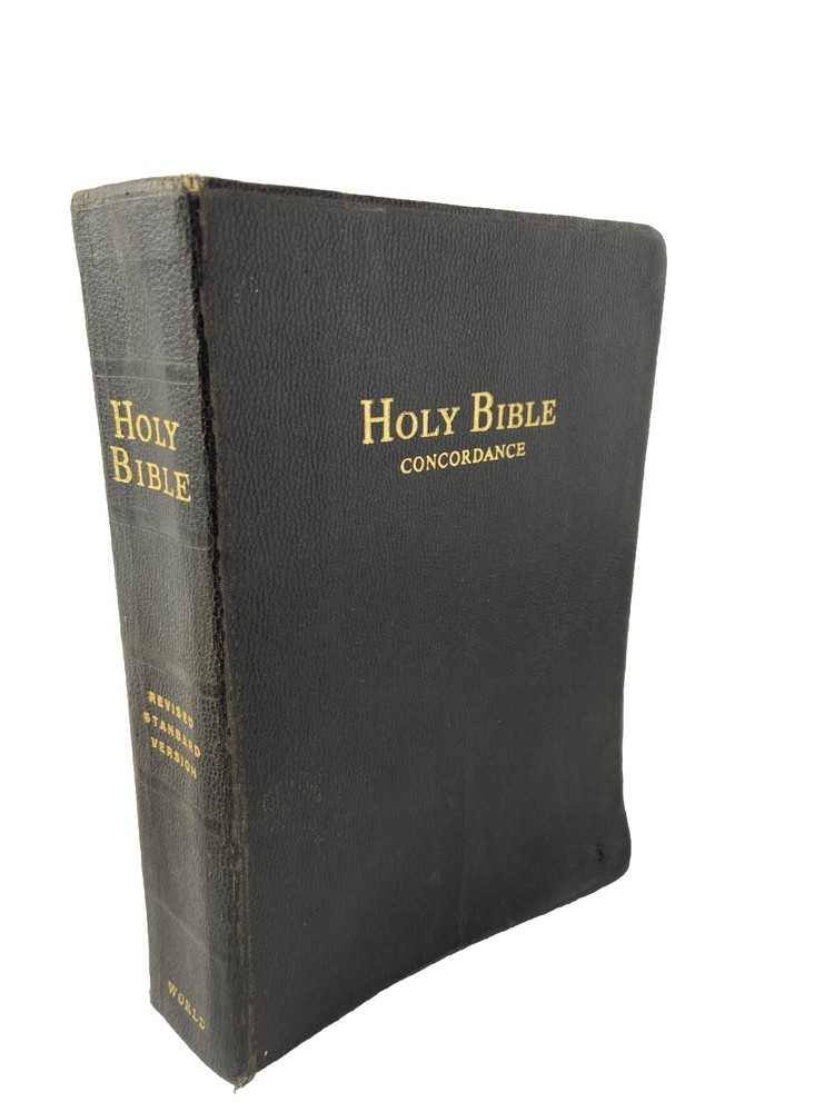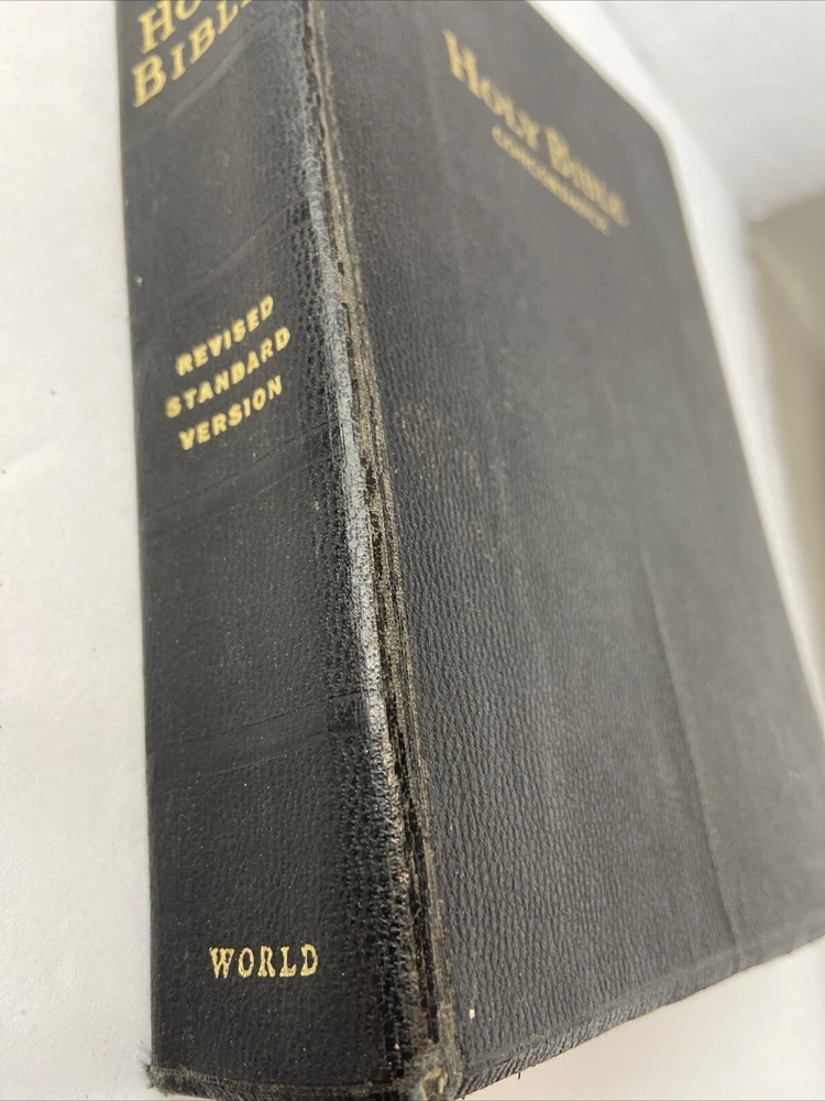 The product is "The Holy Bible RSV" Revised Standard version published by World Publishing in 1962. It is a leather-bound Bible with features such as color maps, concordance, family history dedication pages, and illustrations. The book is in English, intended for young adults and adults, focusing on topics like the Bible, Christianity, and Jesus Christ. It is part of the Holy Bible series with an edition including a concordance and is a vintage item from the 1960s.